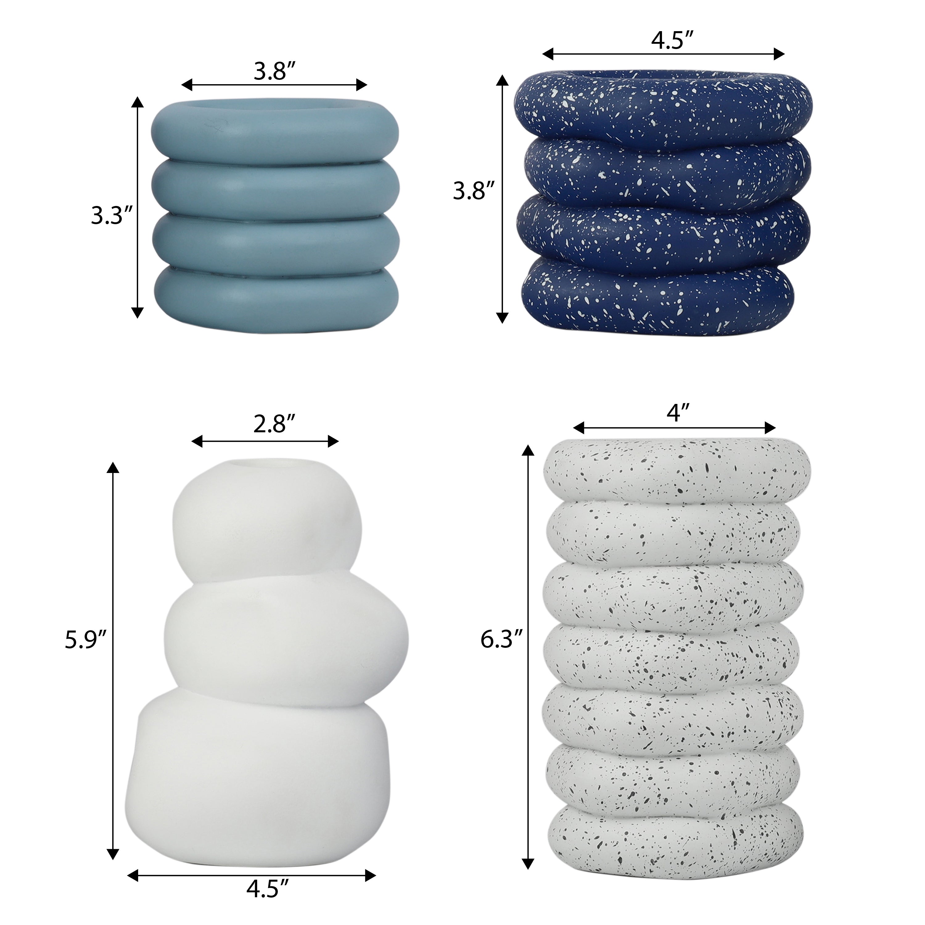 • Product Measurement: 1. 4"W x 4"D x 6.3"H, 2. 4.5"W x 4.5"D x 5.9"H, 3. 4.5"W x 4.5"D x 3.8"H, 4. 3.8"W x 3.8"D x 3.3"H