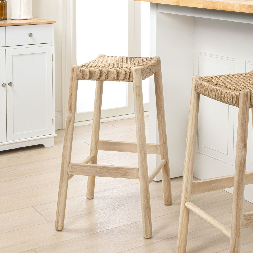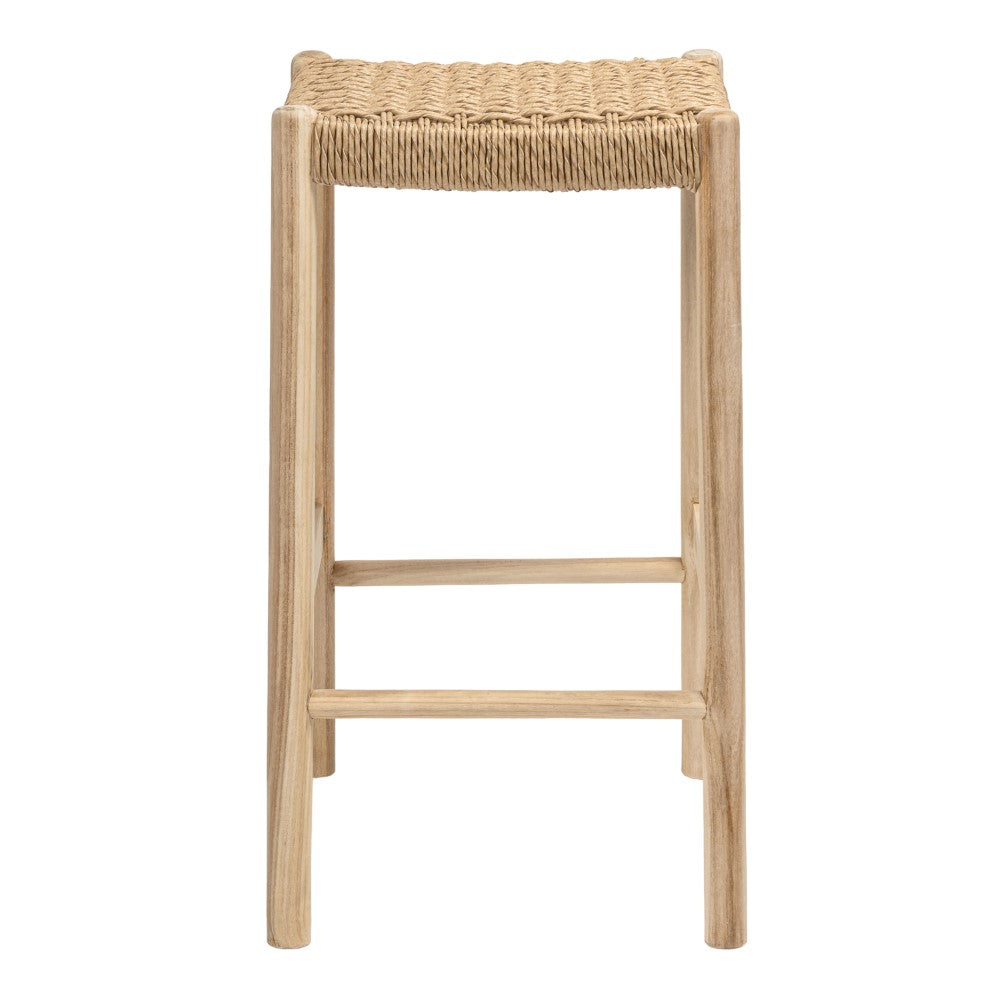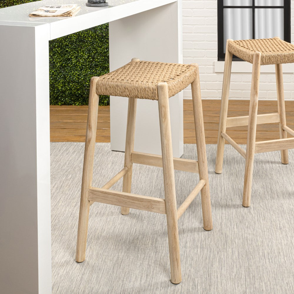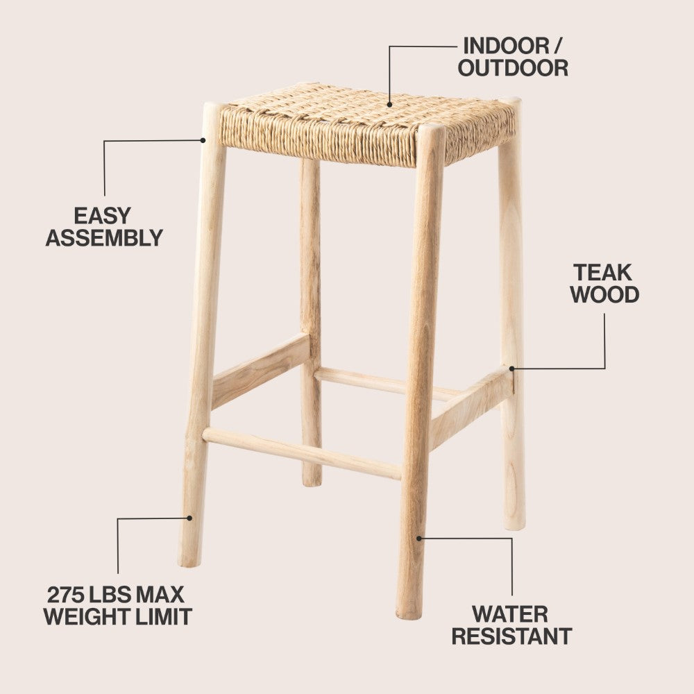 Elvora 29.5" Coastal Casual Handcrafted Teak Wood Backless Indoor/Outdoor Bar Stool with Synthetic Woven Seat