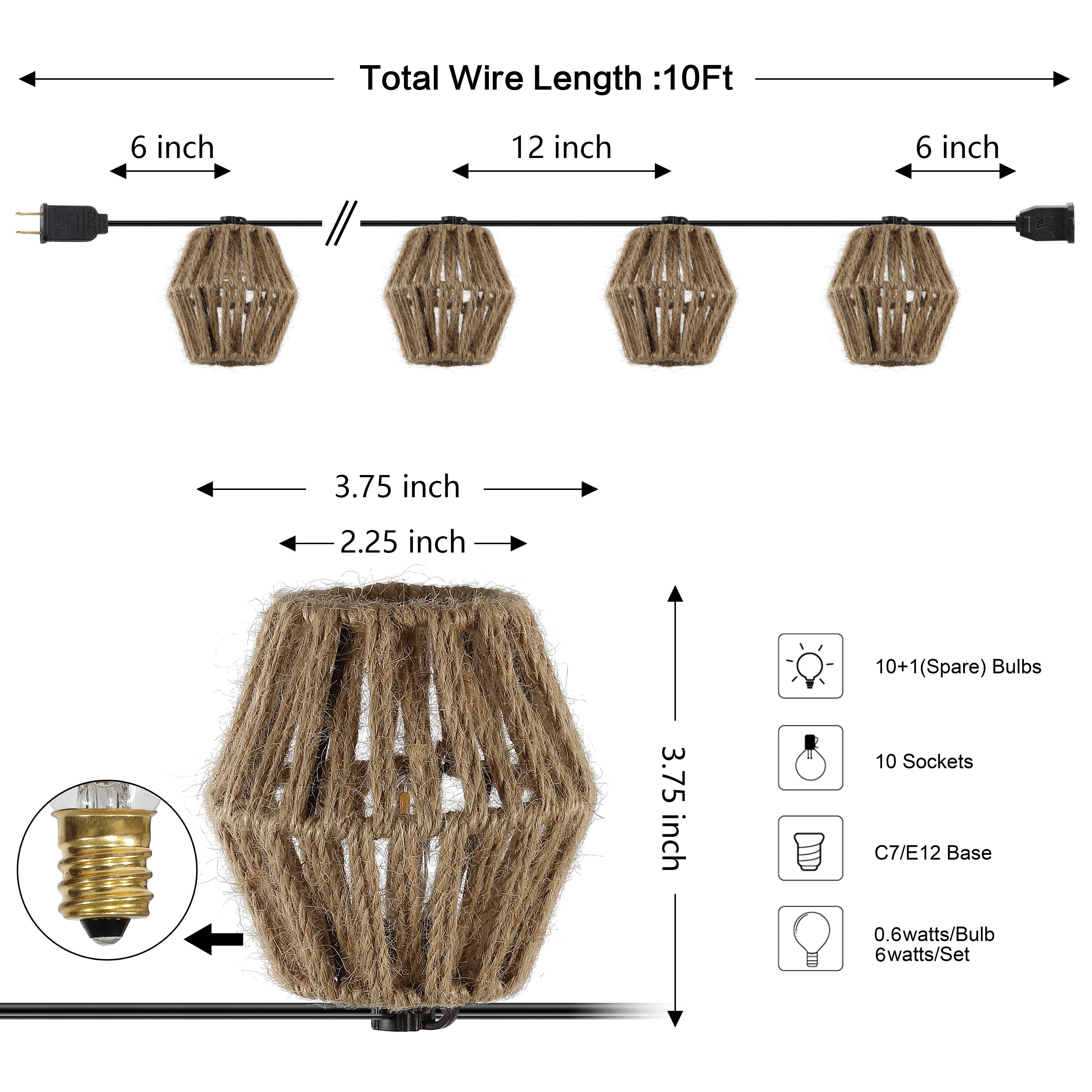 Decorative 10-Light Indoor/Outdoor 10 ft. Mid-Century Classic Incandescent C7 Lantern Hemp Rope Shaded String Lights
