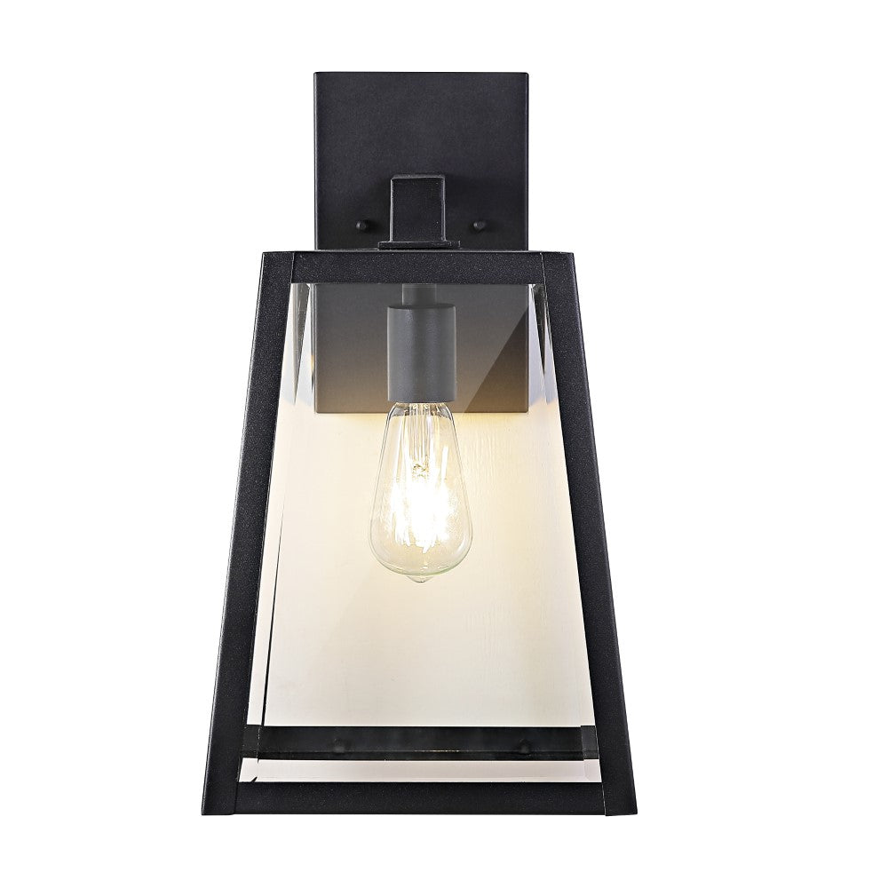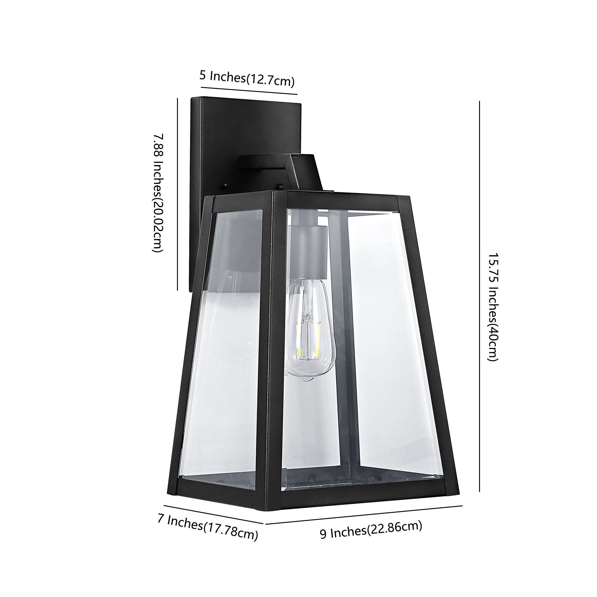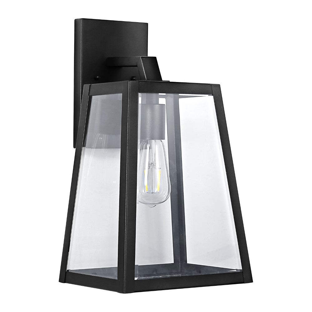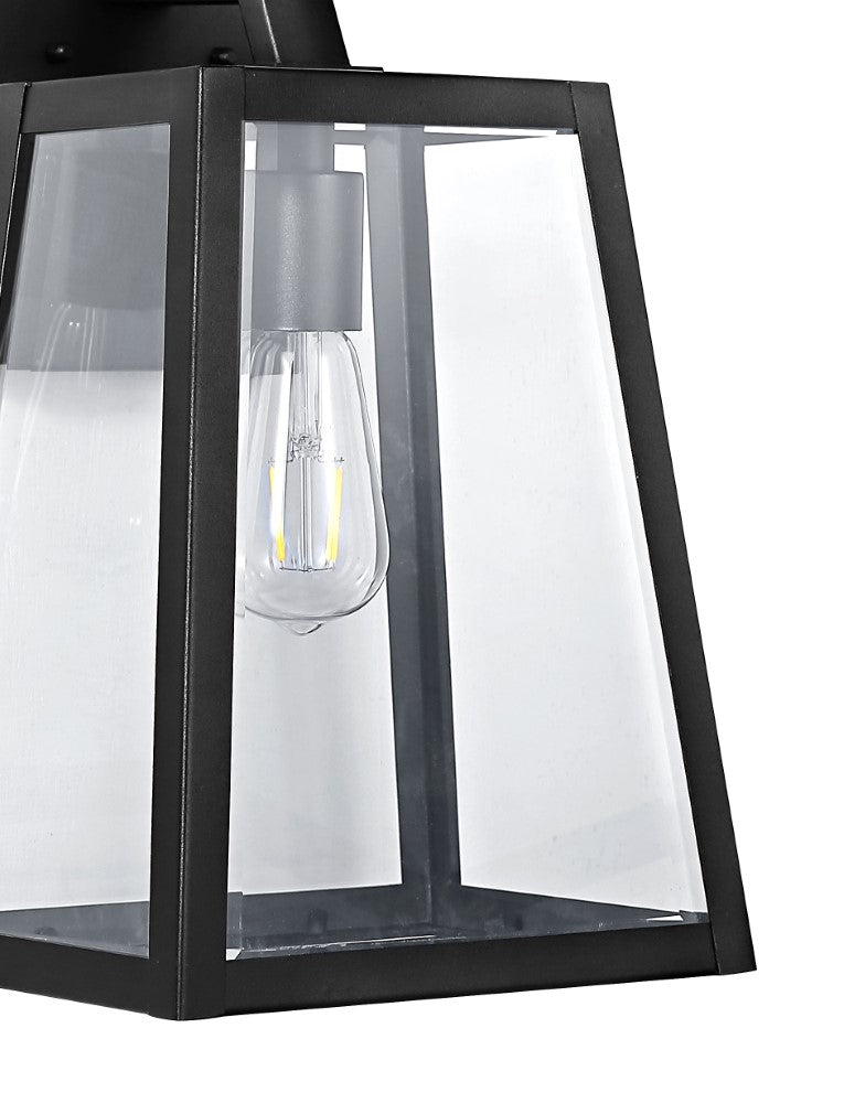 With its clean lines and angled design, this lantern-style wall light has modern, minimalist style. A sturdy backplate supports the frame from the top, and glass panels protect the Edison-style LED bulb. Use a pair to flank a front door or light up the garage door. The black iron finish is perfect for a traditional or rustic home.