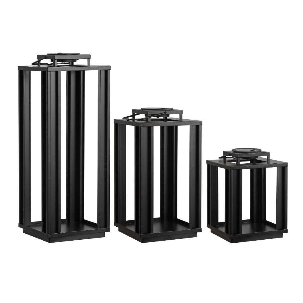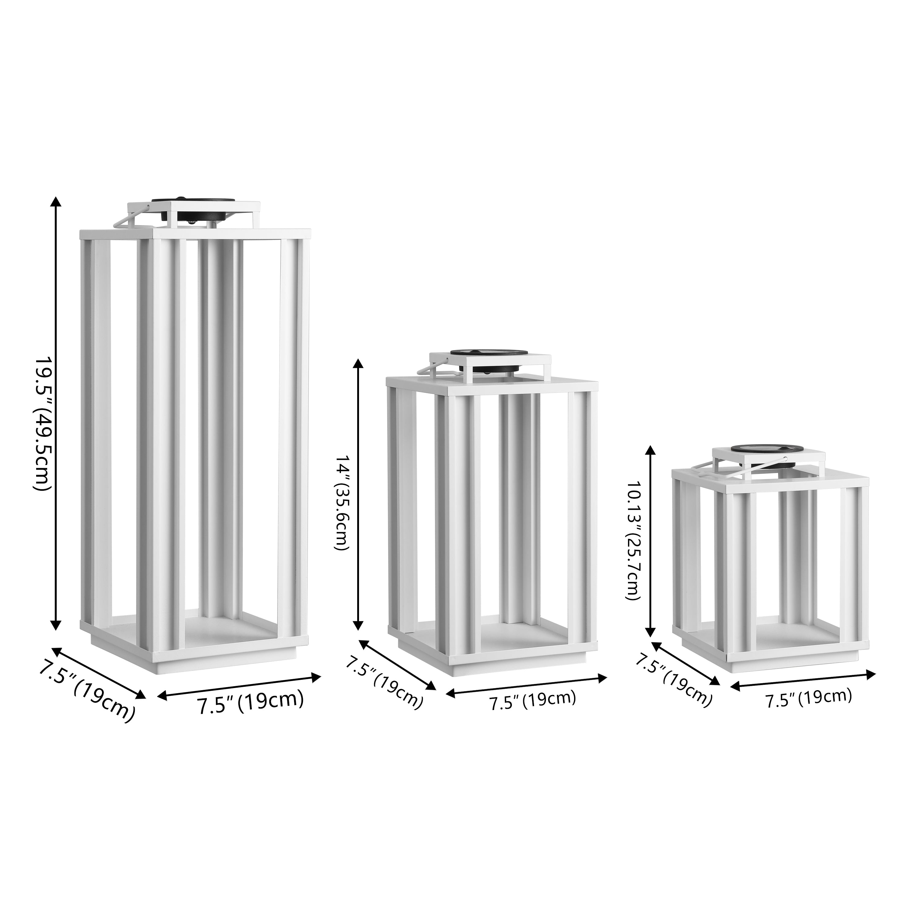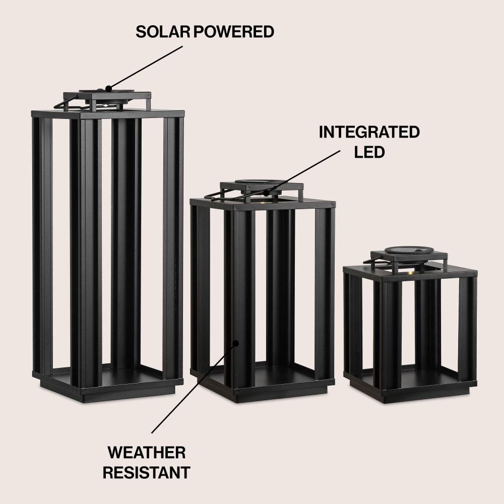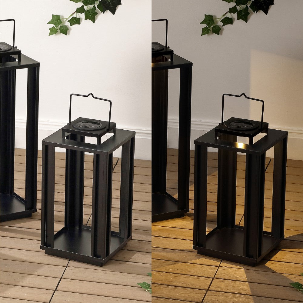 Light up the garden, pathways or even a special event with these modern solar lanterns. Set of 3 lanterns have metal frames and a solar cell on the top of each one. The tall, square design adds industrial flair to any space.
