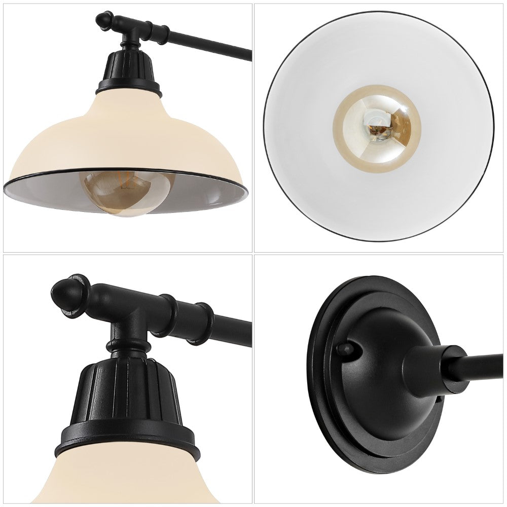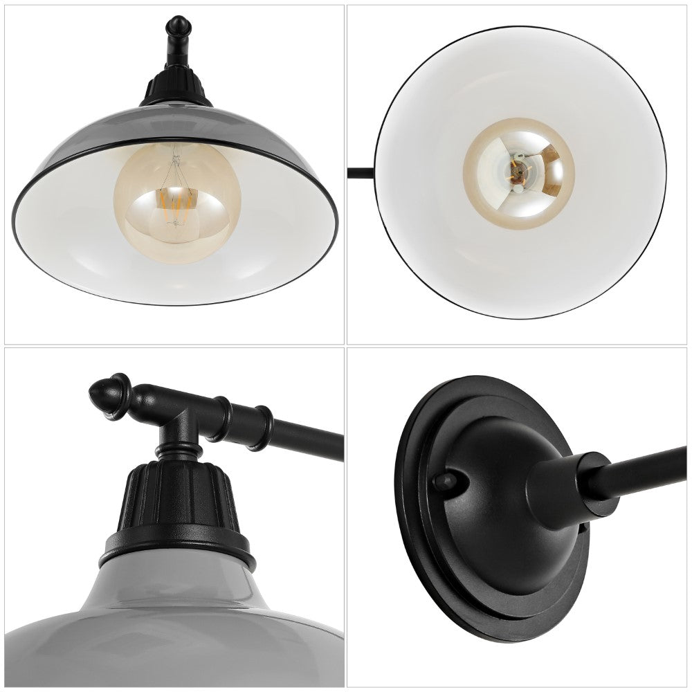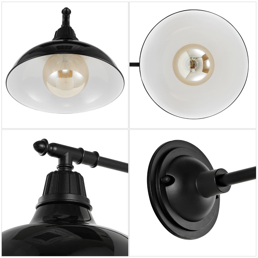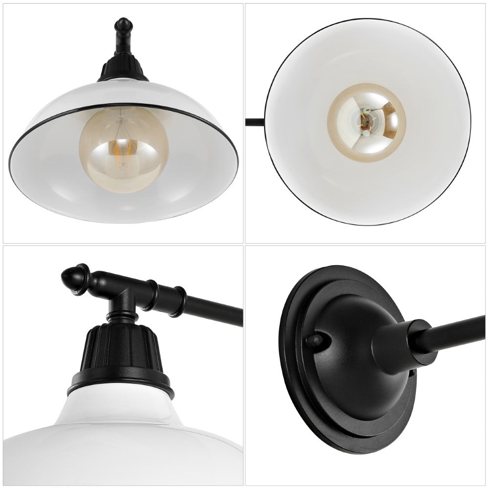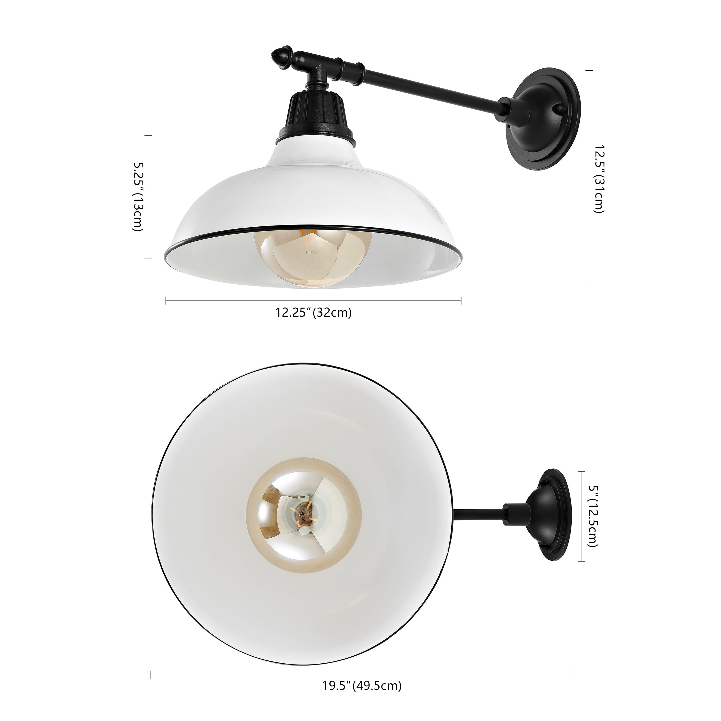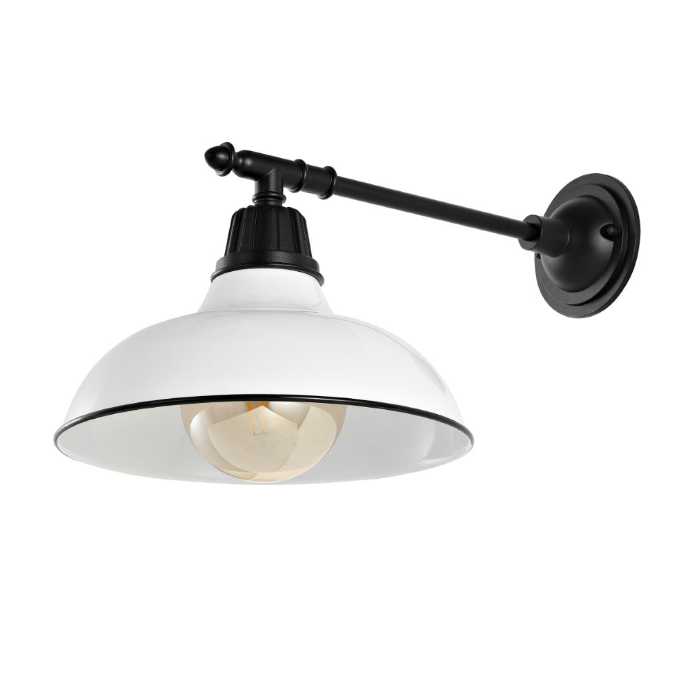 - This two-tone wall light has a black straight bracket and a wide metal shade in classic white and black