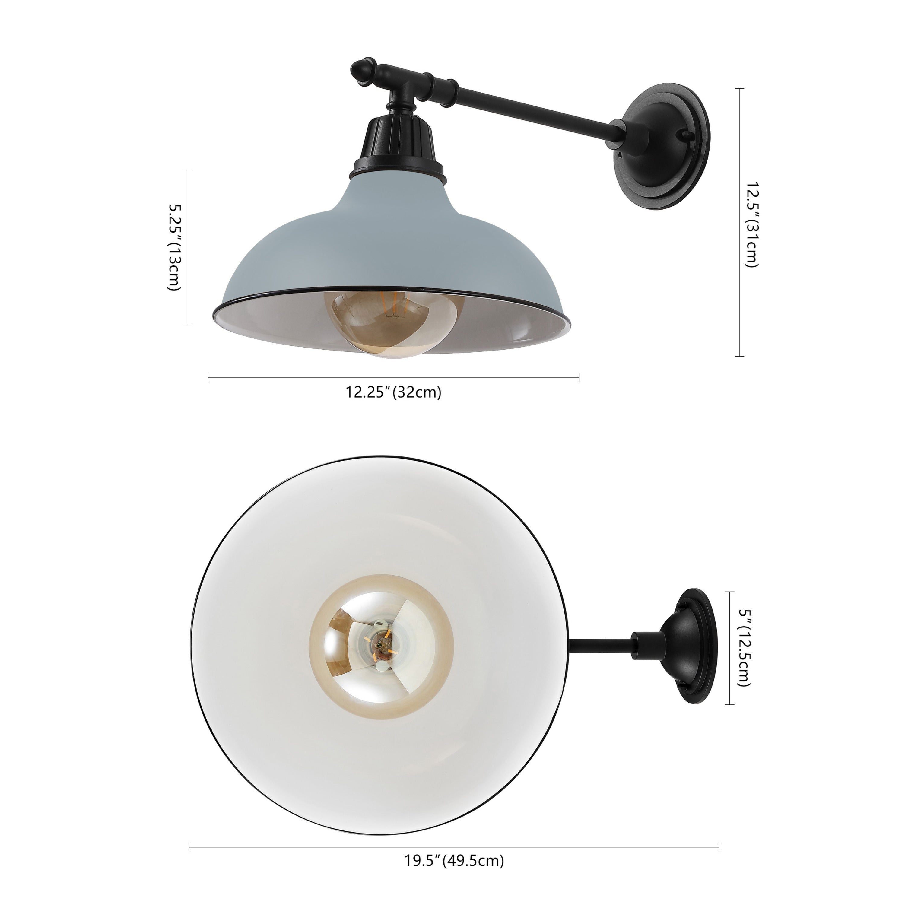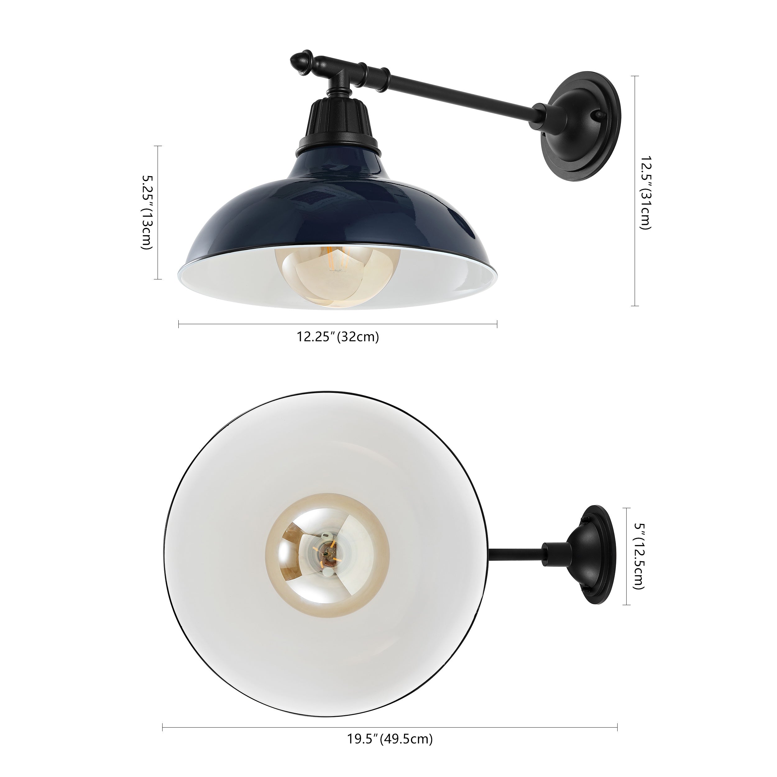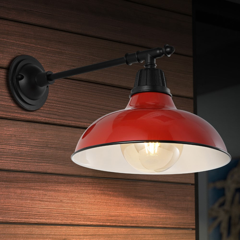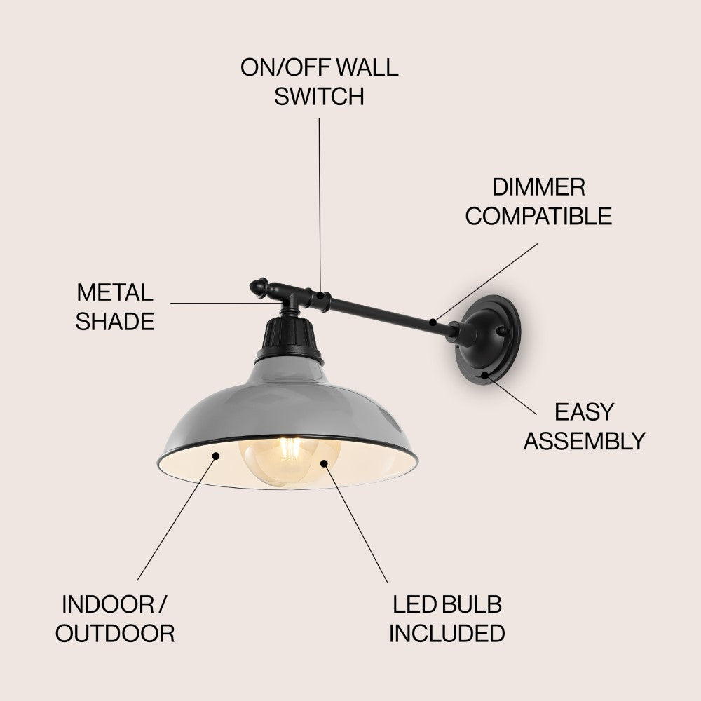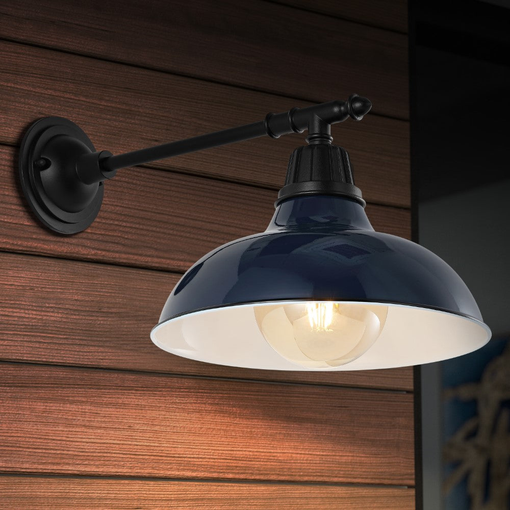 Our vintage style metal wall light adds an industrial touch to any farmhouse design. The warm globe LED bulb has a painted shade mounted on a straight bracket. This outdoor light fixture can be used indoors as well, for residential and hospitality projects.