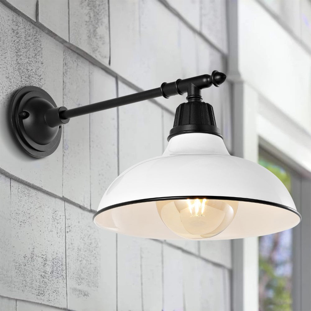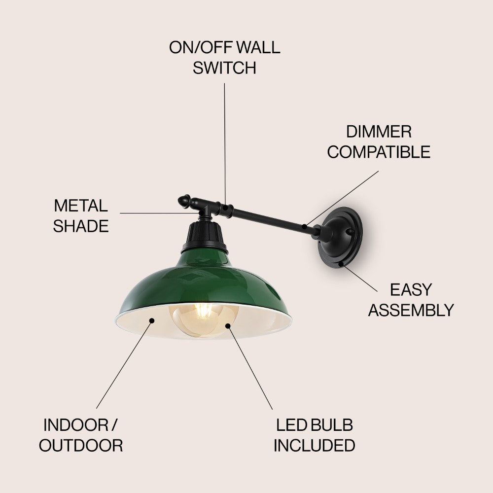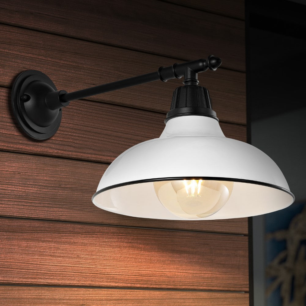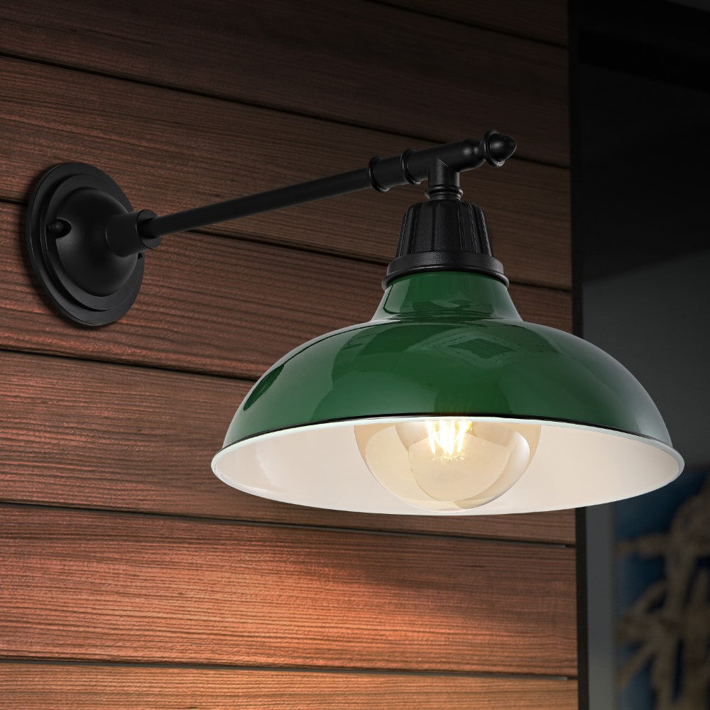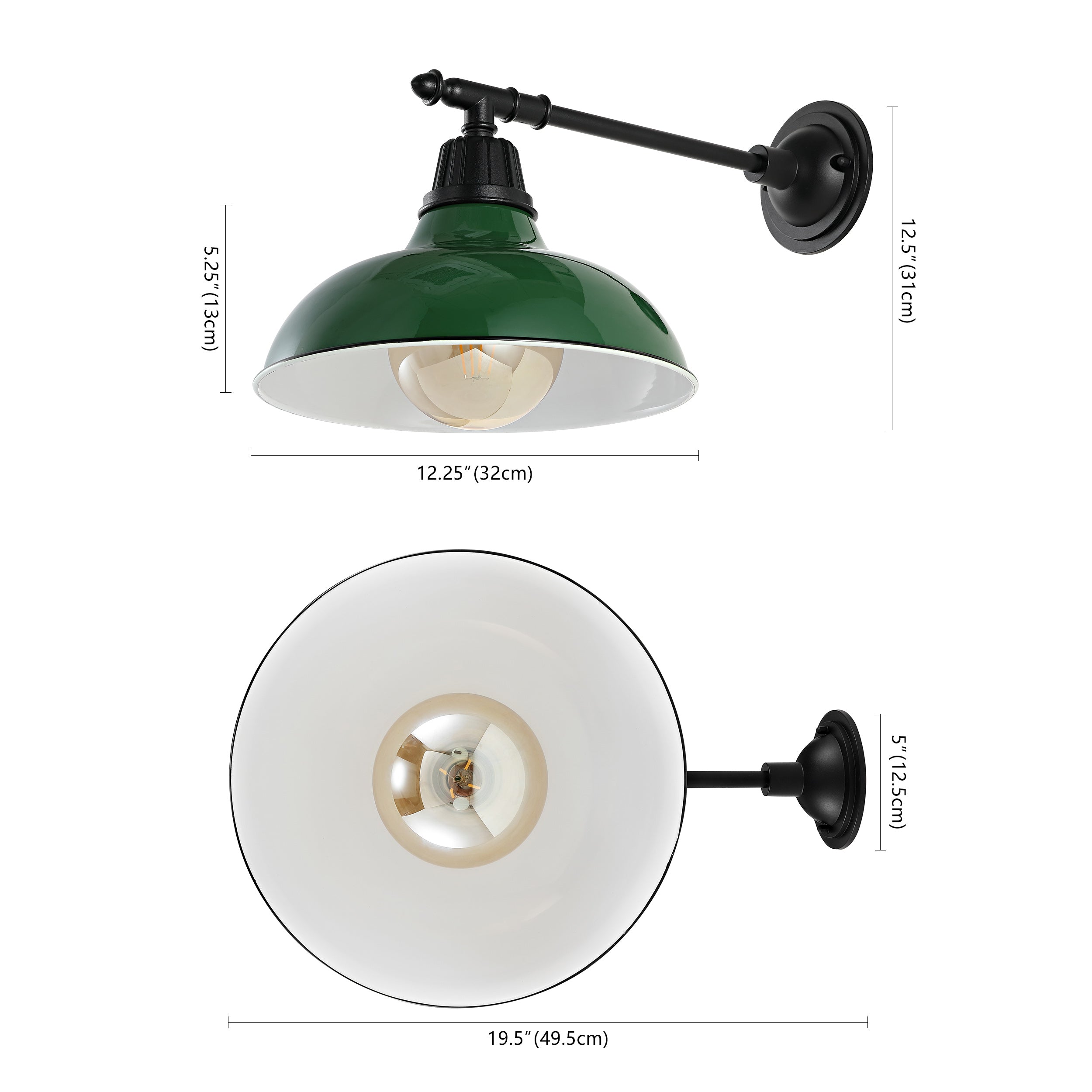 Our vintage style metal wall light adds an industrial touch to any farmhouse design. The warm globe LED bulb has a painted shade mounted on a straight bracket. This outdoor light fixture can be used indoors as well, for residential and hospitality projects.