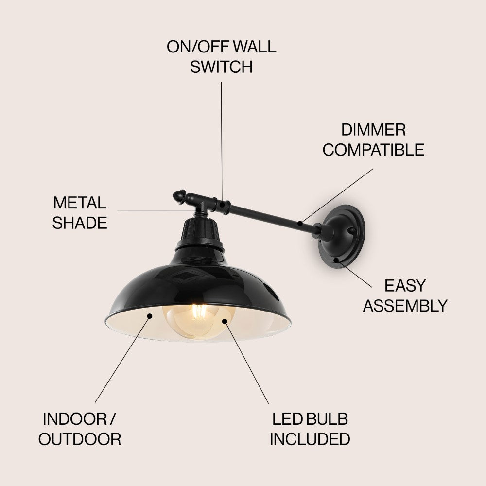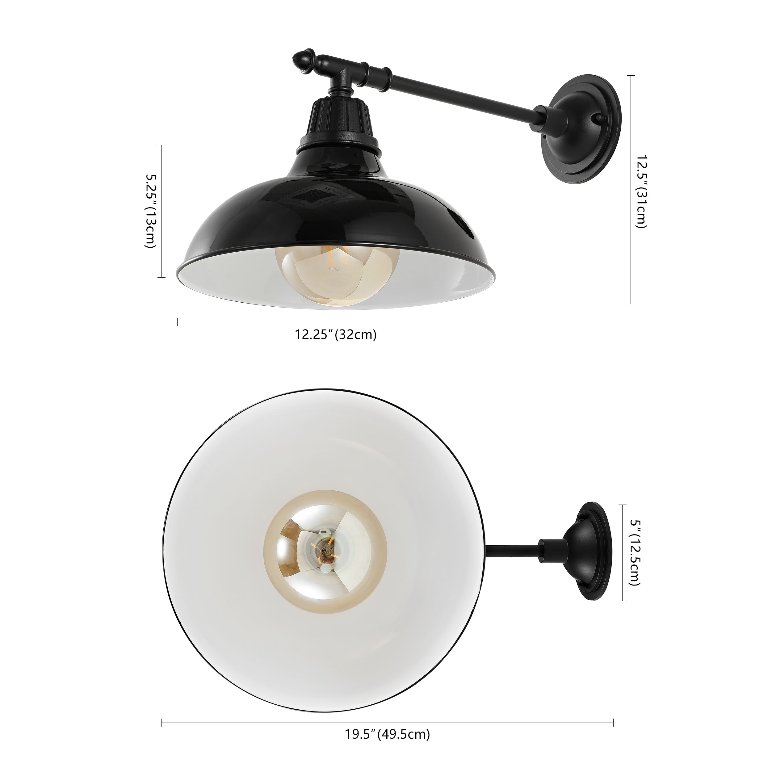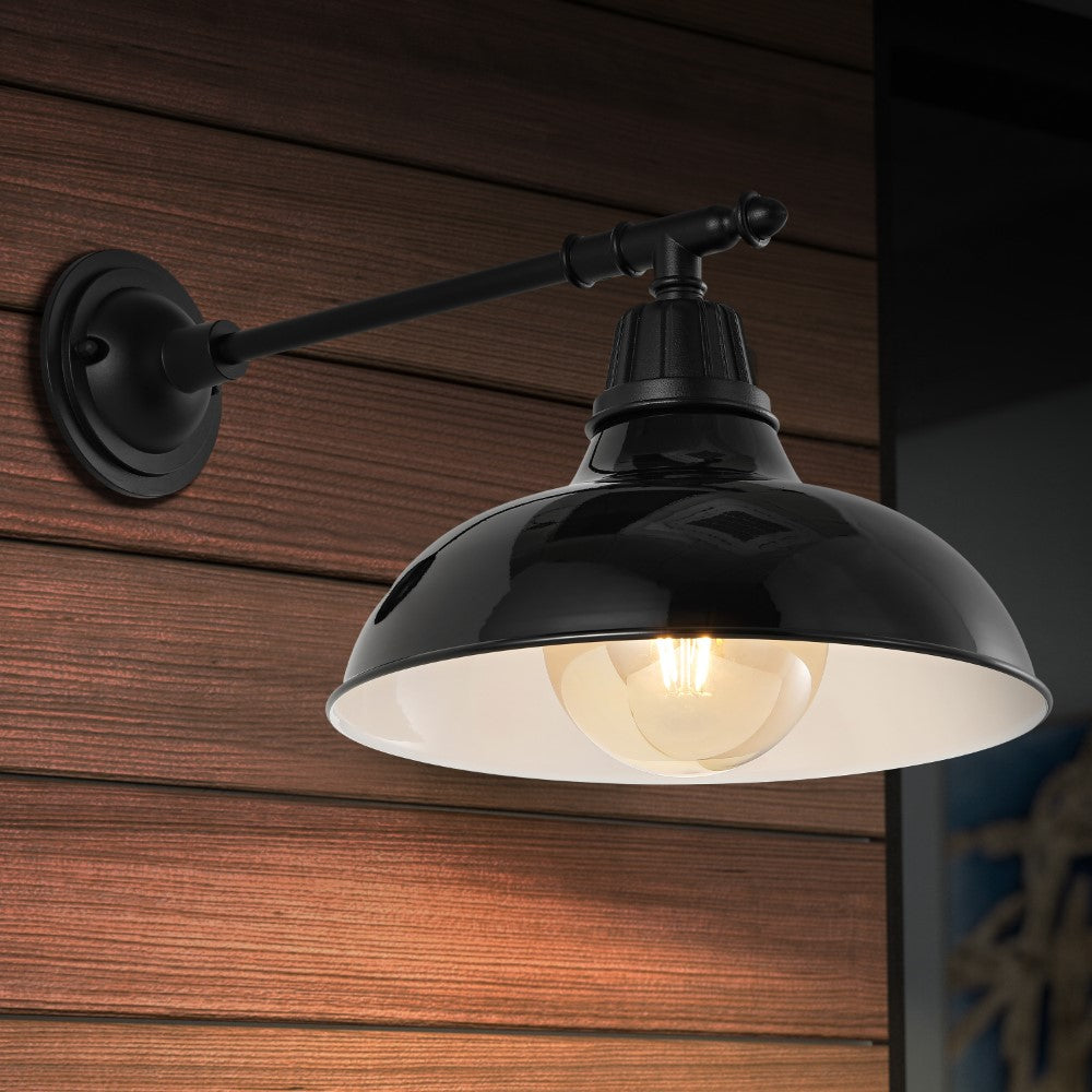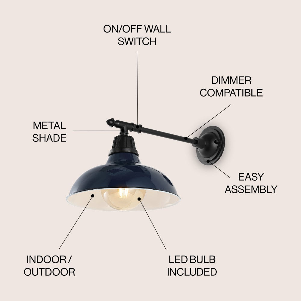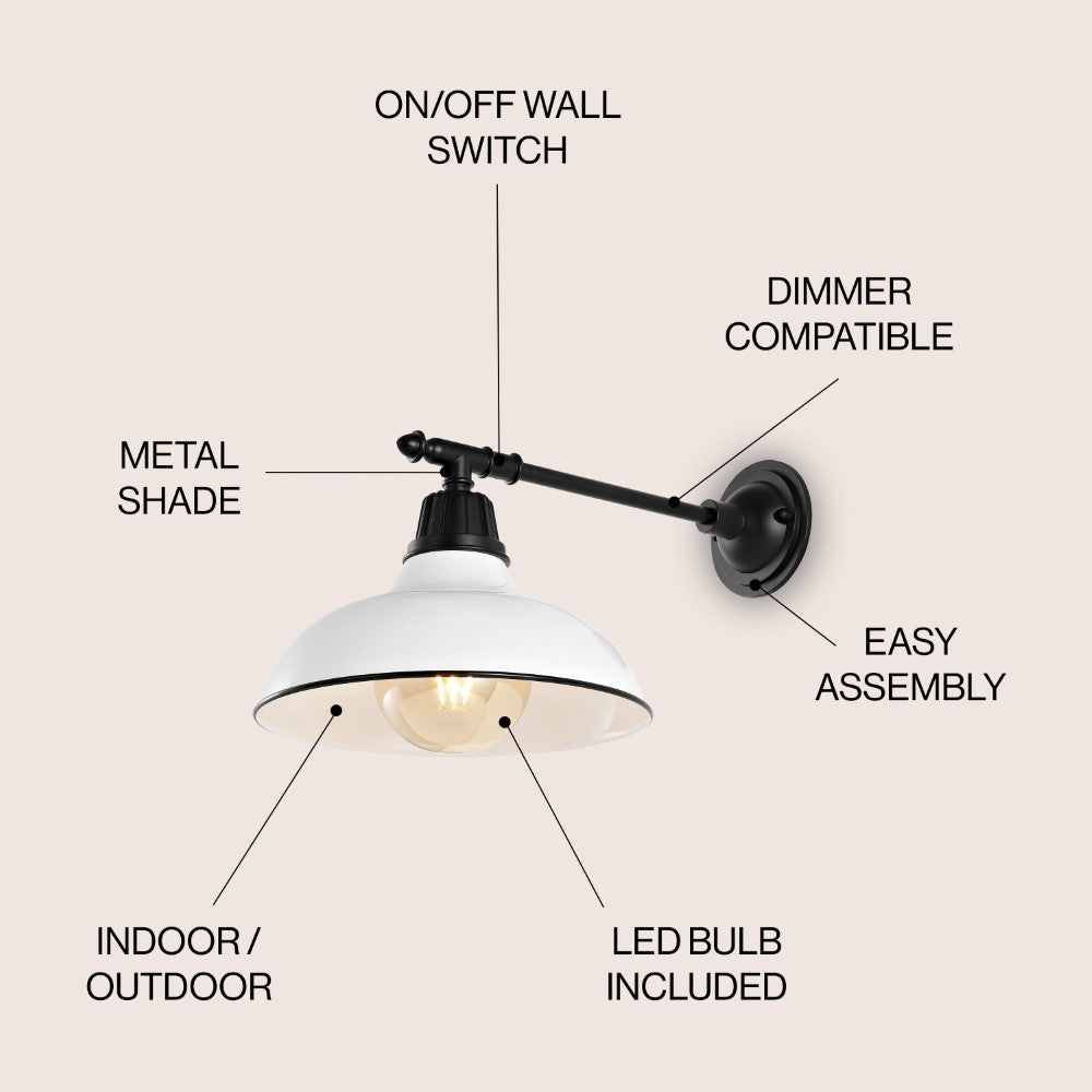 Our vintage style metal wall light adds an industrial touch to any farmhouse design. The warm globe LED bulb has a painted shade mounted on a straight bracket. This outdoor light fixture can be used indoors as well, for residential and hospitality projects.