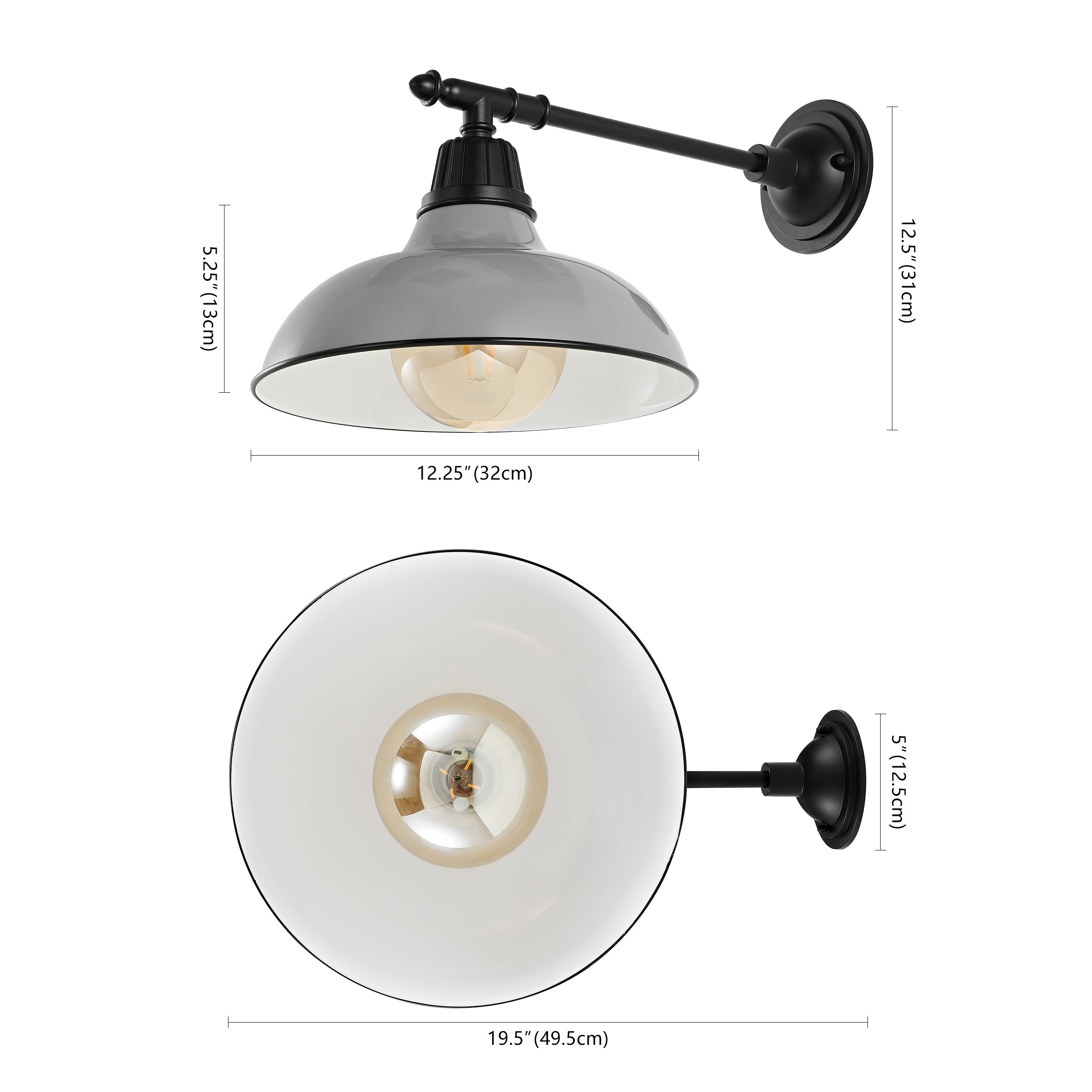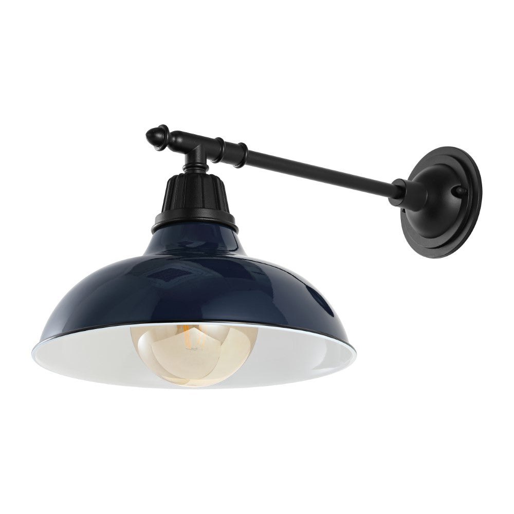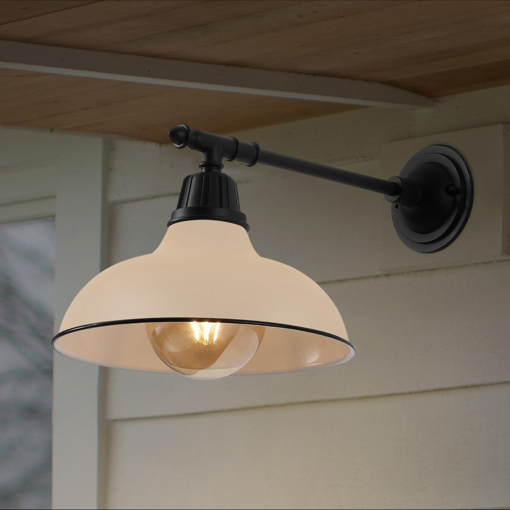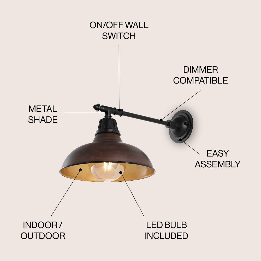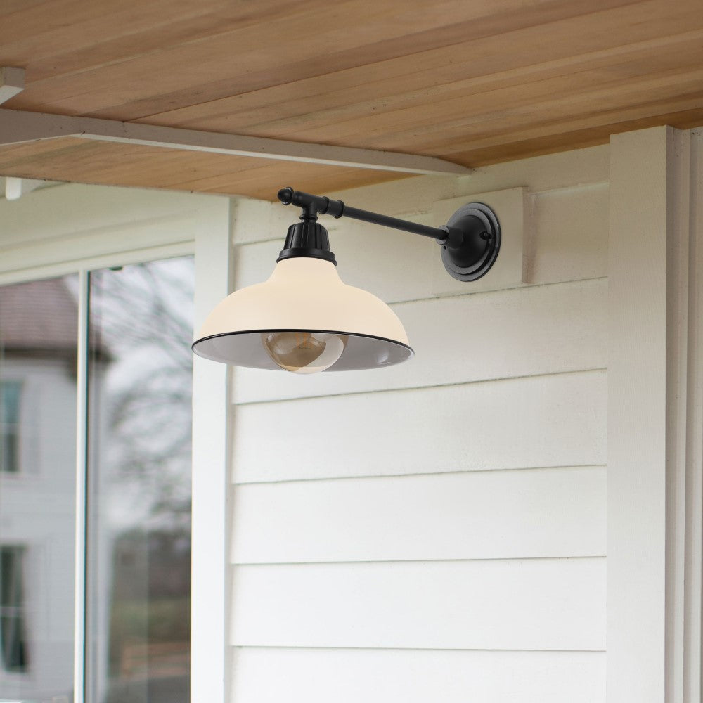 Our vintage style metal wall light adds an industrial touch to any farmhouse design. The warm globe LED bulb has a painted shade mounted on a straight bracket. This outdoor light fixture can be used indoors as well, for residential and hospitality projects.