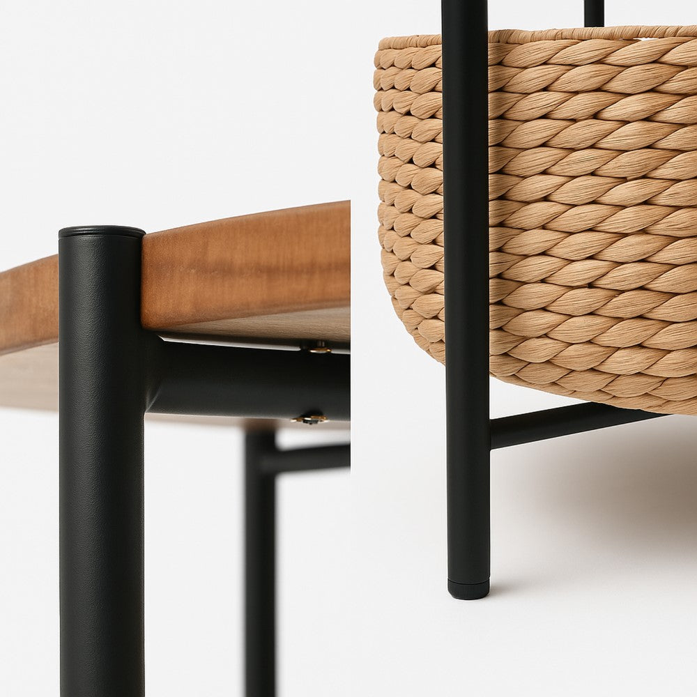 - Wooden top has a medium brown stain; basket is a natural straw color; black frame