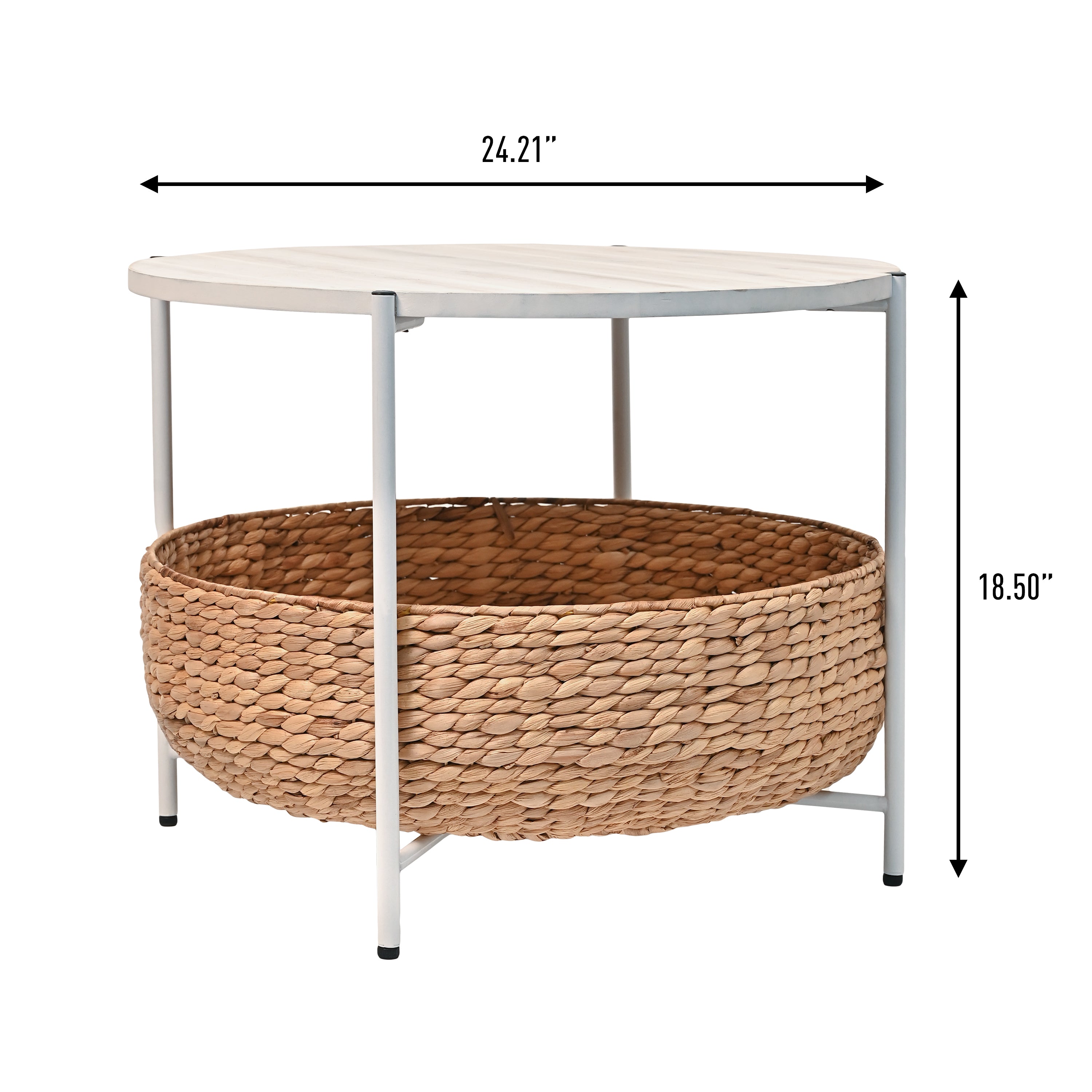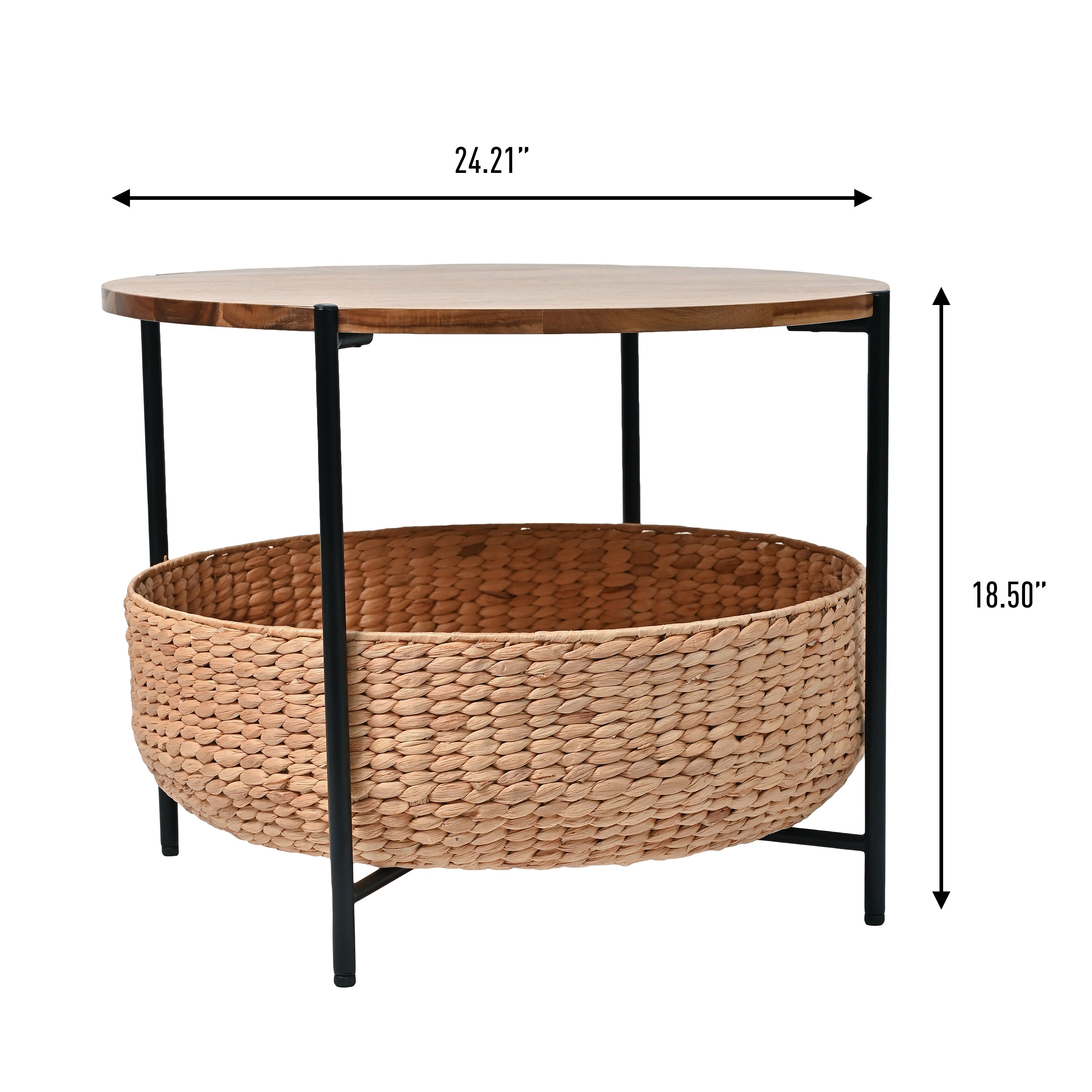 Carly 24.21" Modern Coastal Round Acacia Wood/Water Hyacinth Coffee Table with Storage Basket