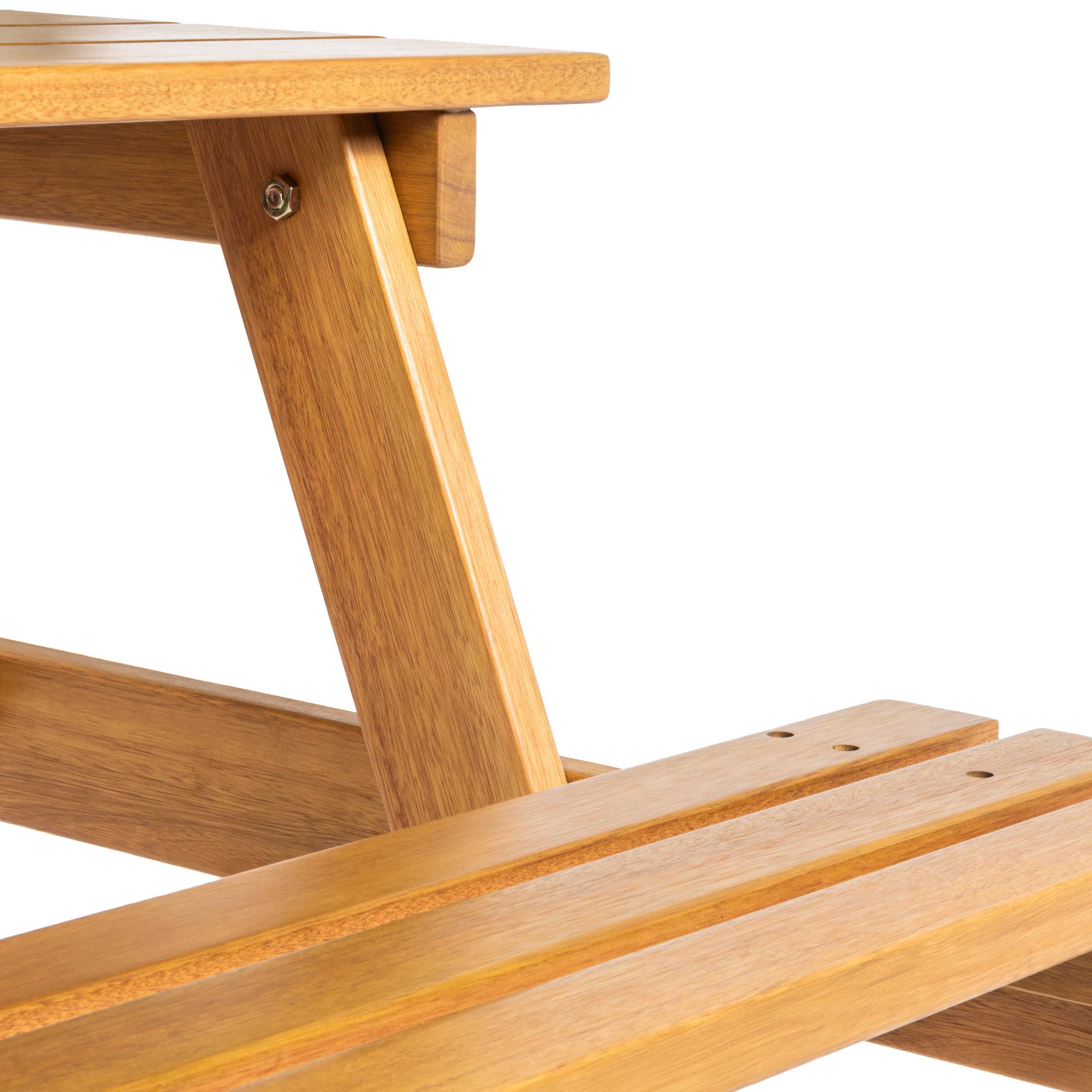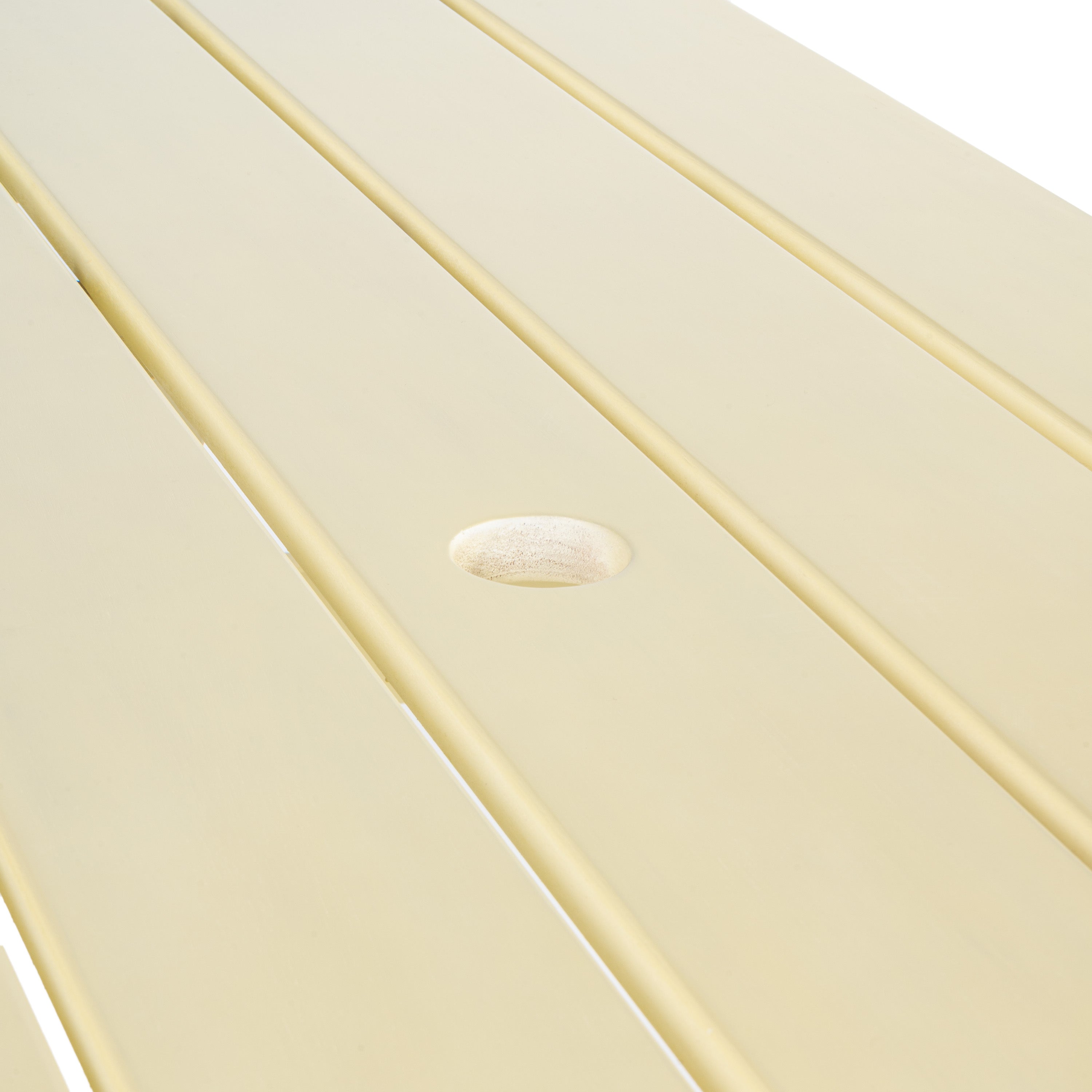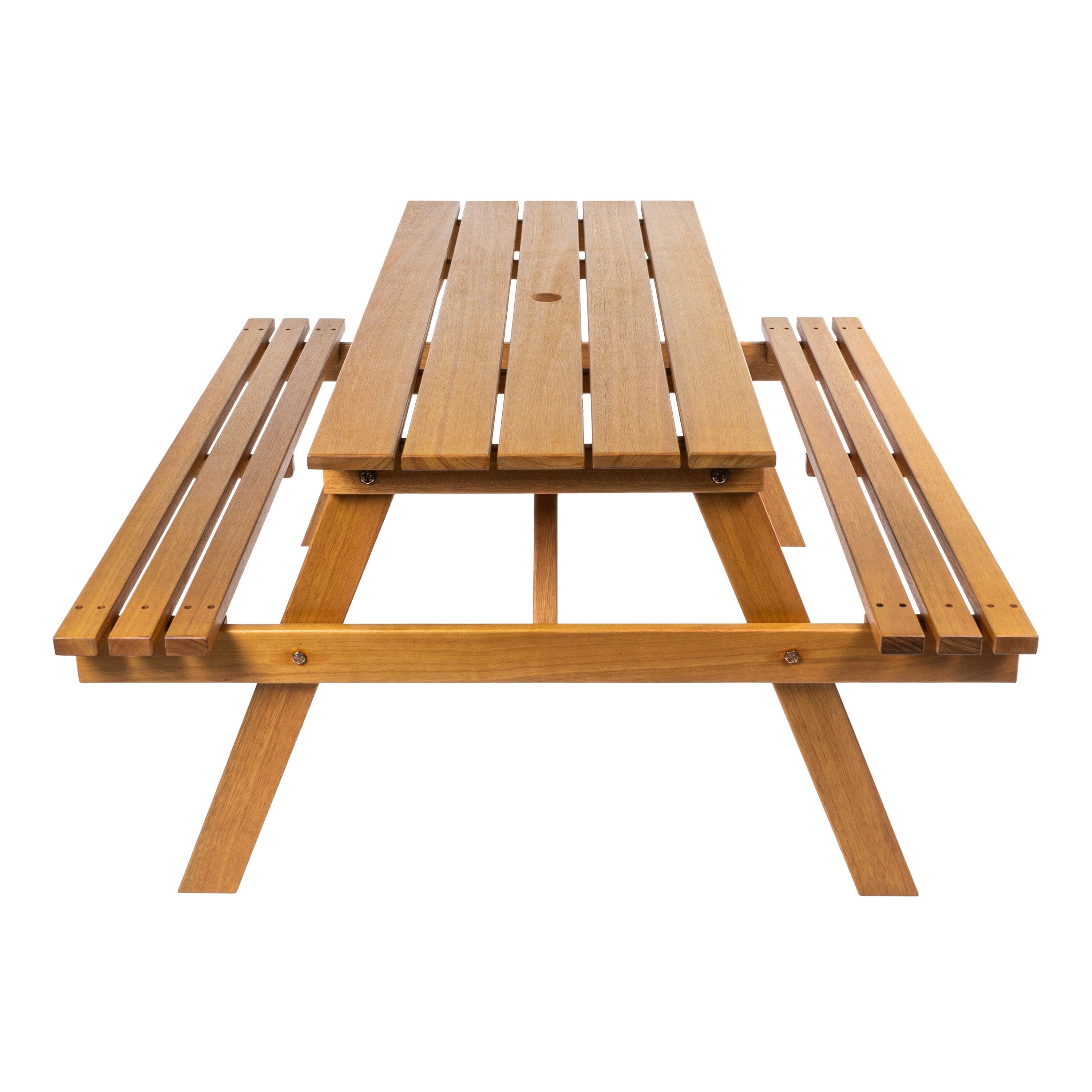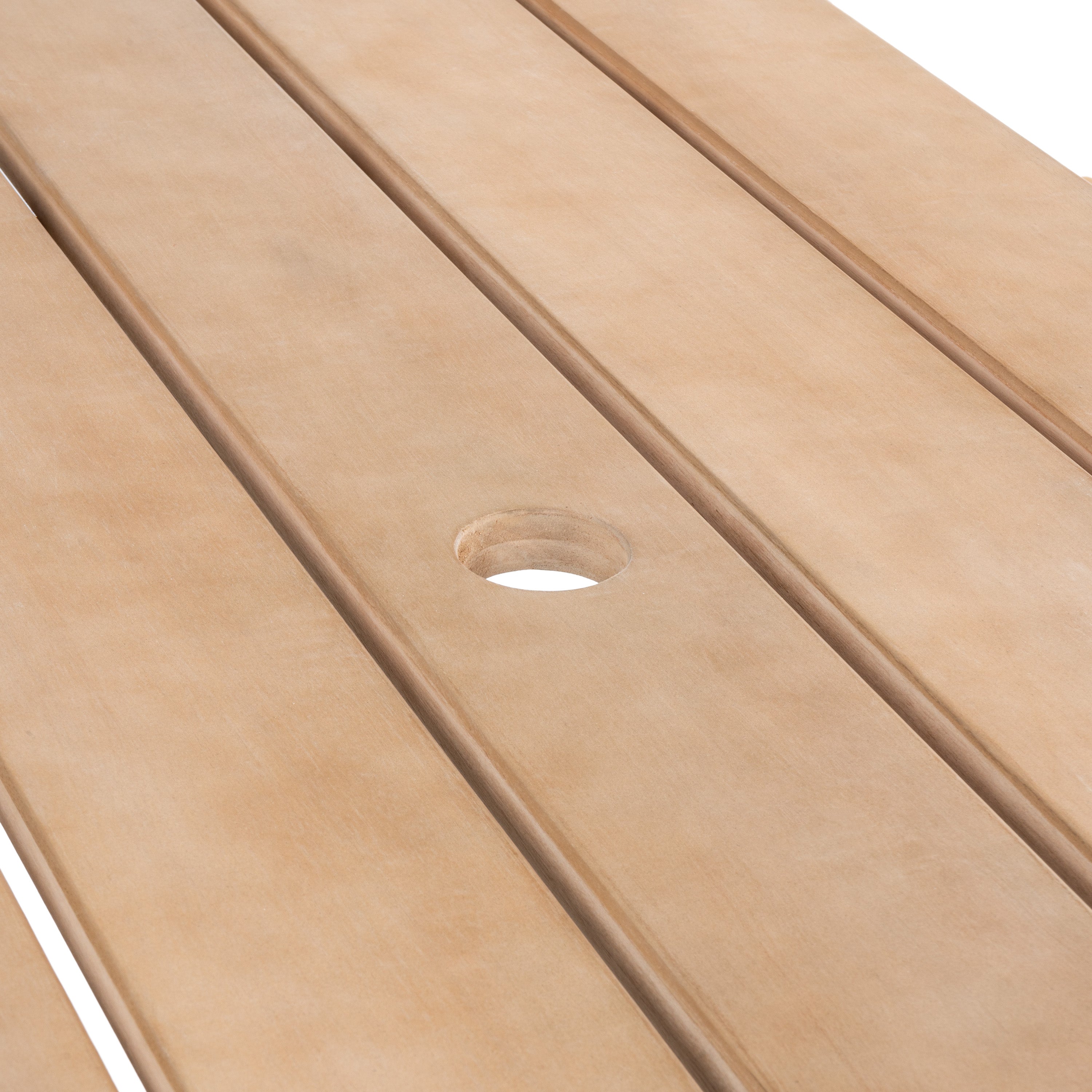 Entertain in style with our modern version of the classic picnic table. Our version features cleaner lines to complement a mid-century modern or farmhouse home. Handcrafted from durable eucalyptus wood, this versatile design includes an umbrella hole in the center.