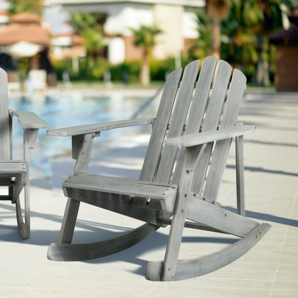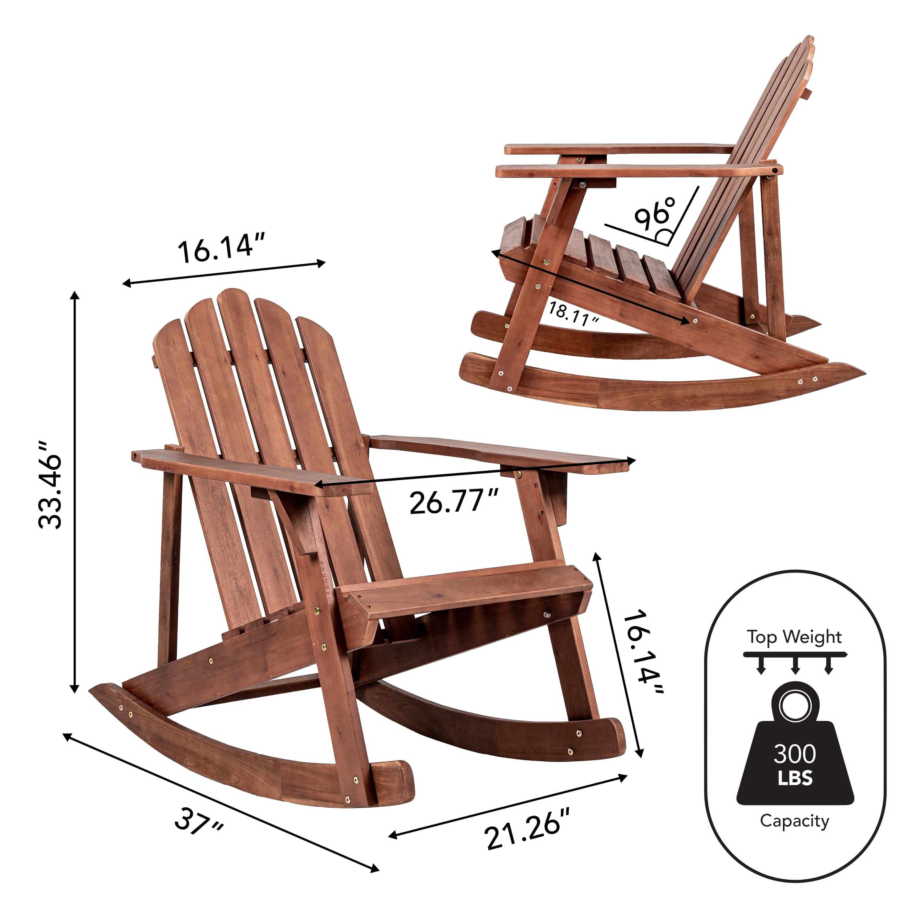 This traditional Adirondack rocker adds vintage charm to your porch, deck or patio. Comfortable slat-back rocking chair has an arched top for classic resort style. Handcrafted from durable acacia wood, with sturdy construction that's built to last.