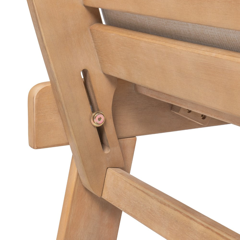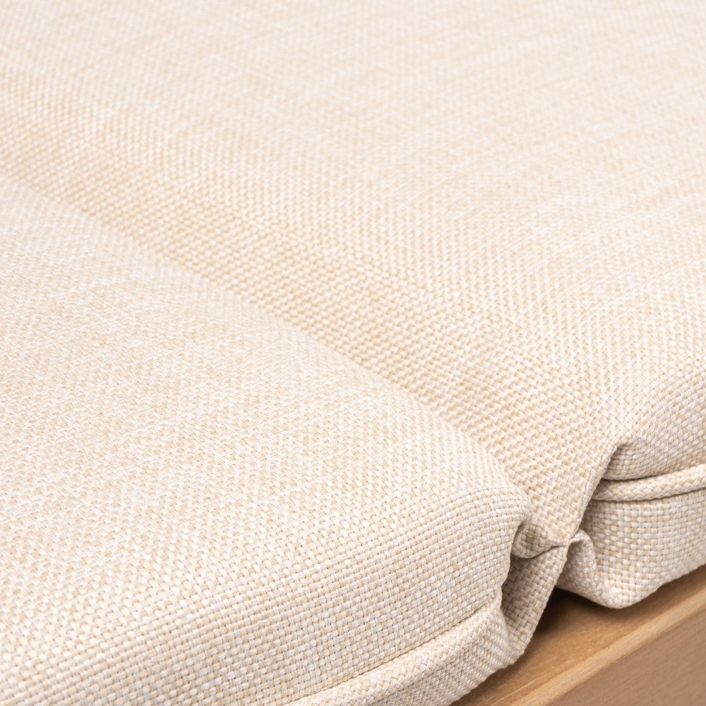 - Solid wood is treated with a light teak matte finish for a natural wood look; cushion fabric is outdoor polyester in beige