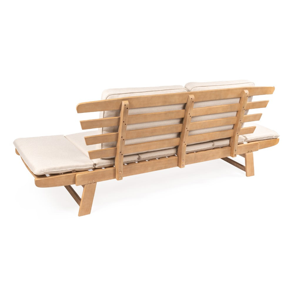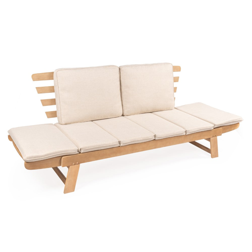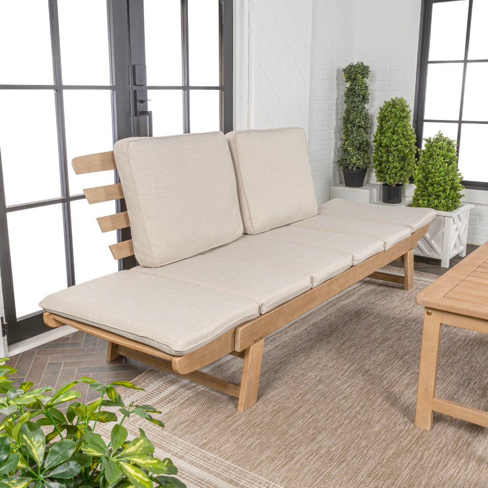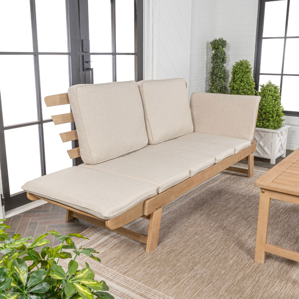 Our mid-century style adjustable bench converts easily from a cozy settee to a flat lounge for napping. Made from durable acacia wood, it features cushions covered in durable outdoor fabric. Perfect for a small deck or patio, this versatile modern sofa is ready for entertaining.