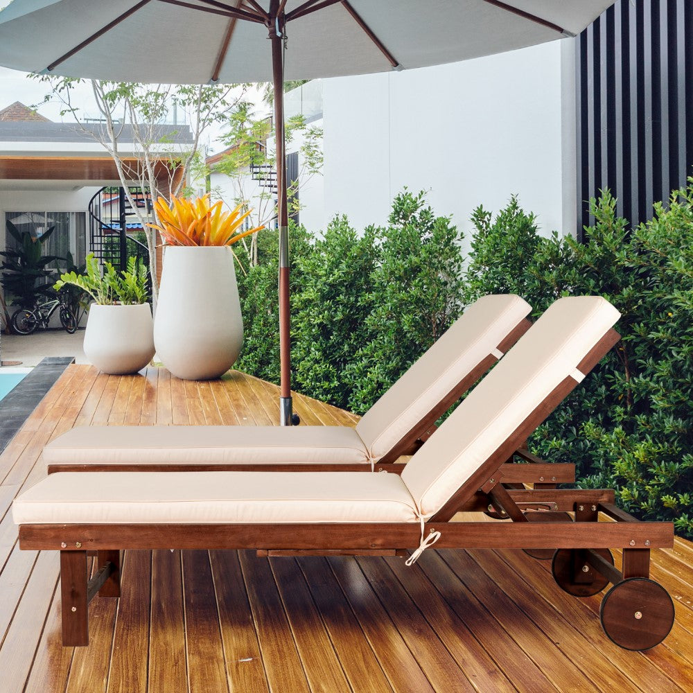 Skido Outdoor Acacia Wood Lounger with Cushion, 5-Position Back, Slide Table & Wheels