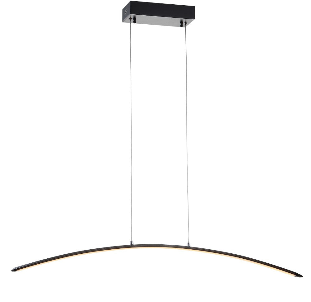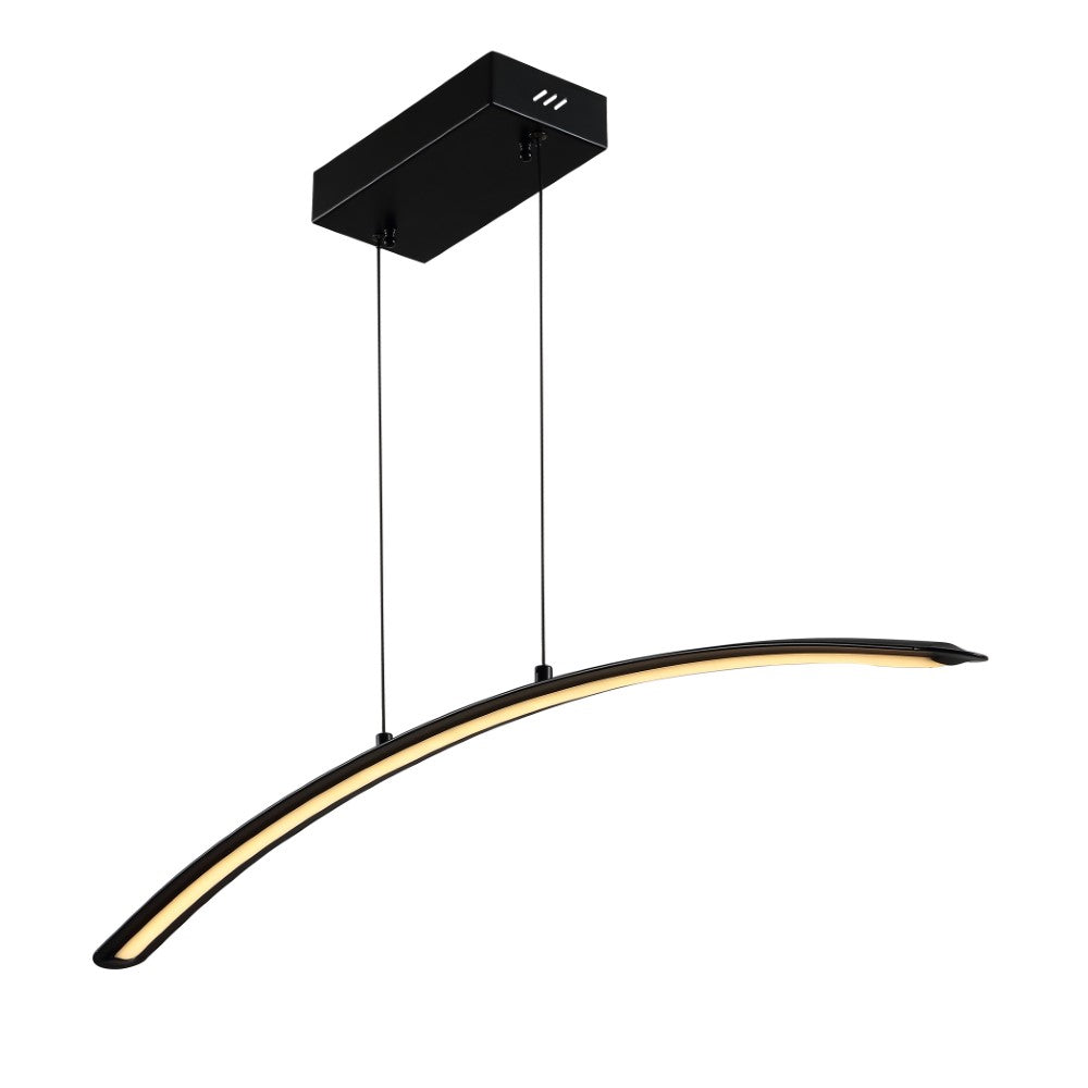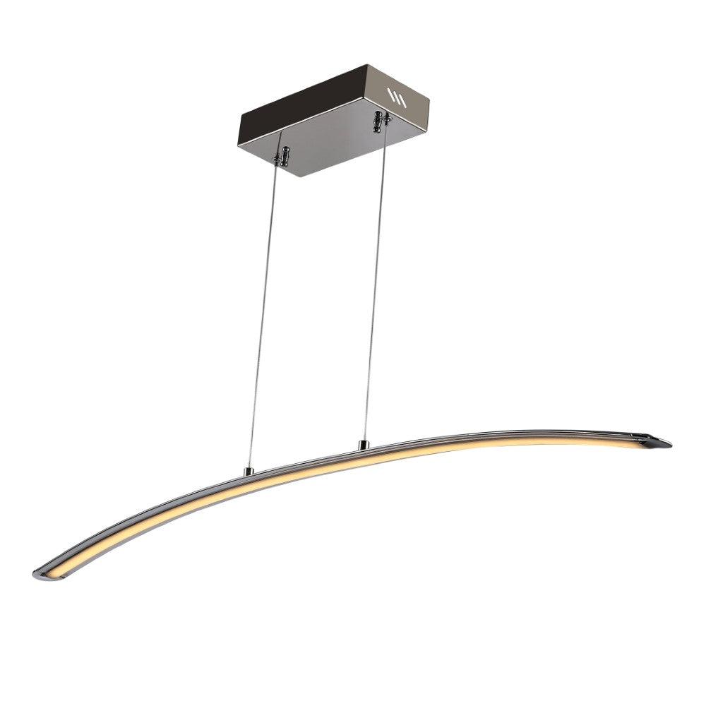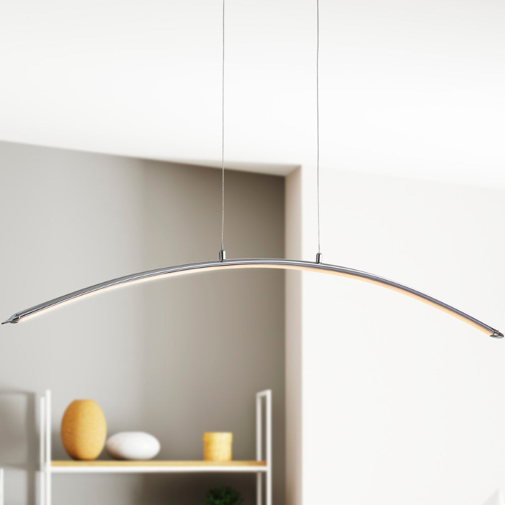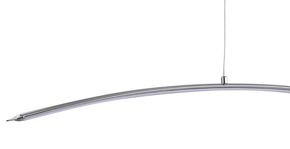 A single, curved line is suspended by clean lines in this sleek pendant. An easy addition to a contemporary space, this piece features an adjustable drop and an integrated LED light. Perfectly suited to hang over a kitchen island or dining area.