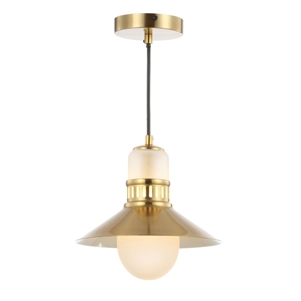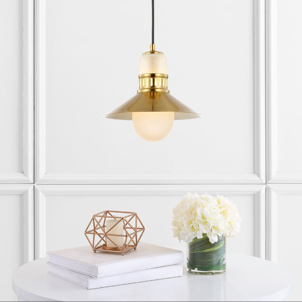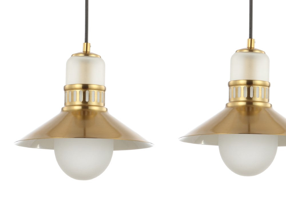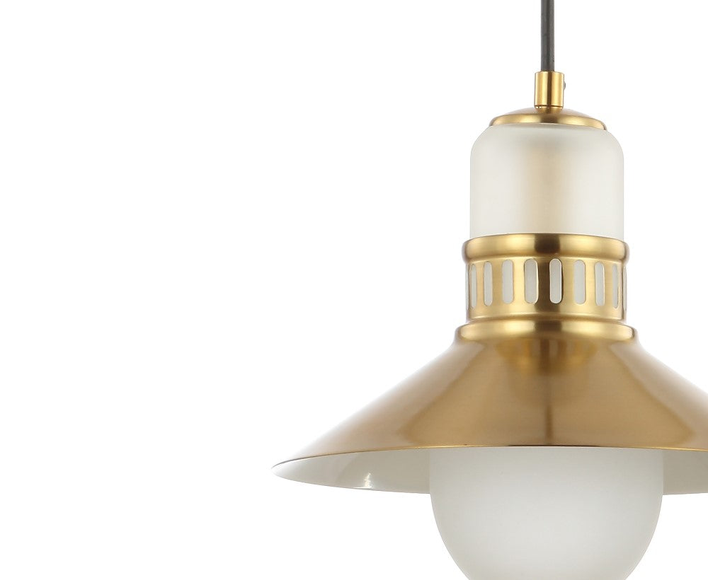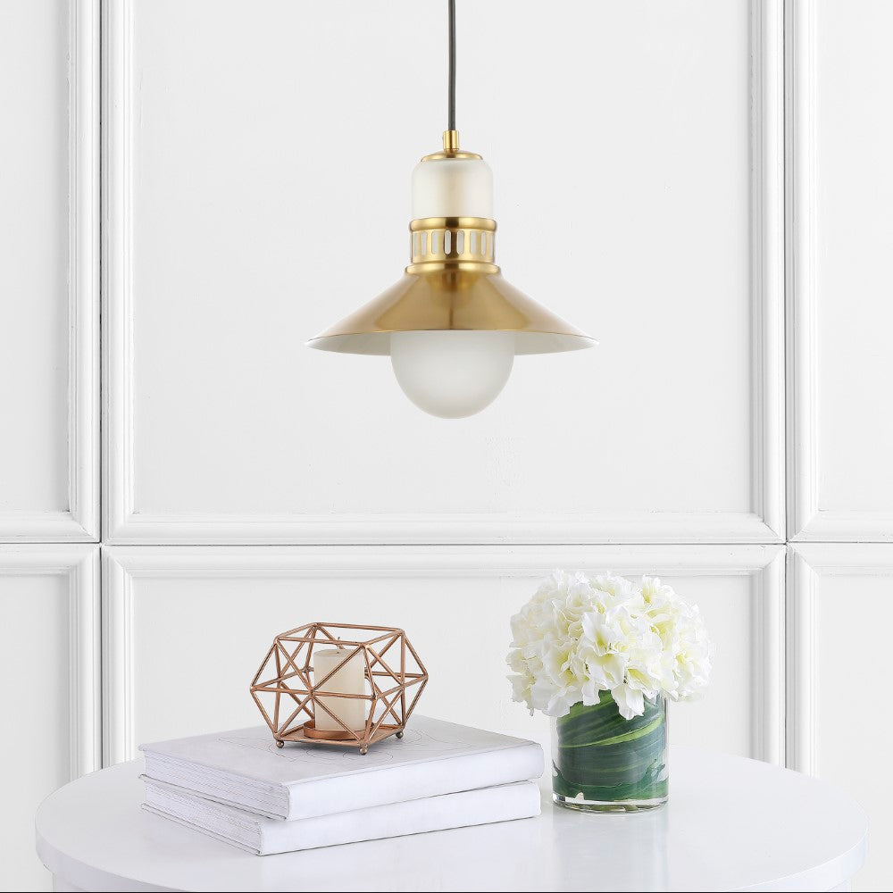 This coastal inspired pendant light has vintage style, dressed up in a brass-gold finish. The metal shade adds a bright brass accent, while the frosted glass globe covers the LED bulb for soft, bright light. These versatile pendants are perfect over a kitchen island, table, or bar top.