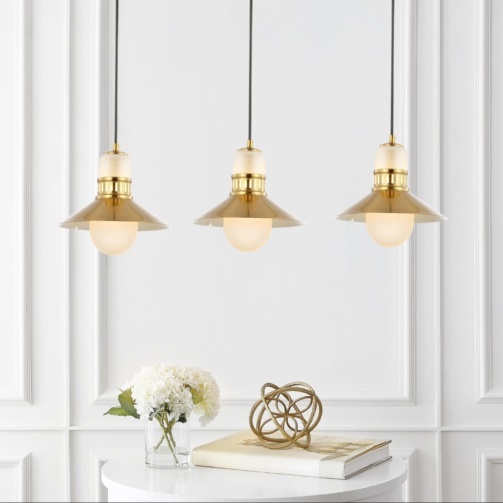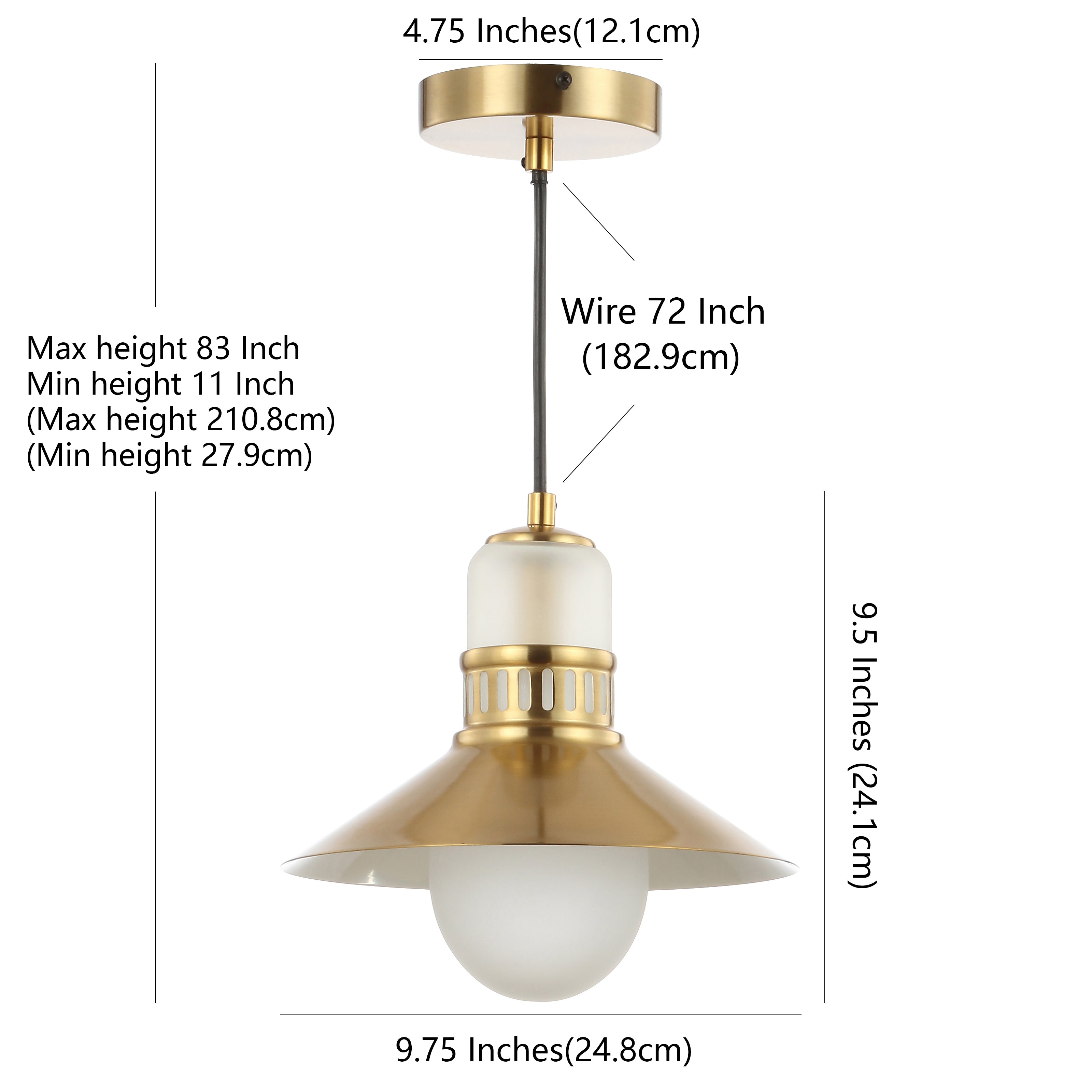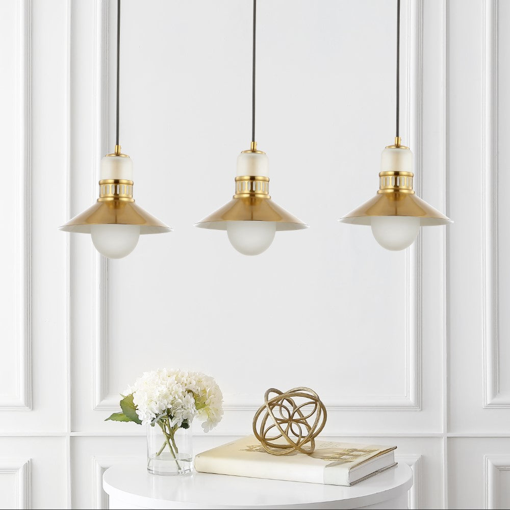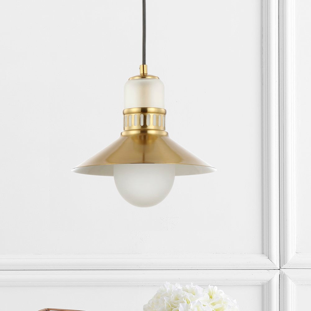This coastal inspired pendant light has vintage style, dressed up in a brass-gold finish. The metal shade adds a bright brass accent, while the frosted glass globe covers the LED bulb for soft, bright light. These versatile pendants are perfect over a kitchen island, table, or bar top.