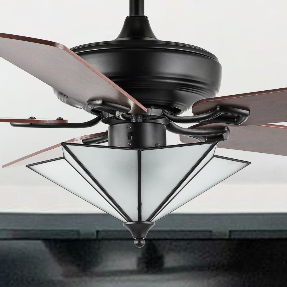 Our 52" black ceiling fan is a stylish find, with a Moravian star light shade that softens the LED bulbs. The black finish is complemented by five reversible blades in a rustic greige or brown finish. The handy remote control lets you easily control lighting and air flow.