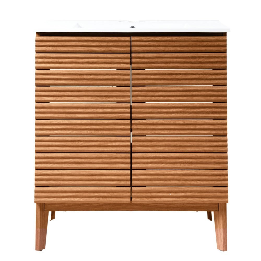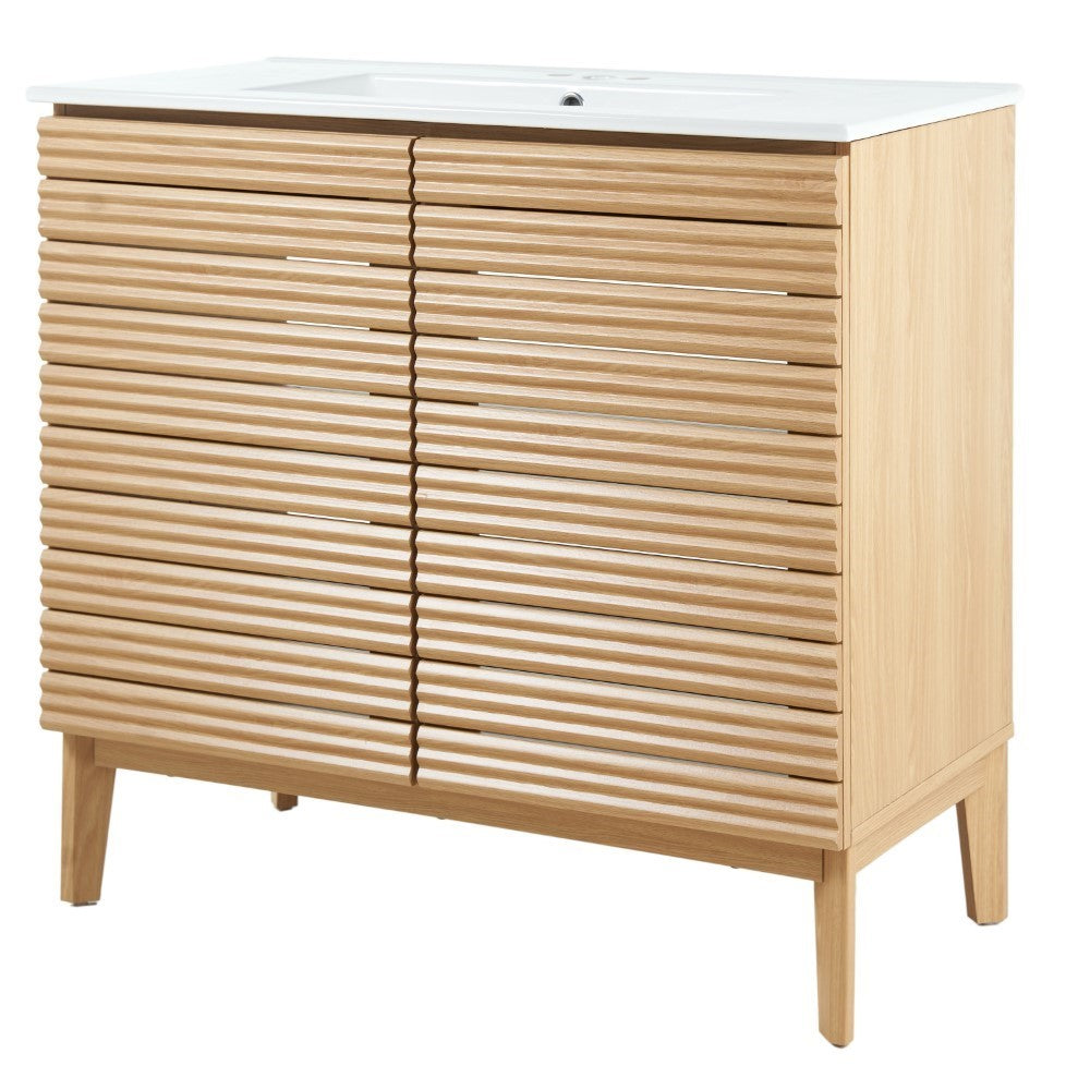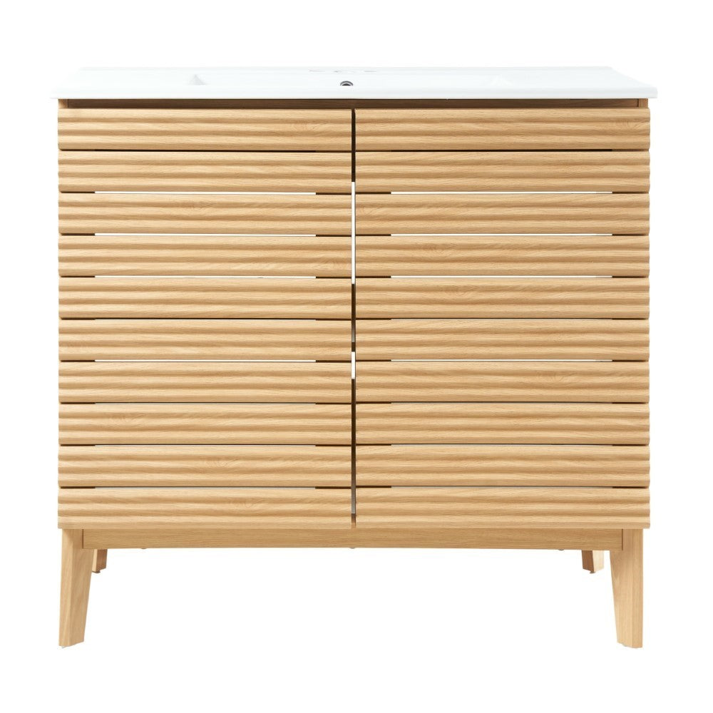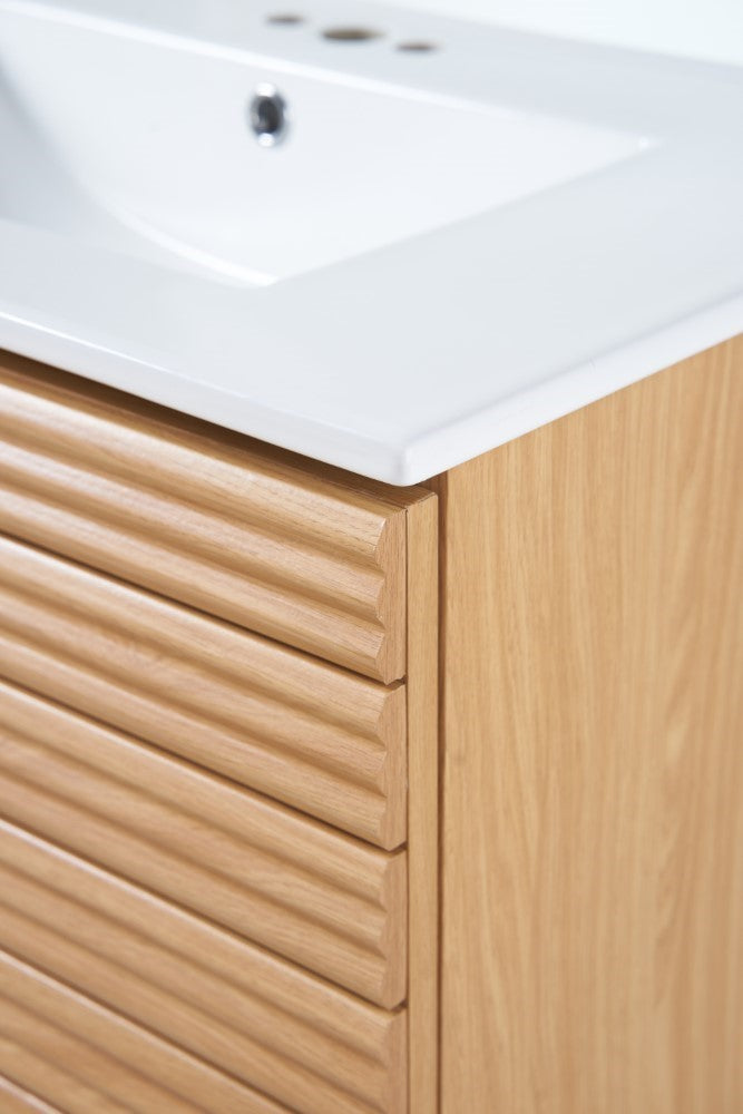 • The matte oak coloring of this vanity cabinet will add a touch of coastal bohemian decor to any space