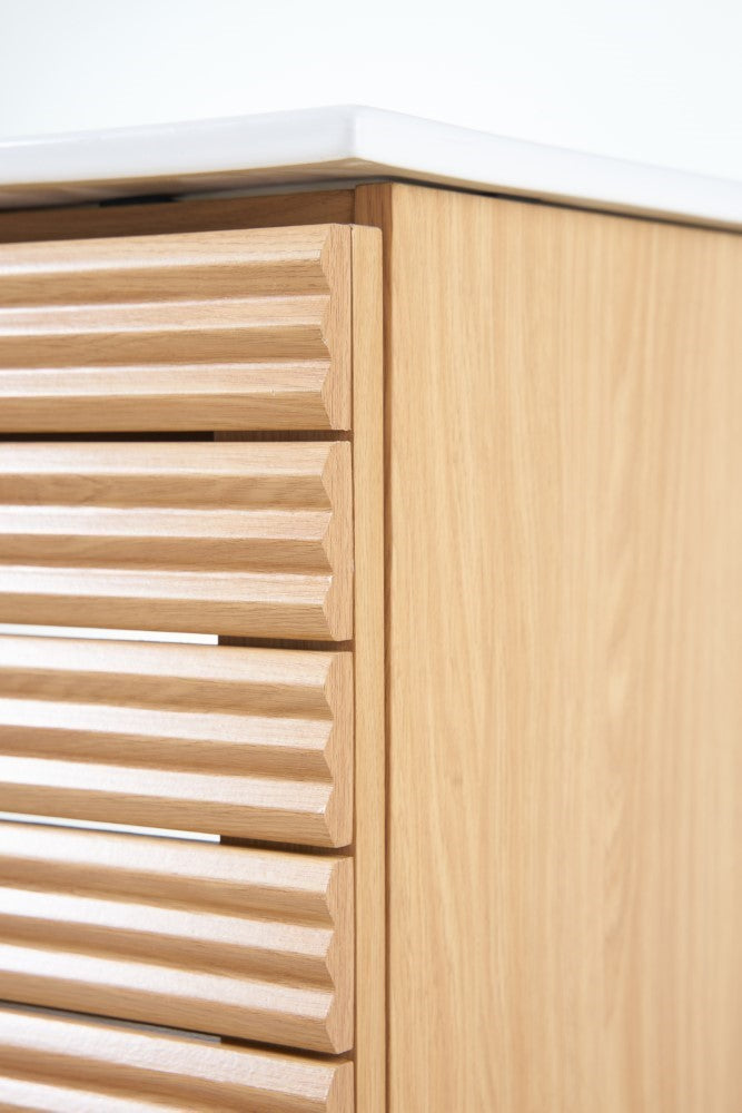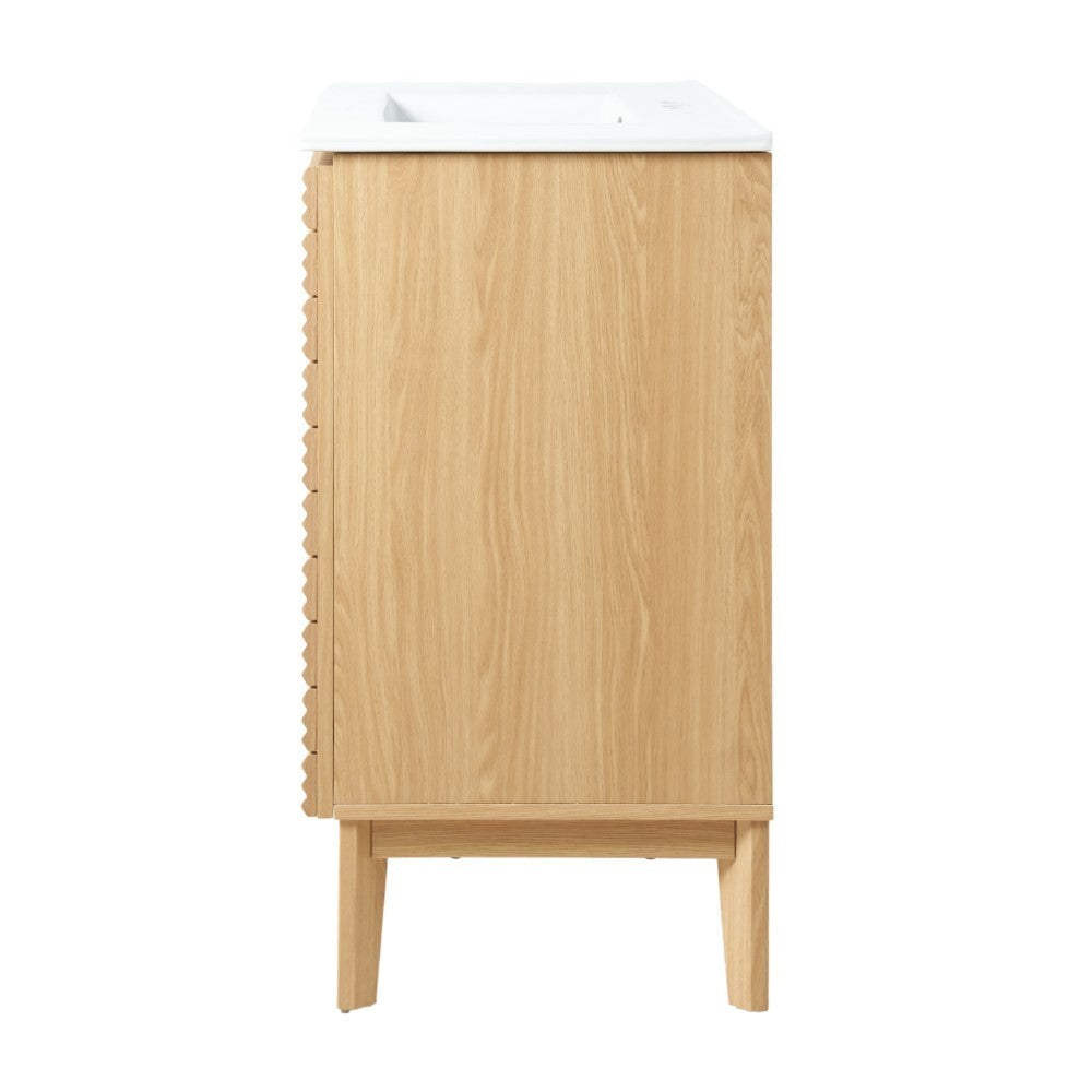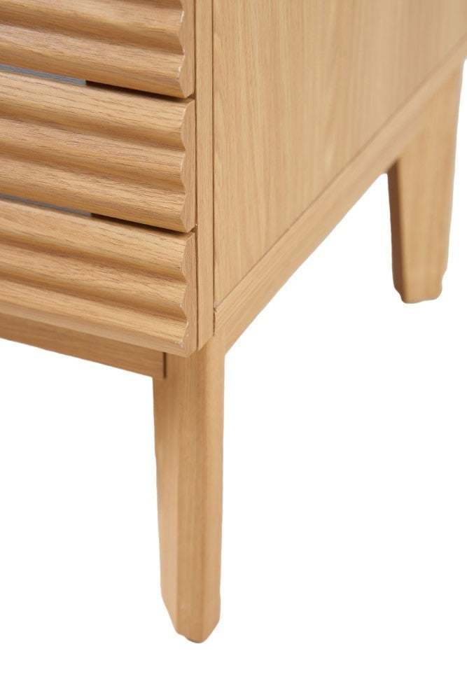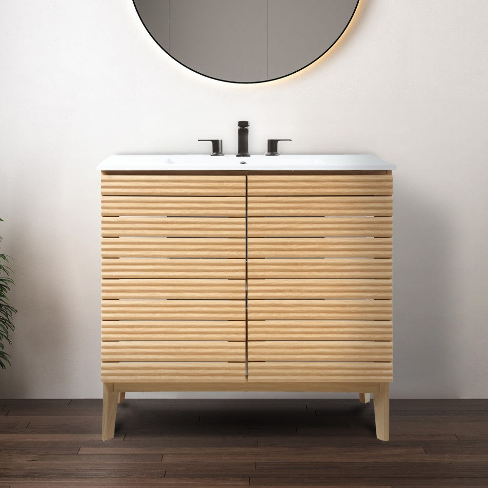 • The matte oak coloring of this vanity cabinet will add a touch of coastal bohemian decor to any space