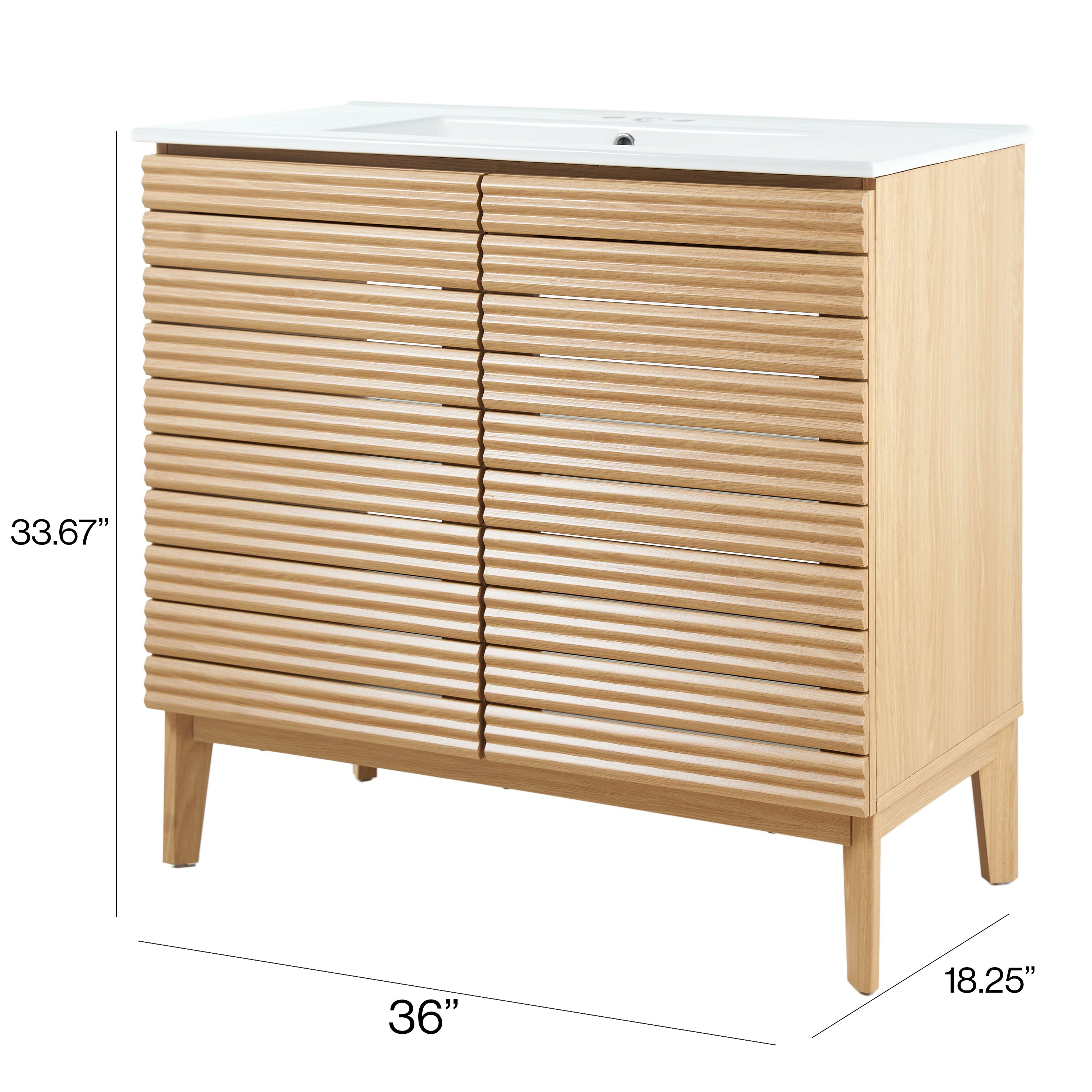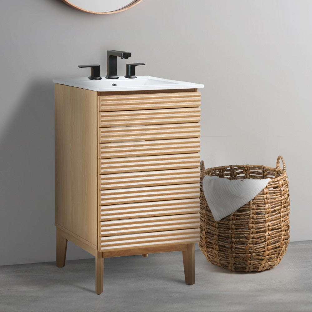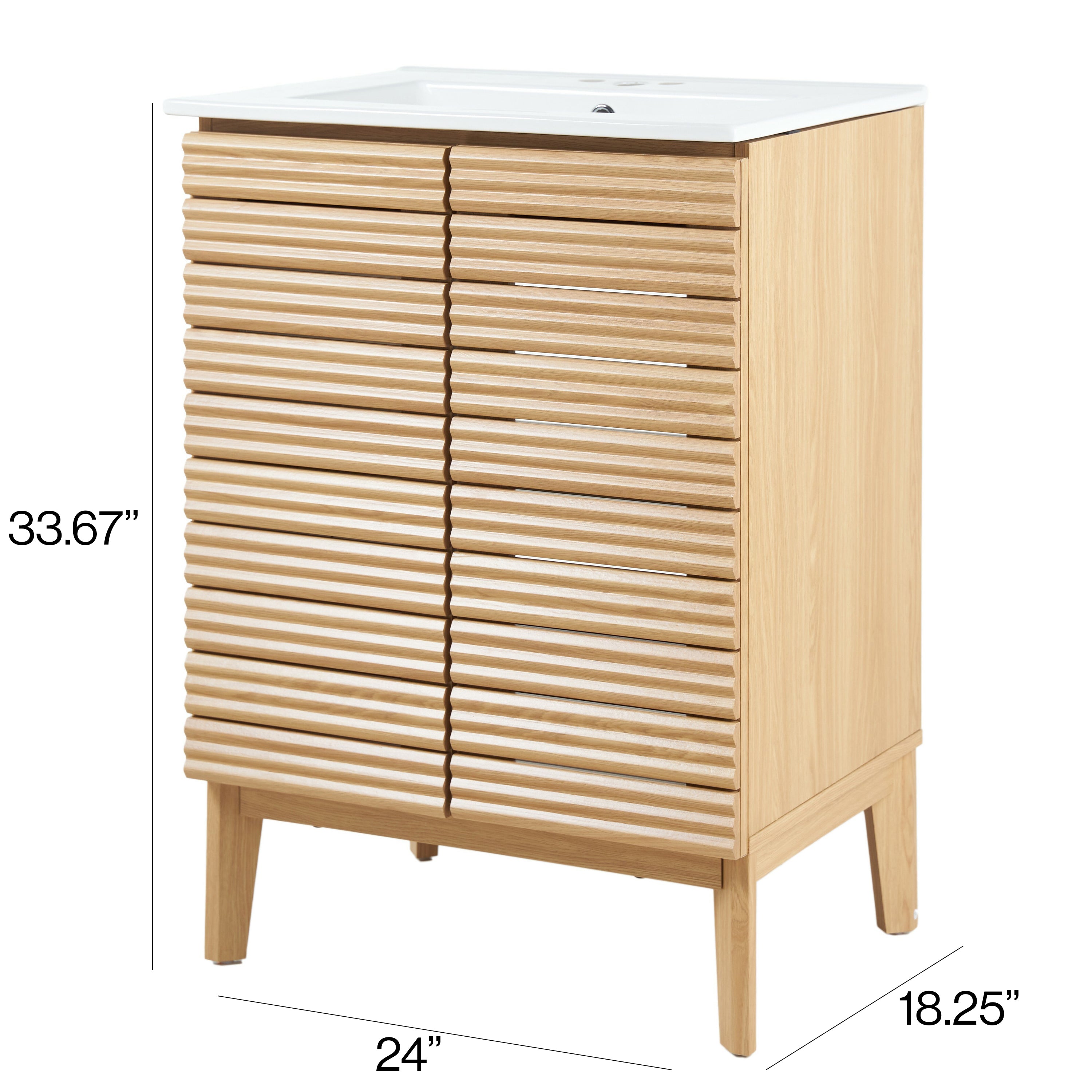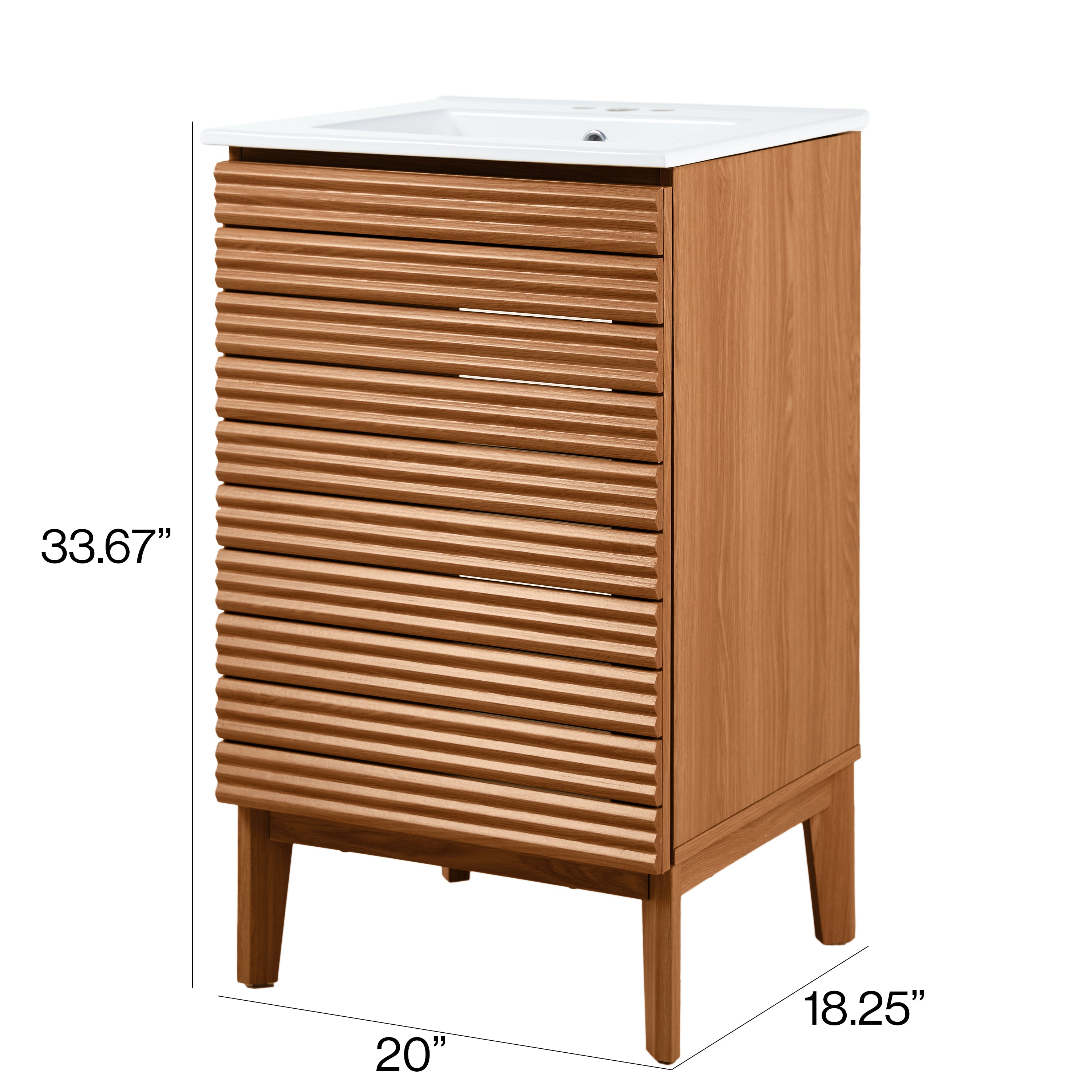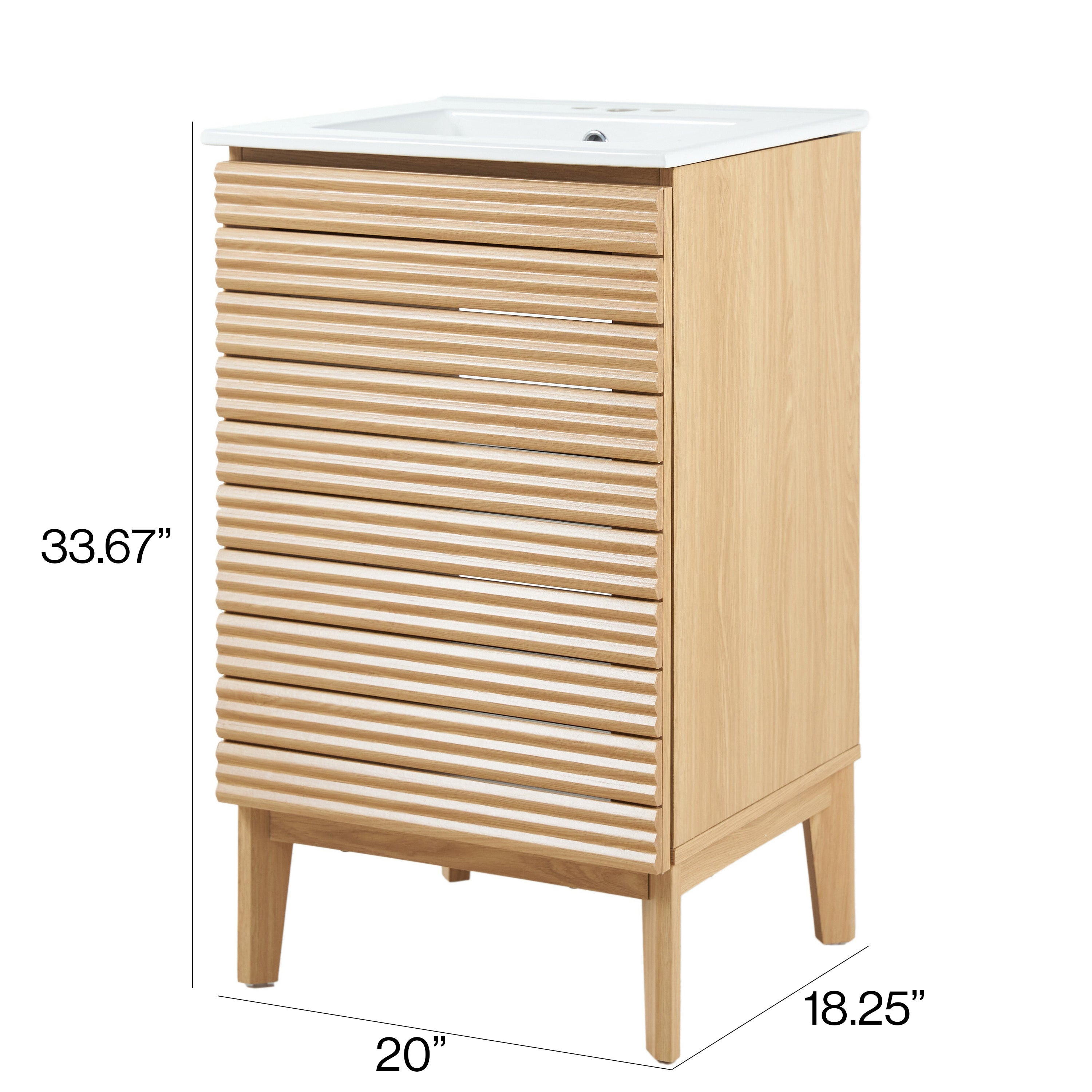 This bath vanity set consists of a 20" ceramic sink basin elevated by a Mediterranean vanity cabinet. With a single door and farmhouse slats, this cabinet adds a touch of southwestern or coastal decor to any bathroom. Whether used in your primary bathroom or powder room, this piece will bring the space together.