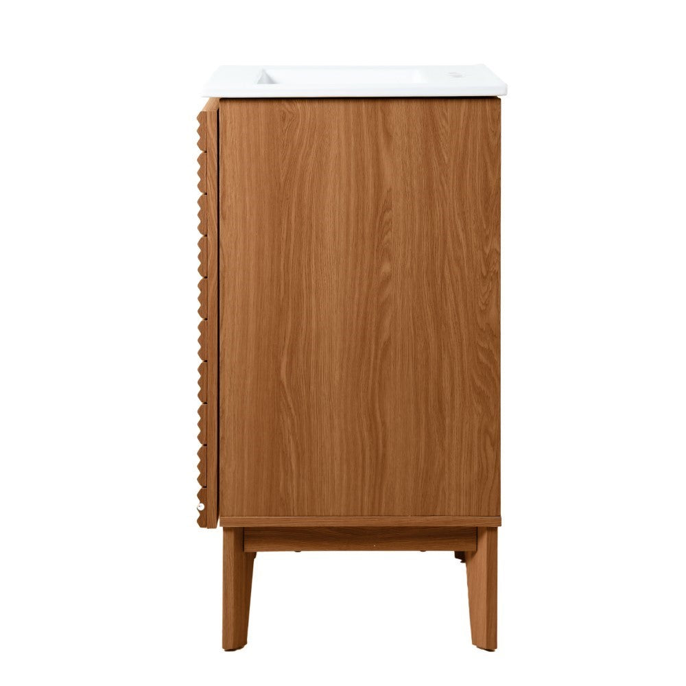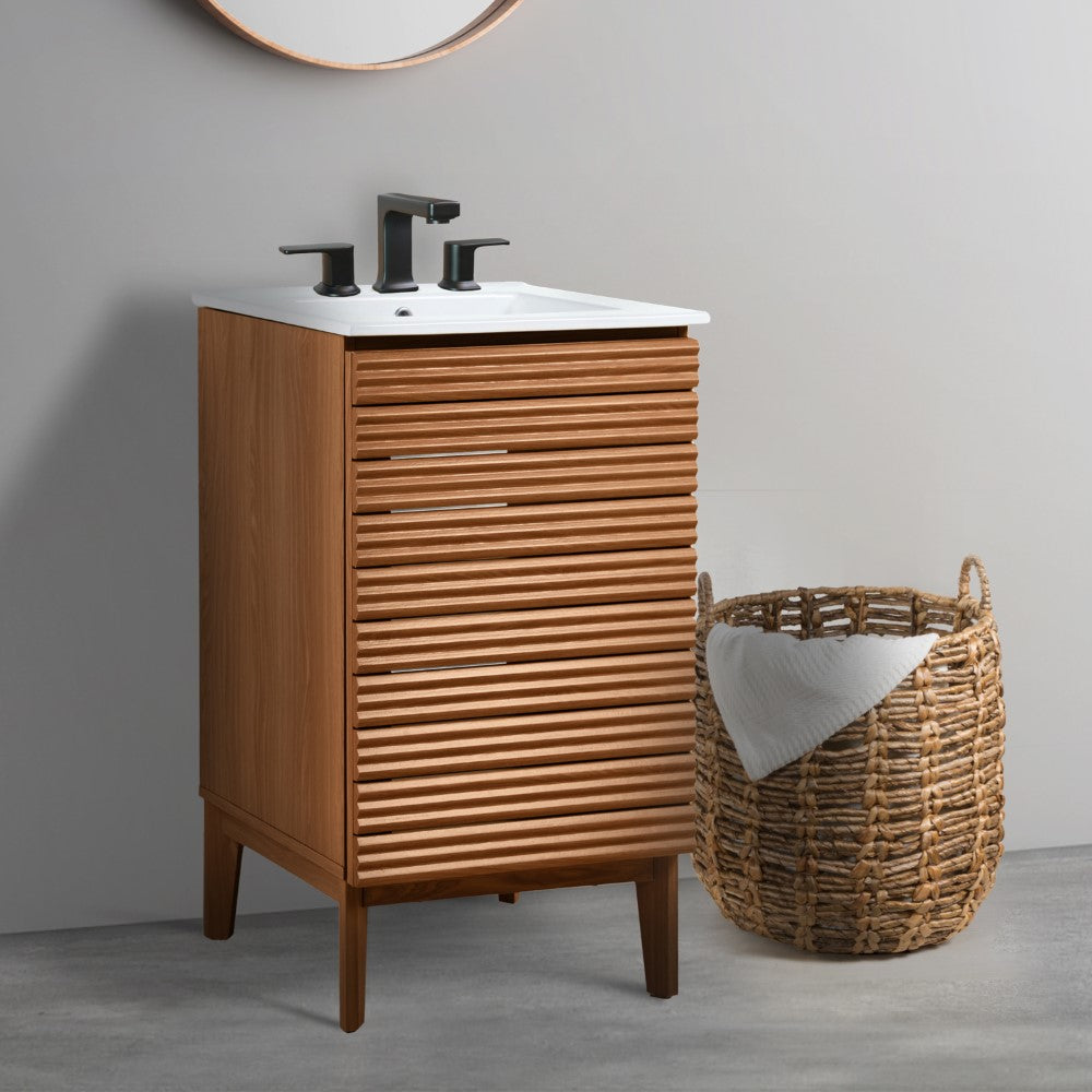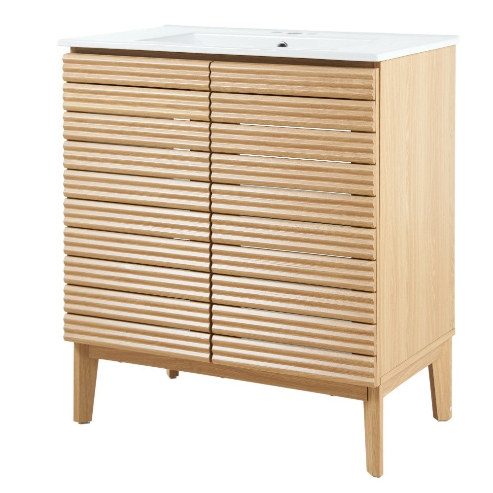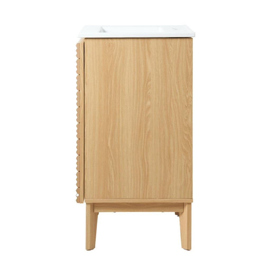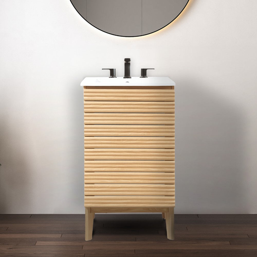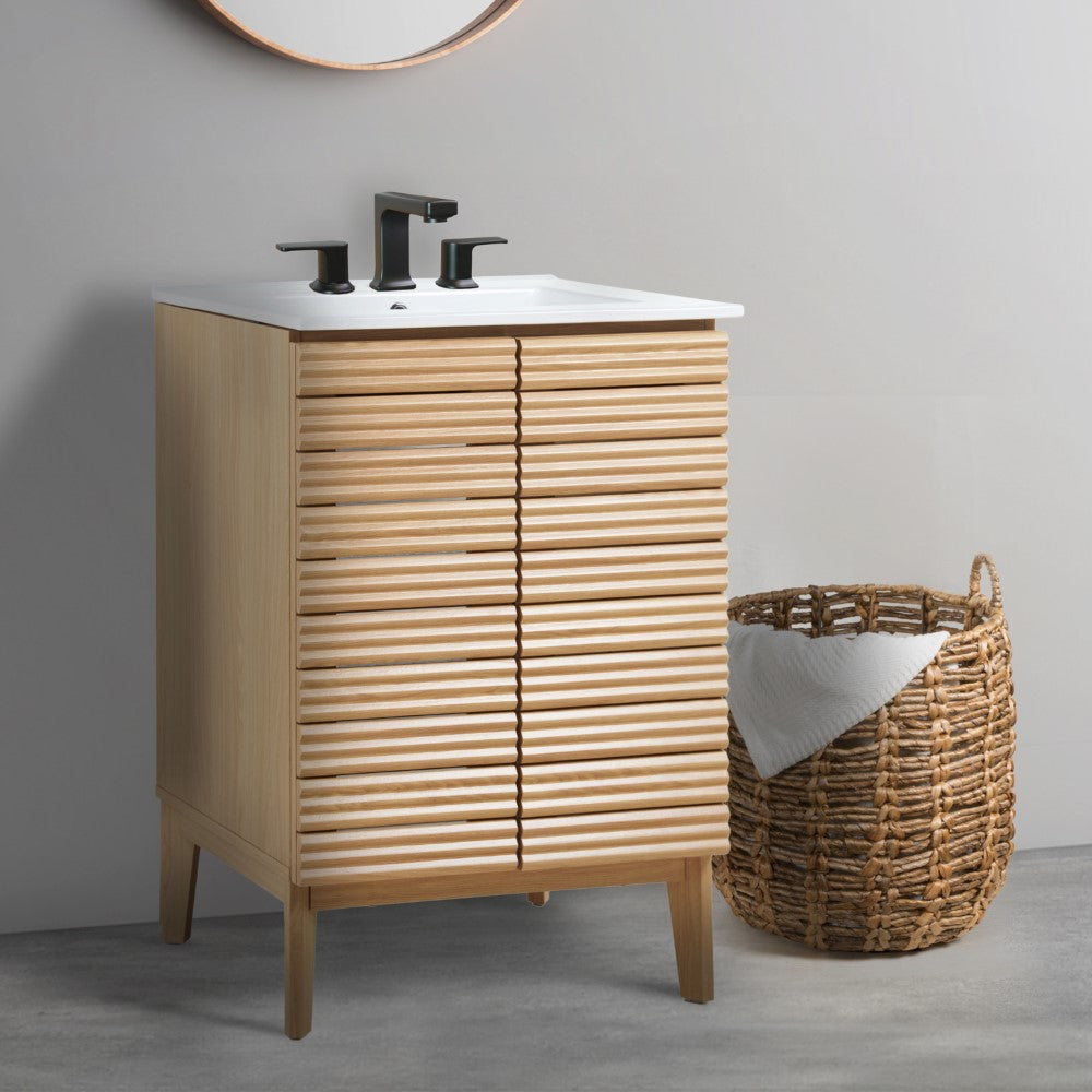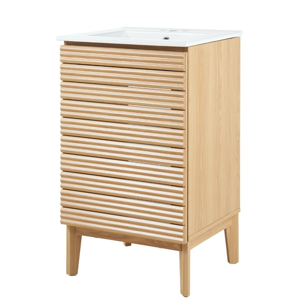 This bath vanity set consists of a 20" ceramic sink basin elevated by a Mediterranean vanity cabinet. With a single door and farmhouse slats, this cabinet adds a touch of southwestern or coastal decor to any bathroom. Whether used in your primary bathroom or powder room, this piece will bring the space together.
