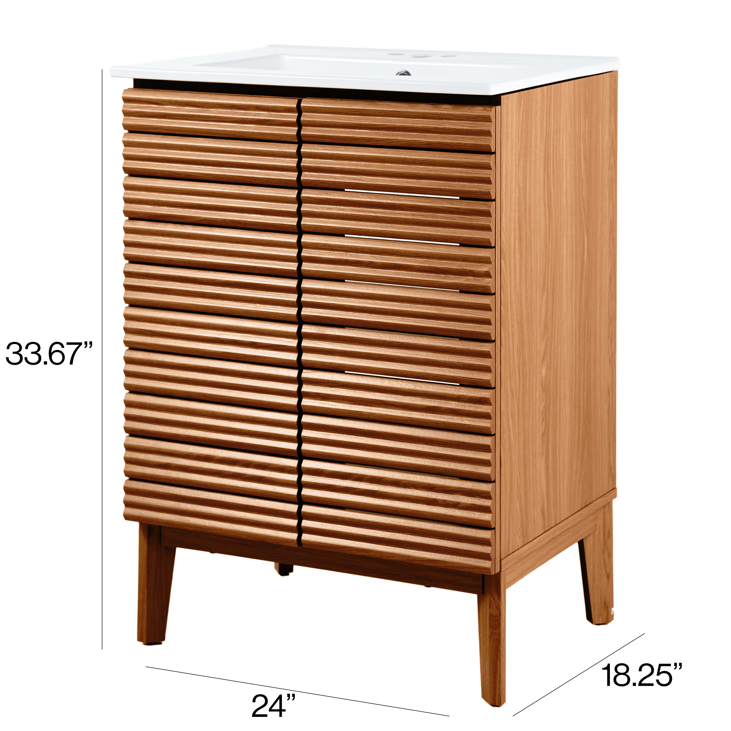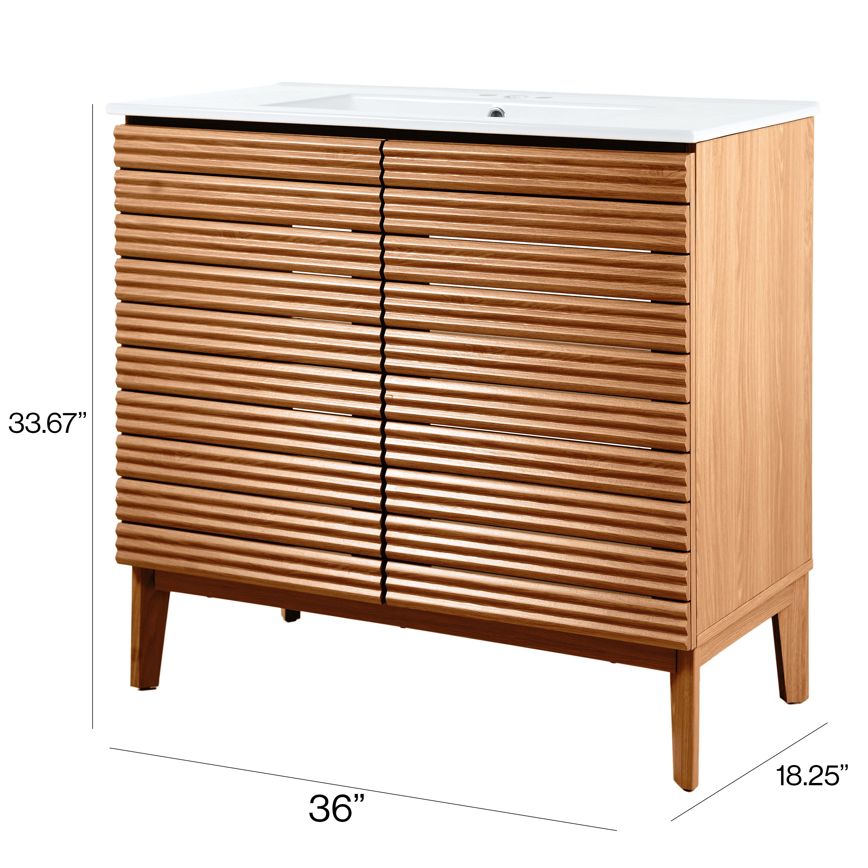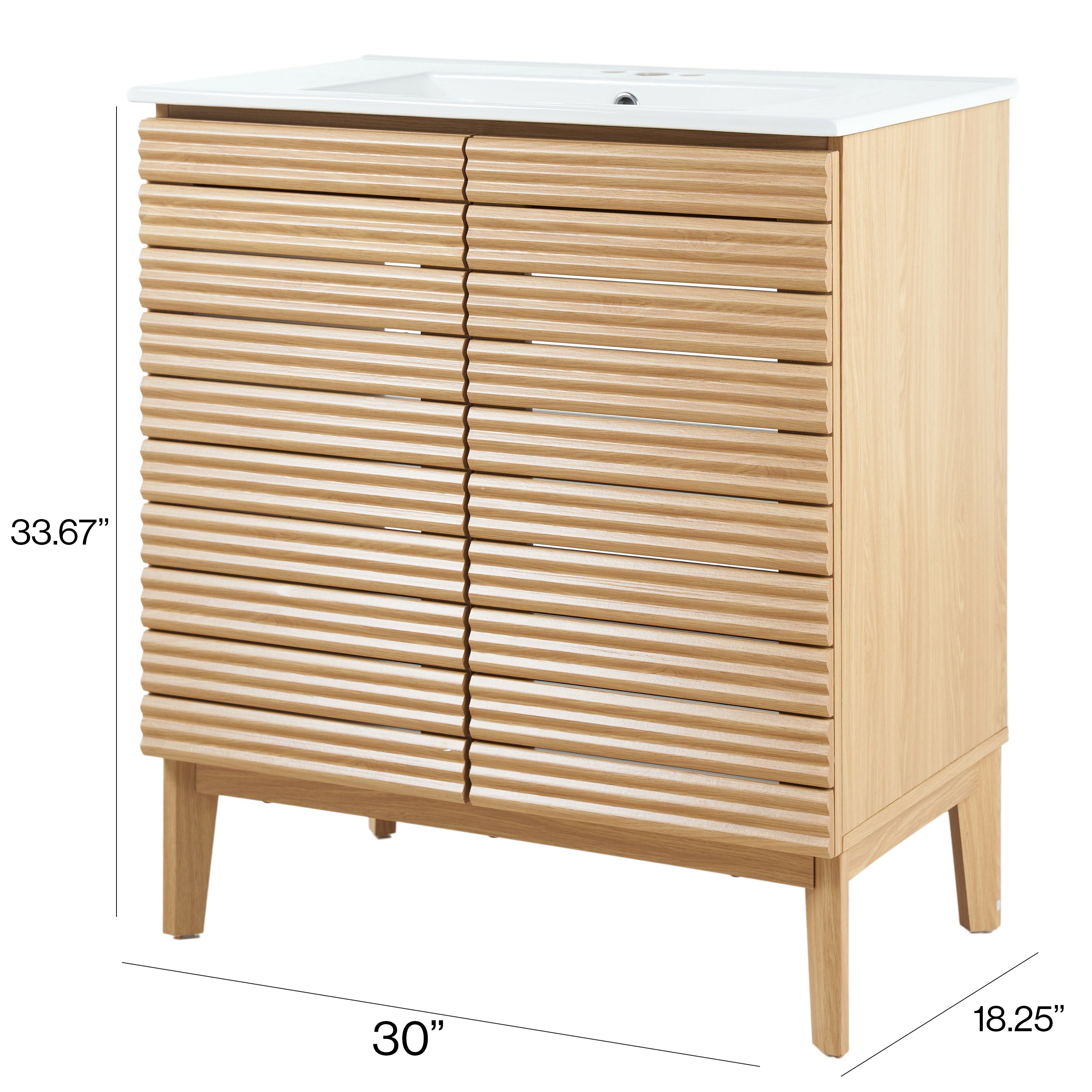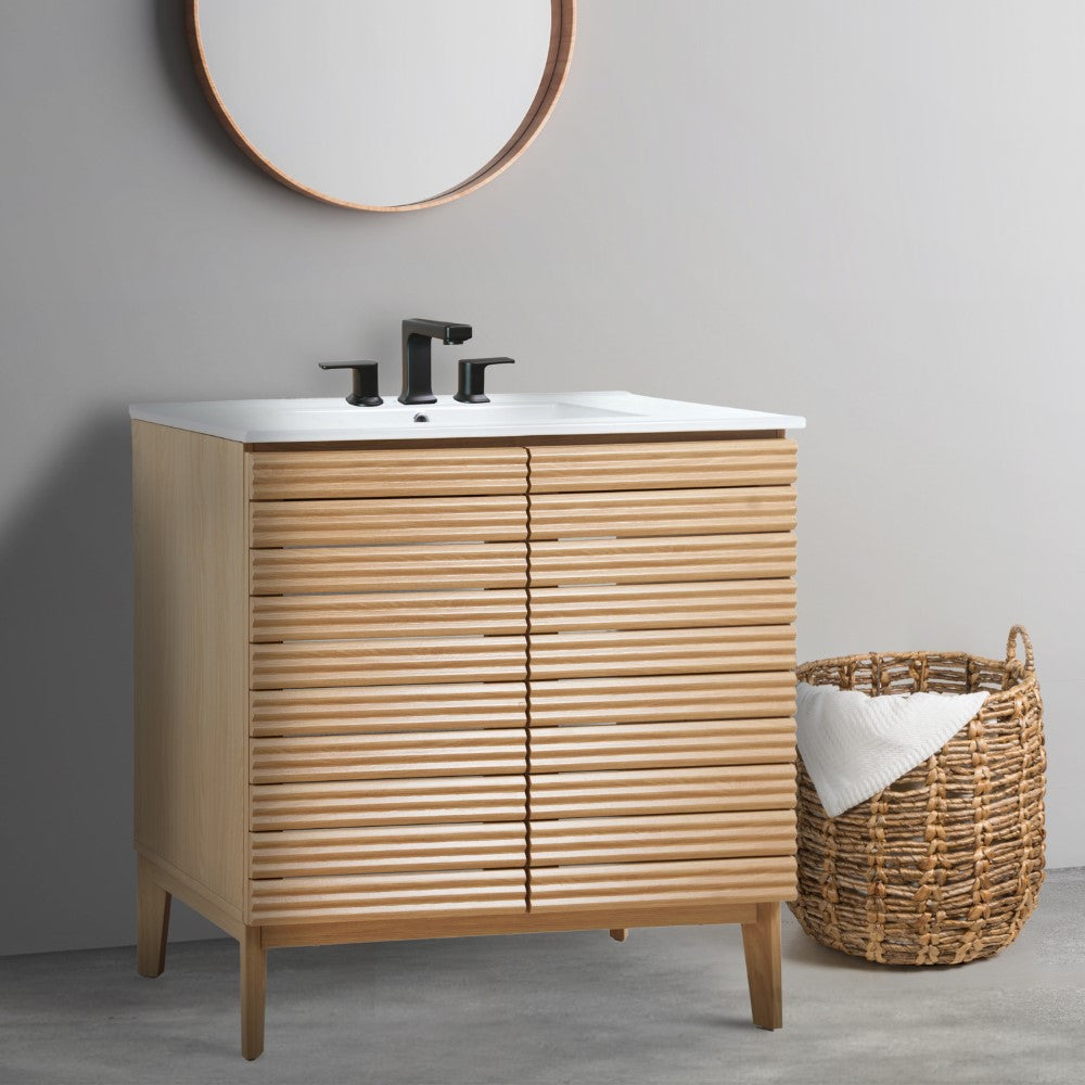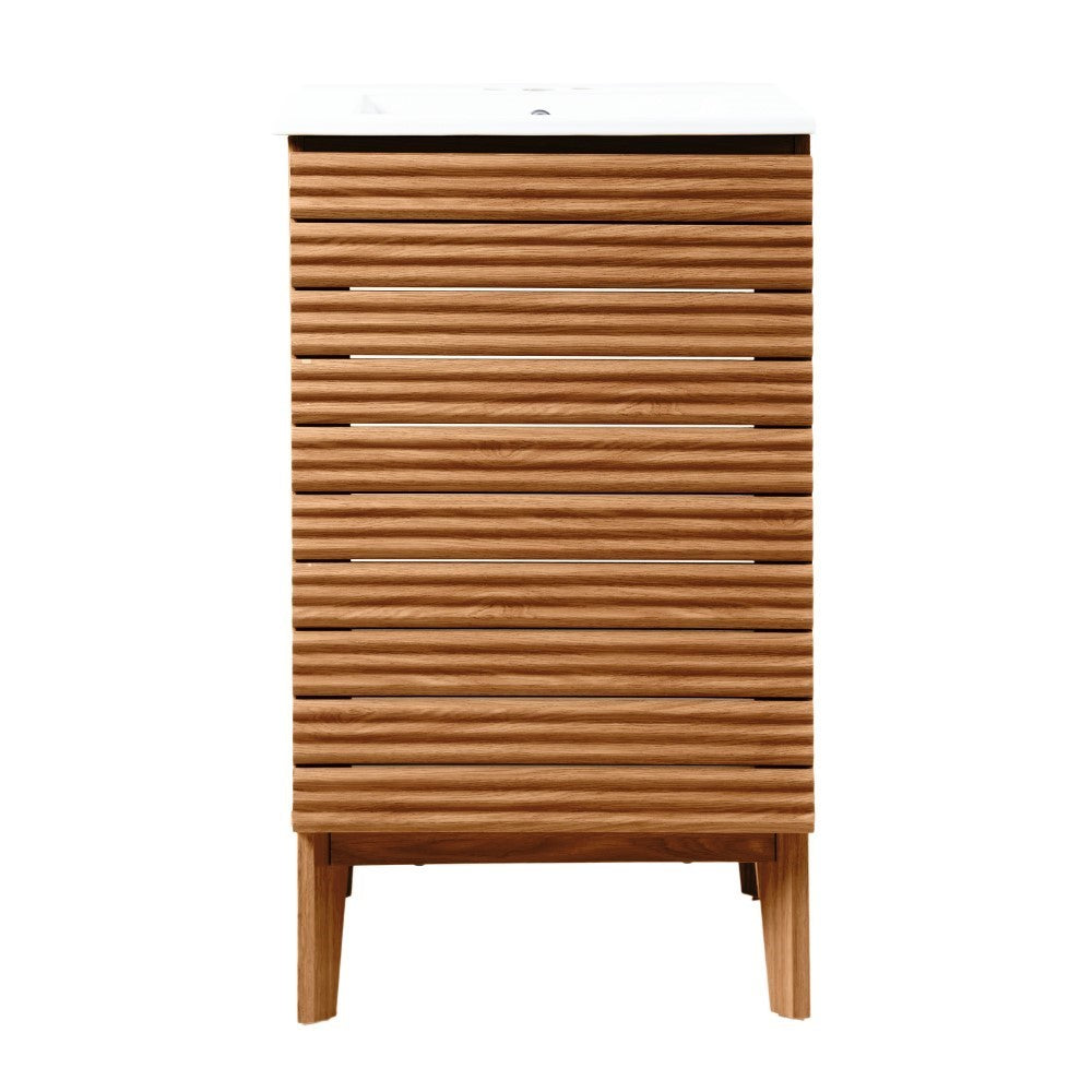This bath vanity set consists of a 20" ceramic sink basin elevated by a Mediterranean vanity cabinet. With a single door and farmhouse slats, this cabinet adds a touch of southwestern or coastal decor to any bathroom. Whether used in your primary bathroom or powder room, this piece will bring the space together.