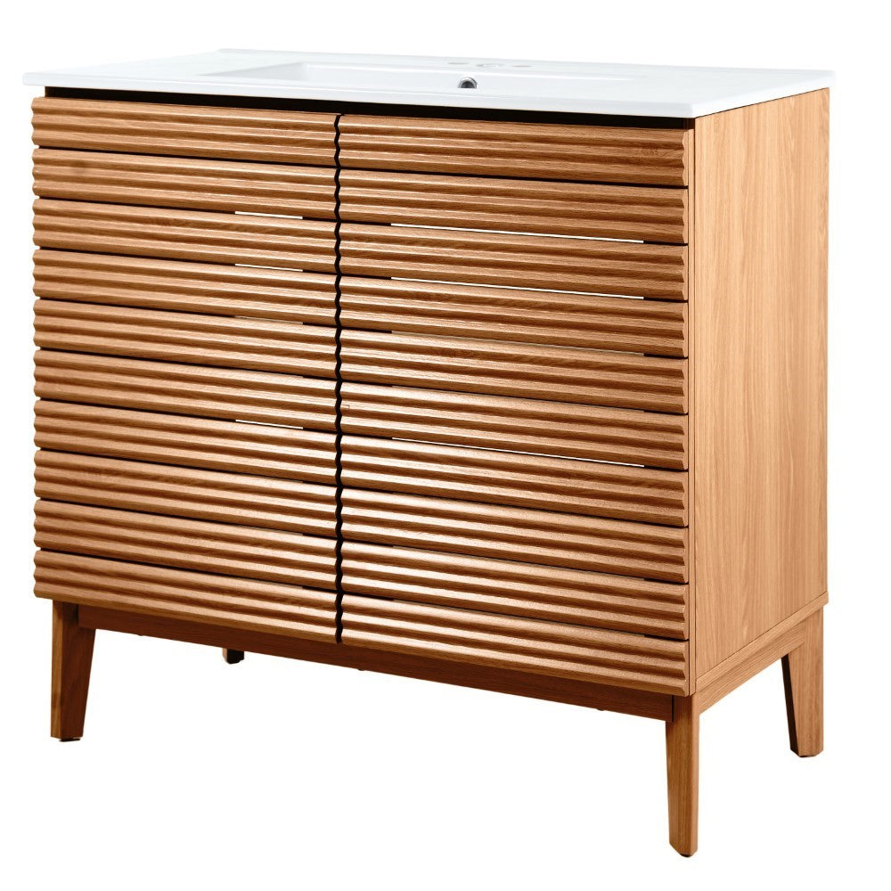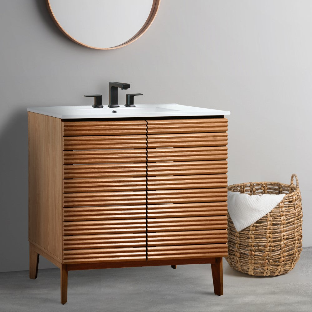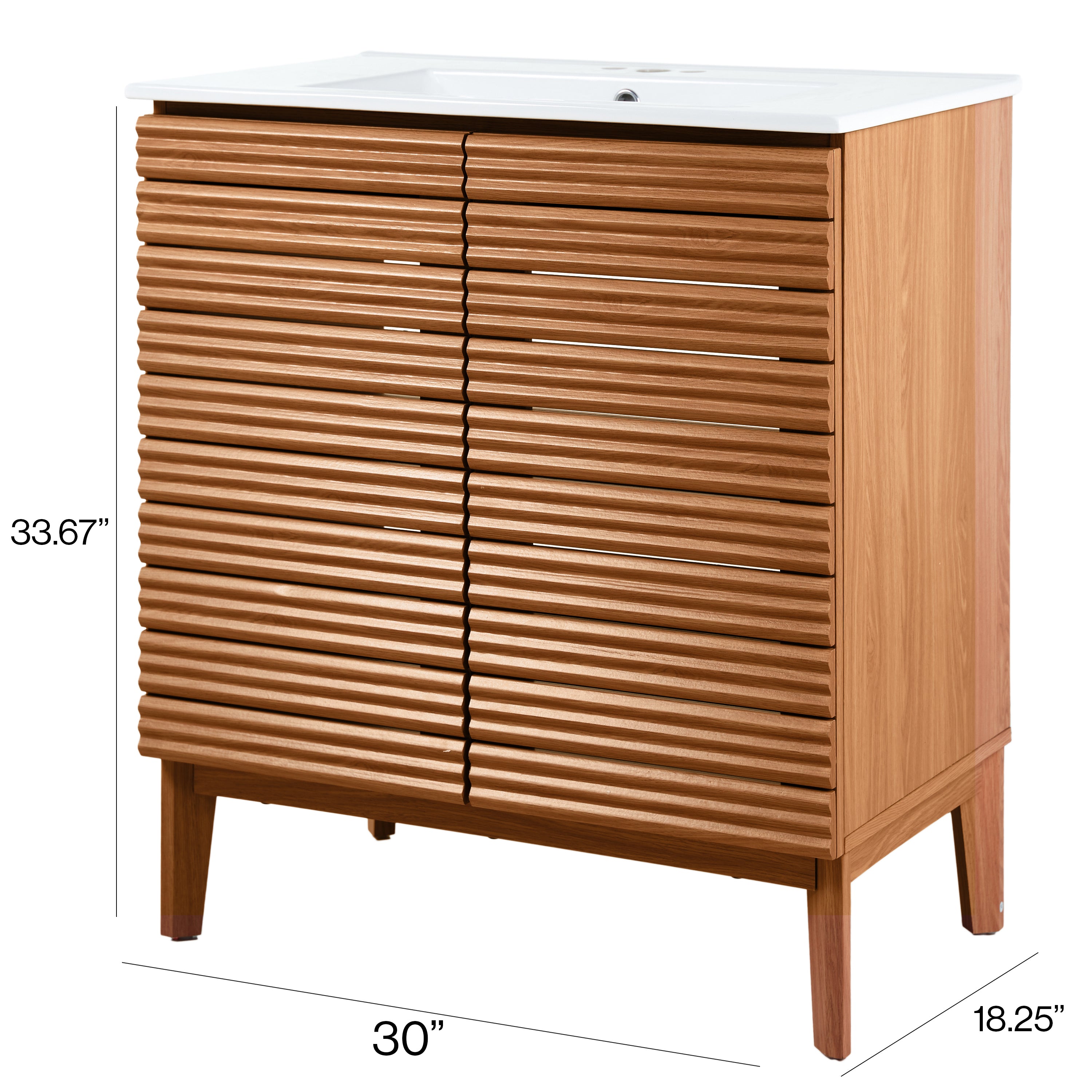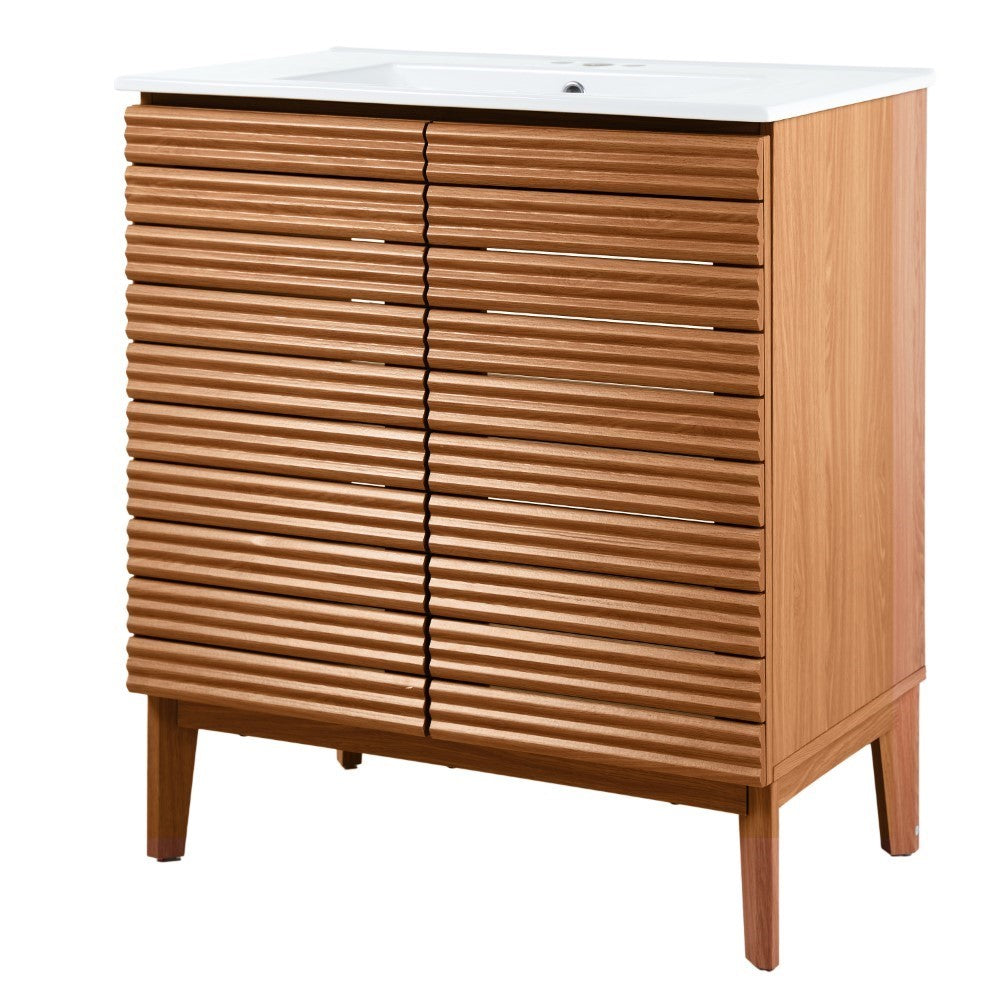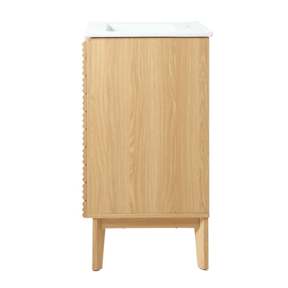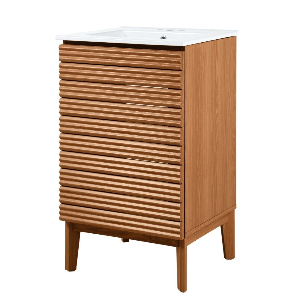 This bath vanity set consists of a 20" ceramic sink basin elevated by a Mediterranean vanity cabinet. With a single door and farmhouse slats, this cabinet adds a touch of southwestern or coastal decor to any bathroom. Whether used in your primary bathroom or powder room, this piece will bring the space together.