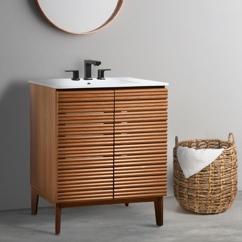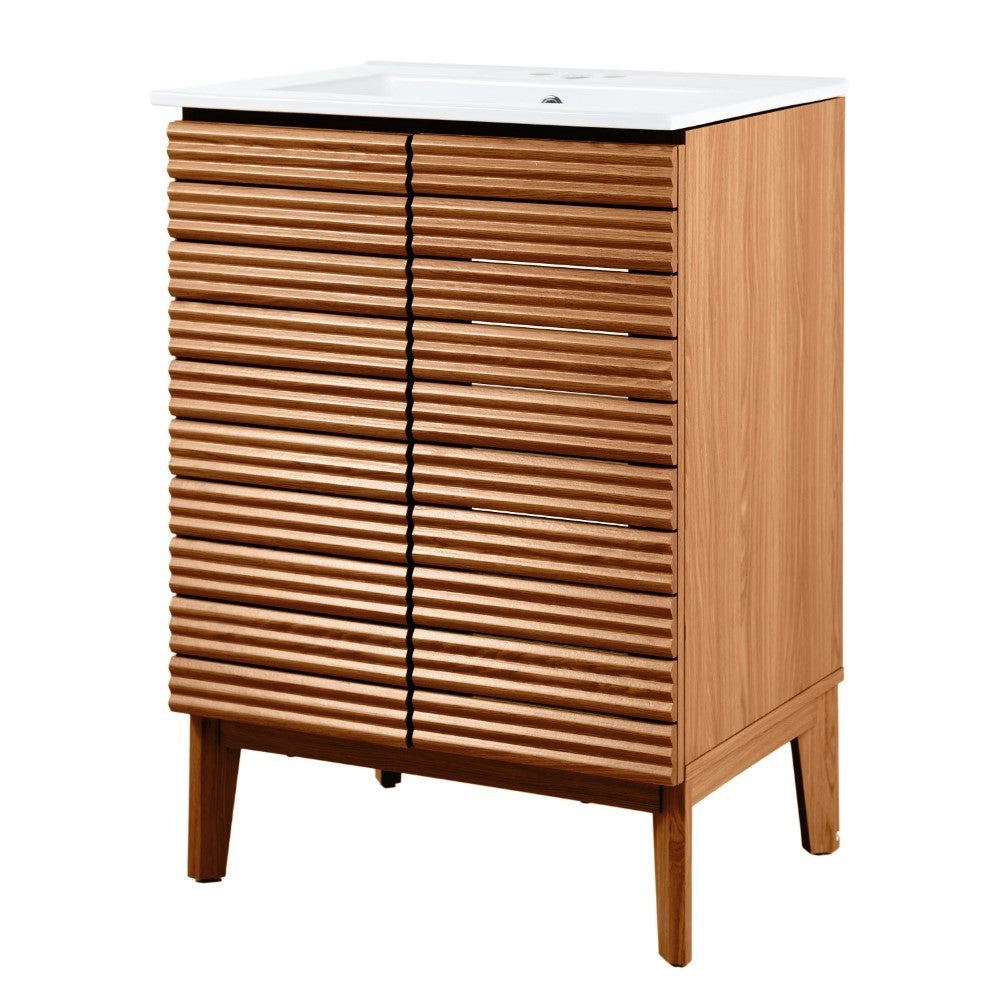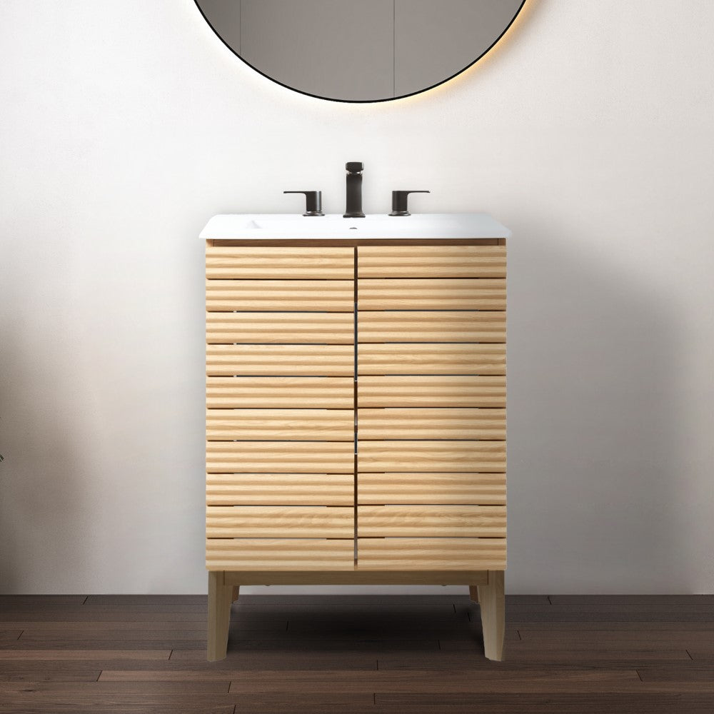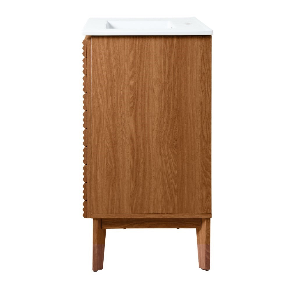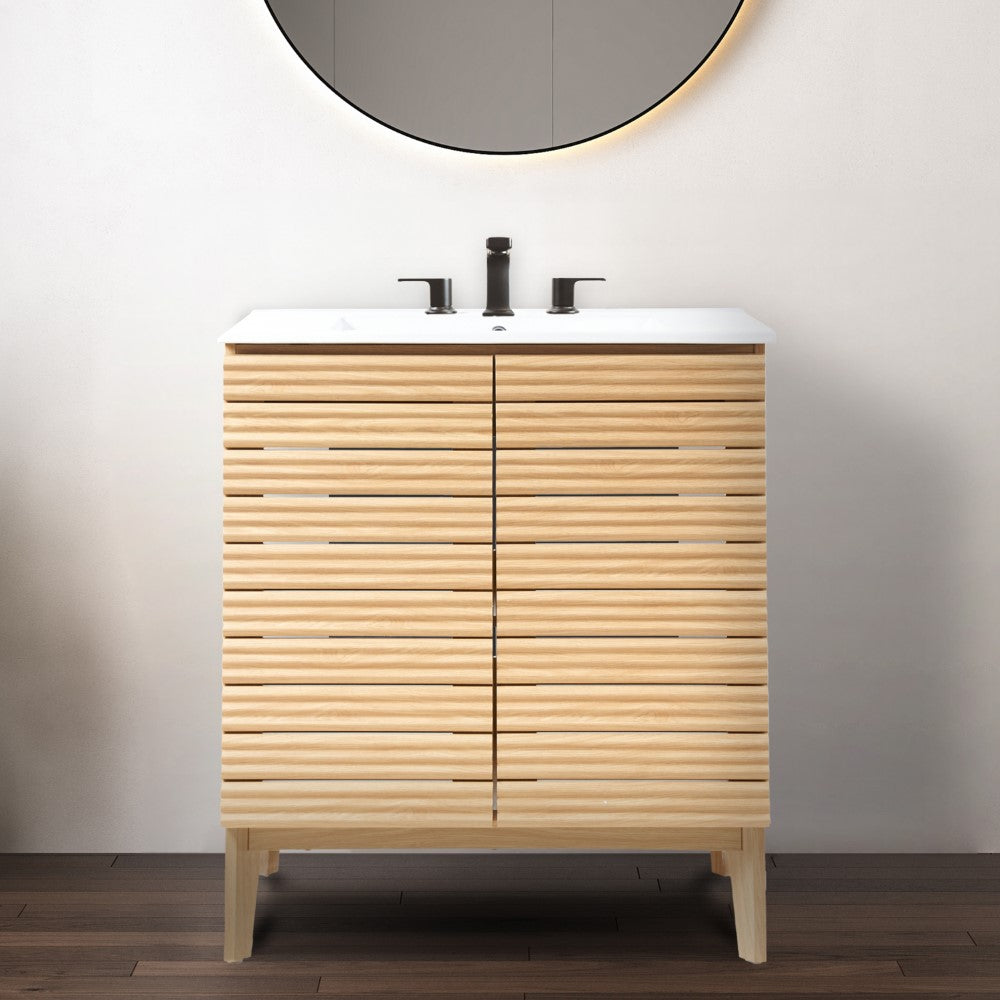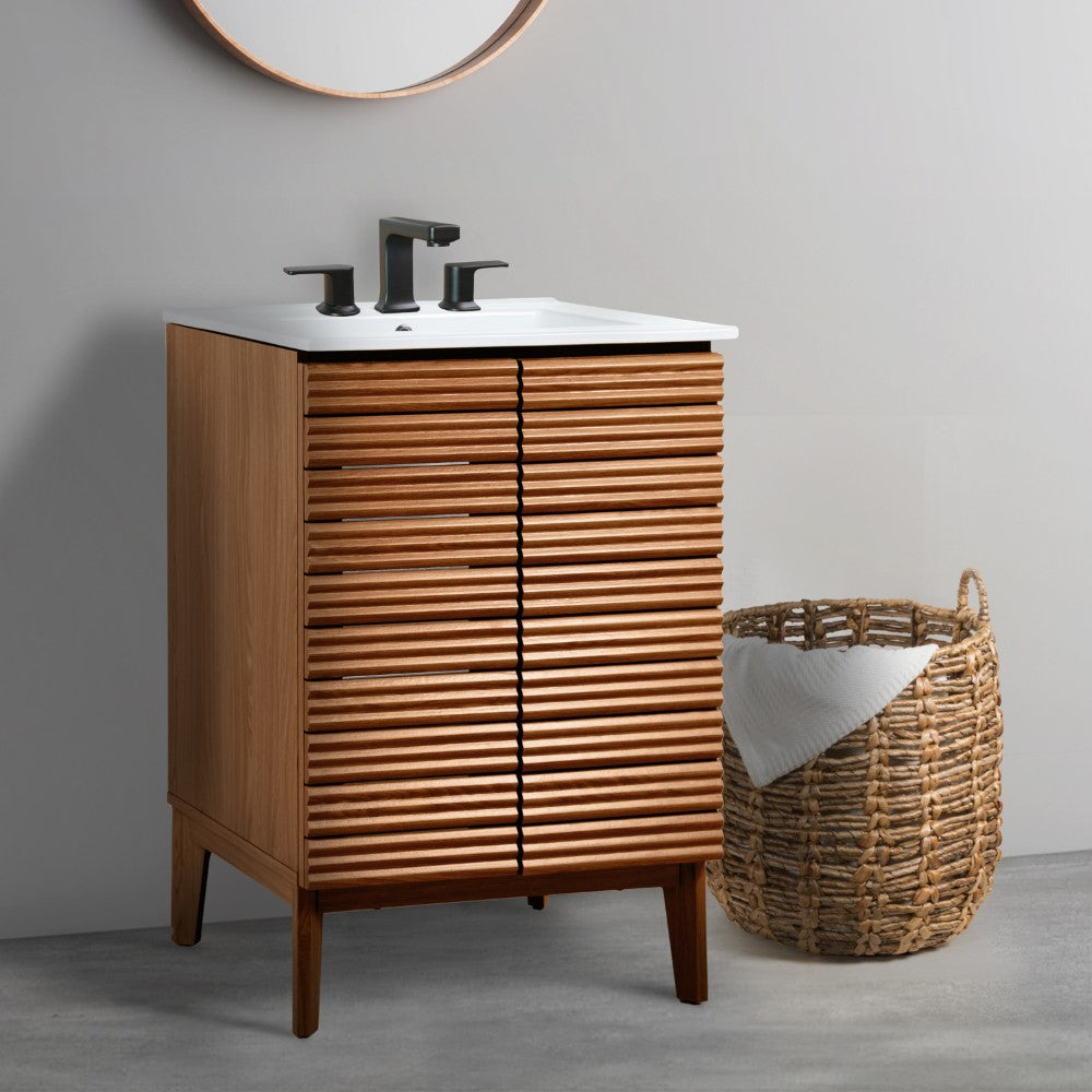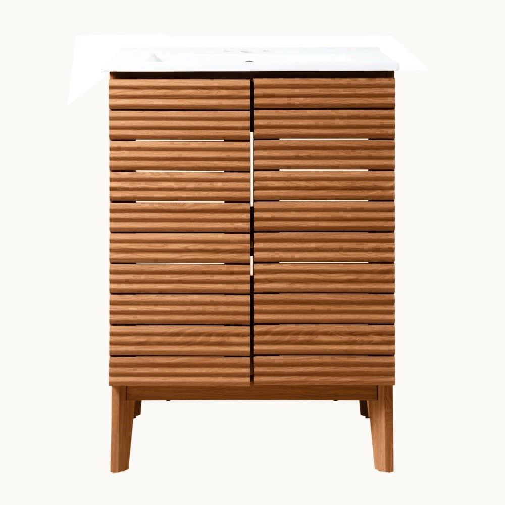 This bath vanity set consists of a 20" ceramic sink basin elevated by a Mediterranean vanity cabinet. With a single door and farmhouse slats, this cabinet adds a touch of southwestern or coastal decor to any bathroom. Whether used in your primary bathroom or powder room, this piece will bring the space together.