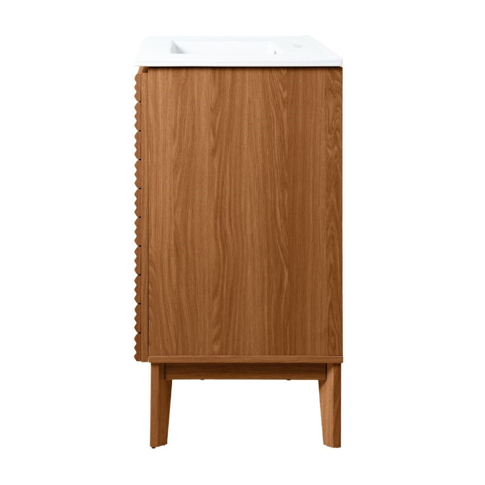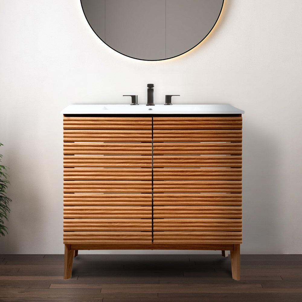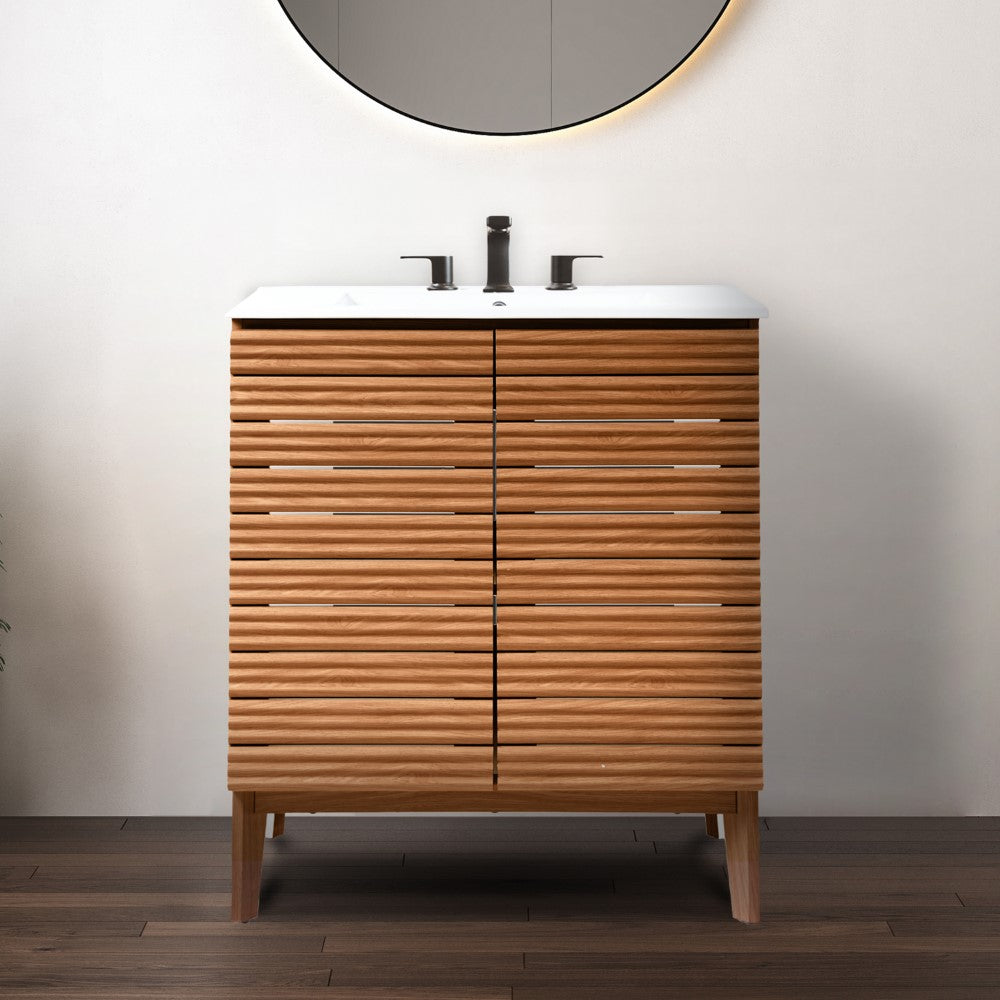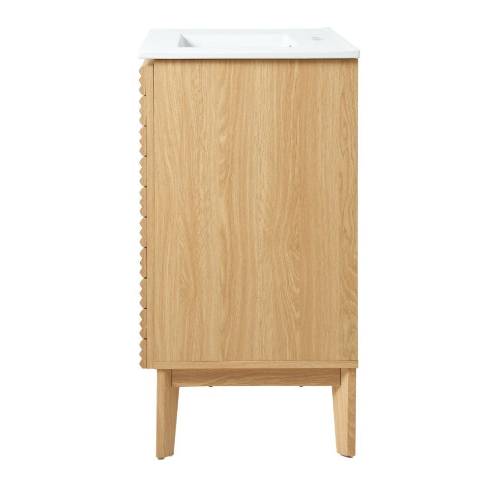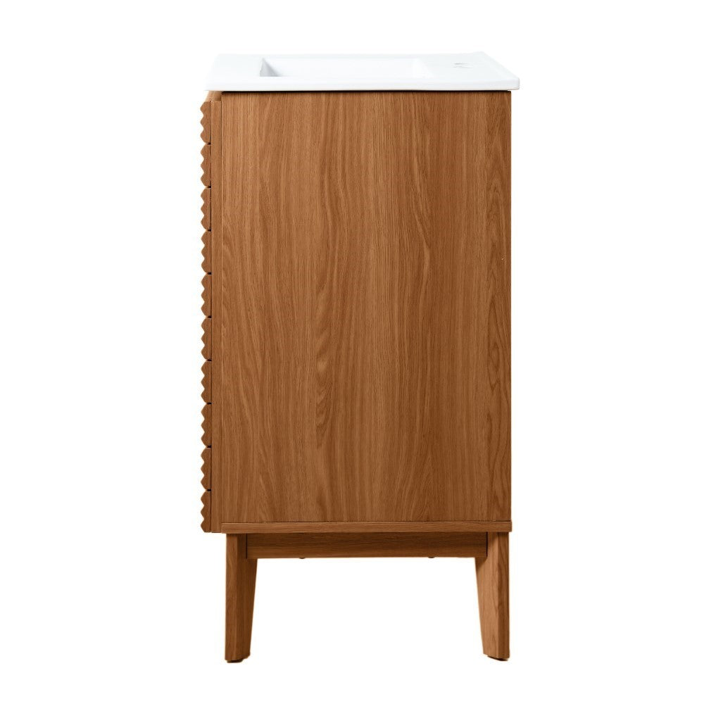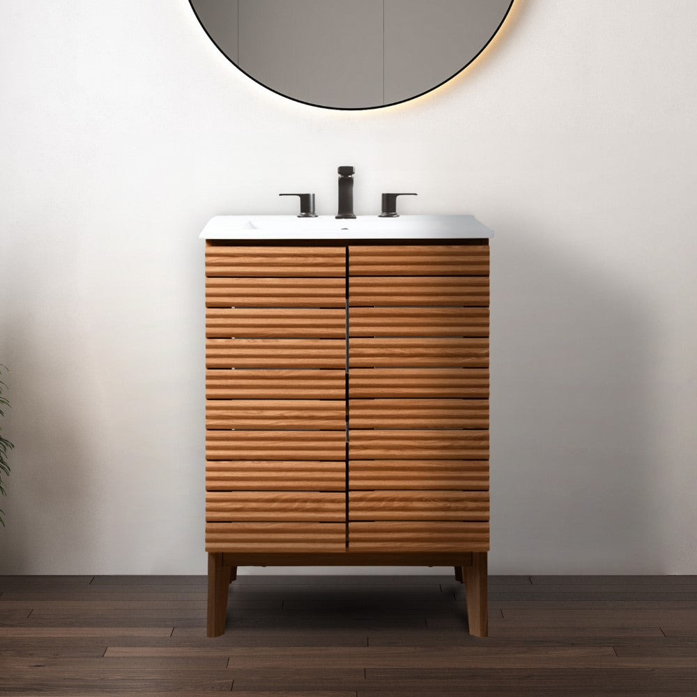 This bath vanity set consists of a 20" ceramic sink basin elevated by a Mediterranean vanity cabinet. With a single door and farmhouse slats, this cabinet adds a touch of southwestern or coastal decor to any bathroom. Whether used in your primary bathroom or powder room, this piece will bring the space together.
