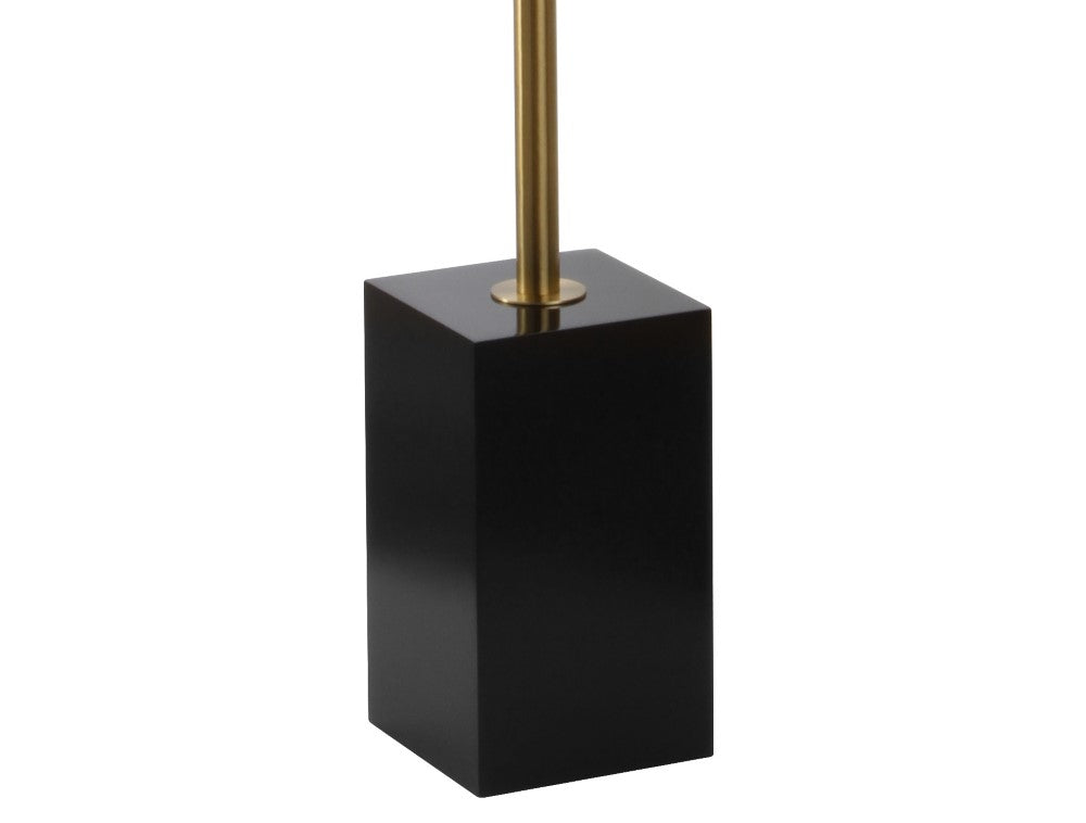 A needle-like body lends sophisticated and eye-catching allure to this contemporary floor lamp. The base is a gorgeous black wood that adds weight and depth in a cubic shape. The body of the lamp is metal and in a brass finish for a gleaming, golden look that accents a round linen drum shade.