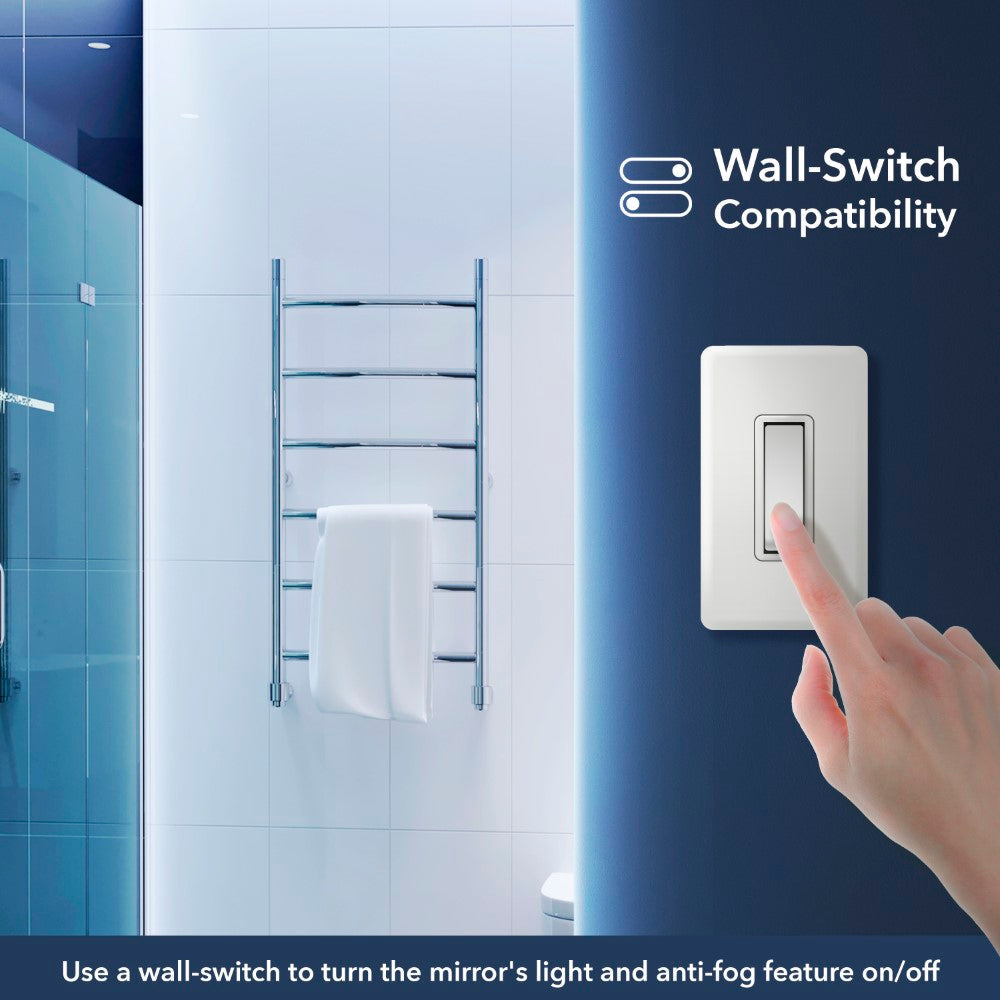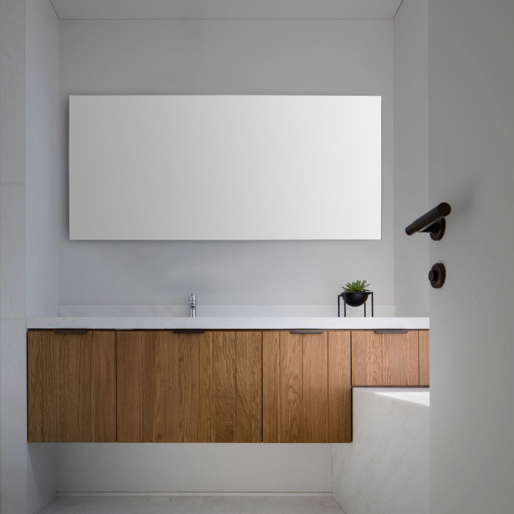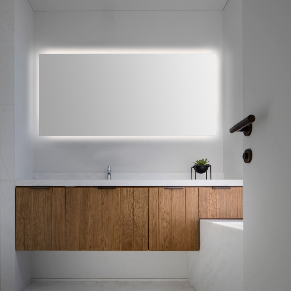 - Modern frameless mirror hangs horizontally or vertically; the backlight adds ambiance and a soft nightlight