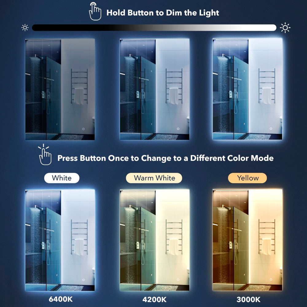 Paige Rectangular Frameless Anti-Fog Aluminum Back-lit Tri-color LED Bathroom Vanity Mirror with Smart Touch Control