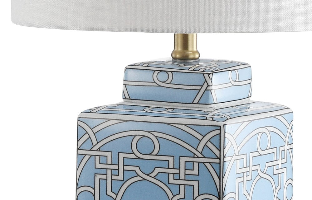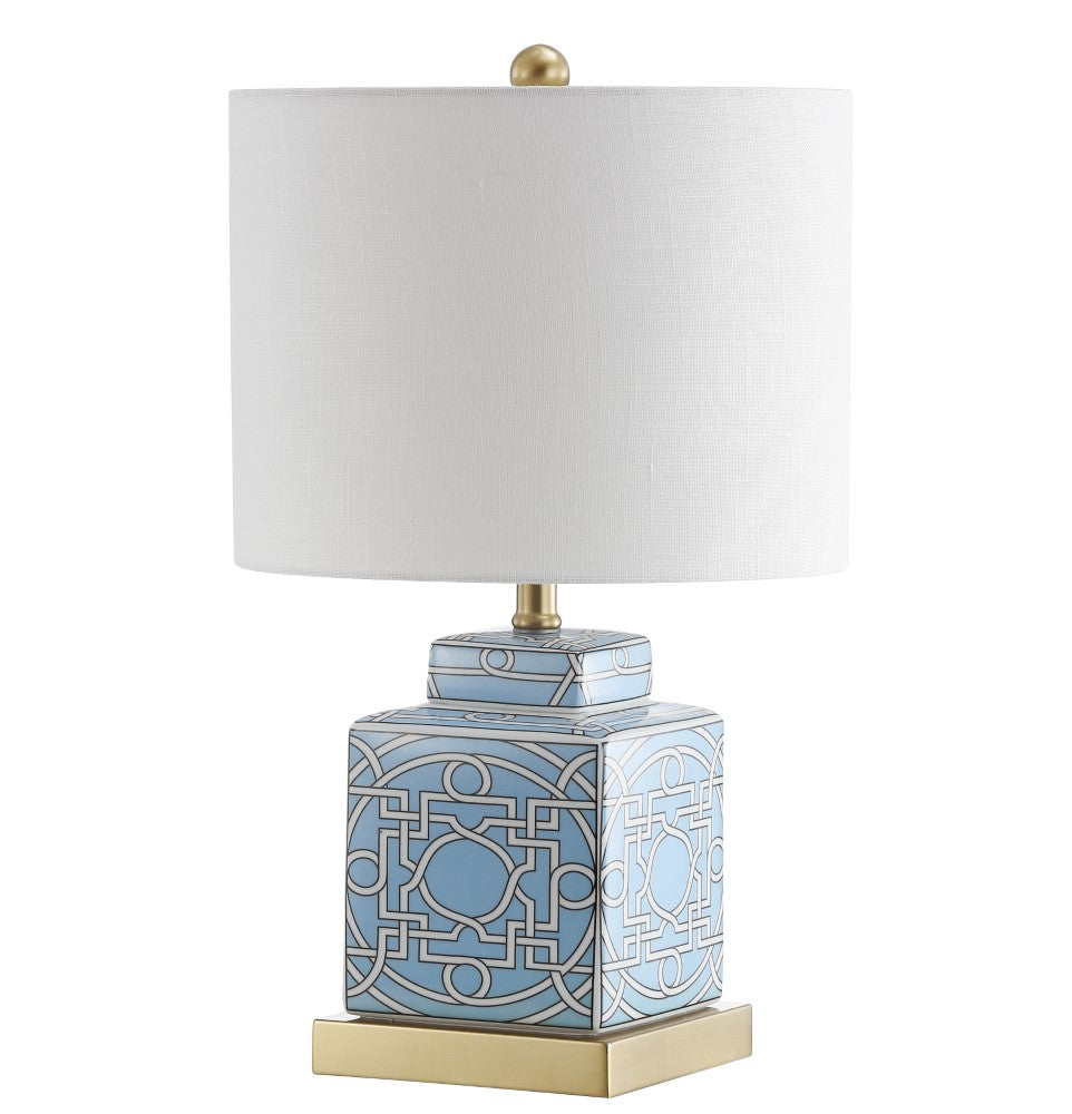 The fretwork of Moroccan tiles inspired the lattice pattern that adorns the ceramic base of this table lamp. Set upon a brass pediment with matching finial, the classic blue and gold combo lends an air of tradition to this modern style. At 22", it's the perfect scale for a console or nightstand.