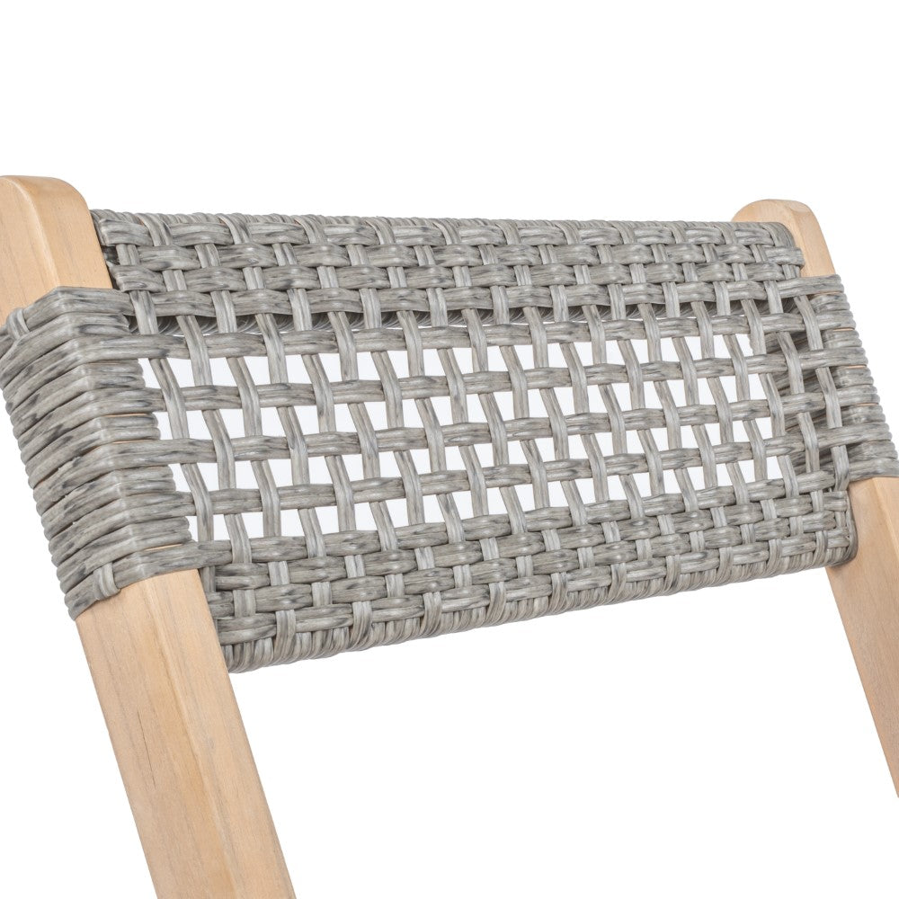 - The solid wood frame is has a light teak matte finish for a weathered look; backs are woven poly rope in gray