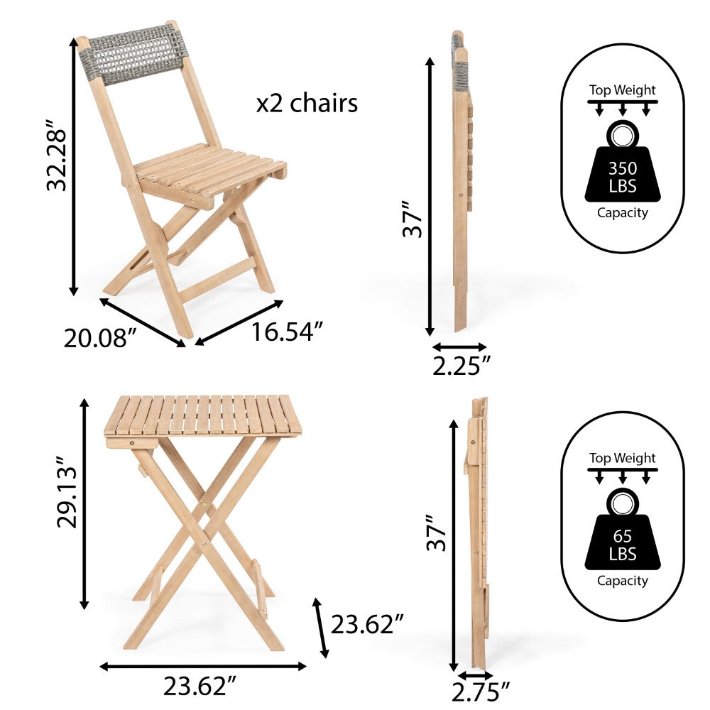 Monterey Modern Mid-Century 3-Piece Roped Acacia Wood Outdoor Folding Bistro Set
