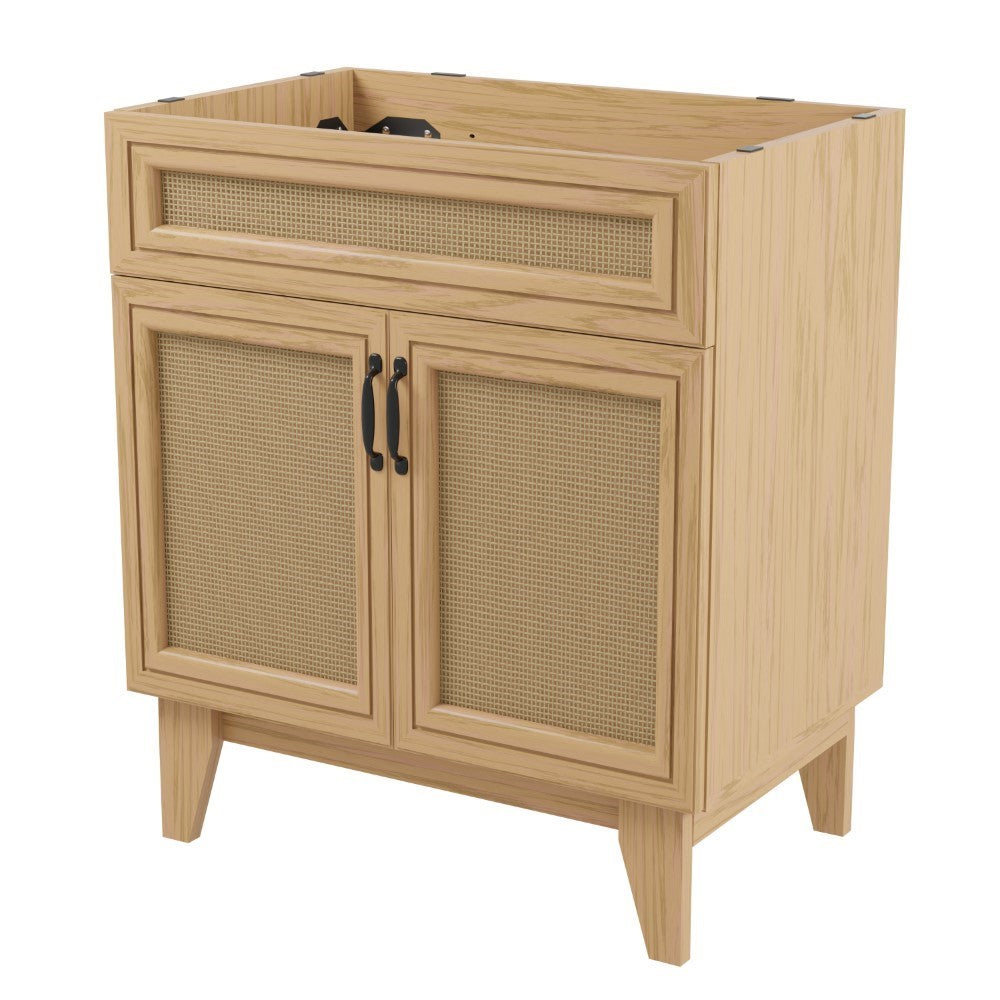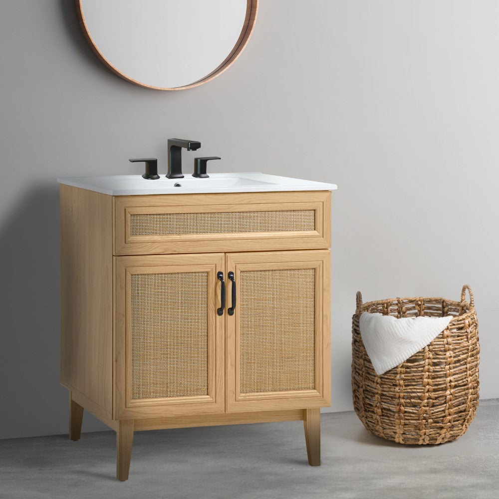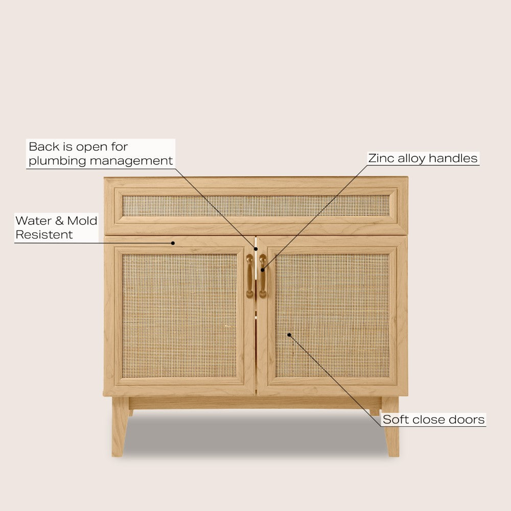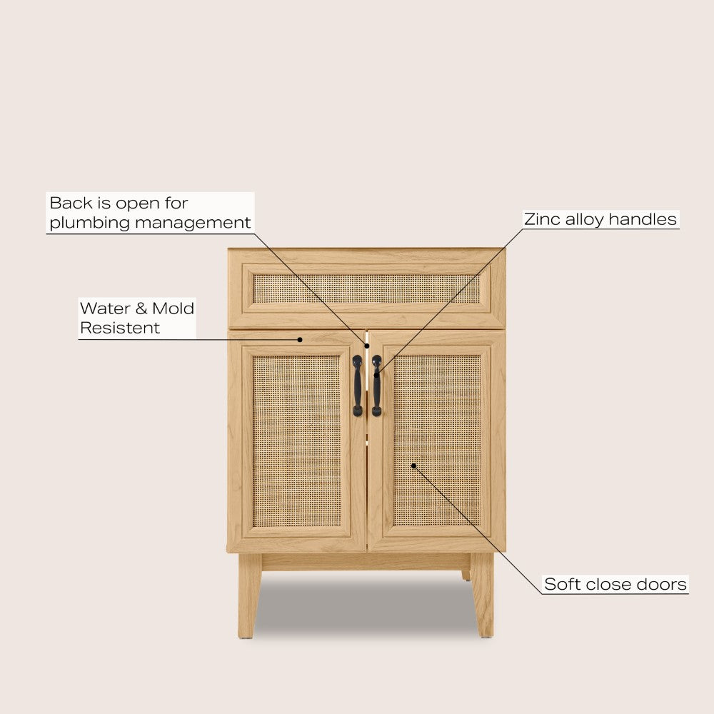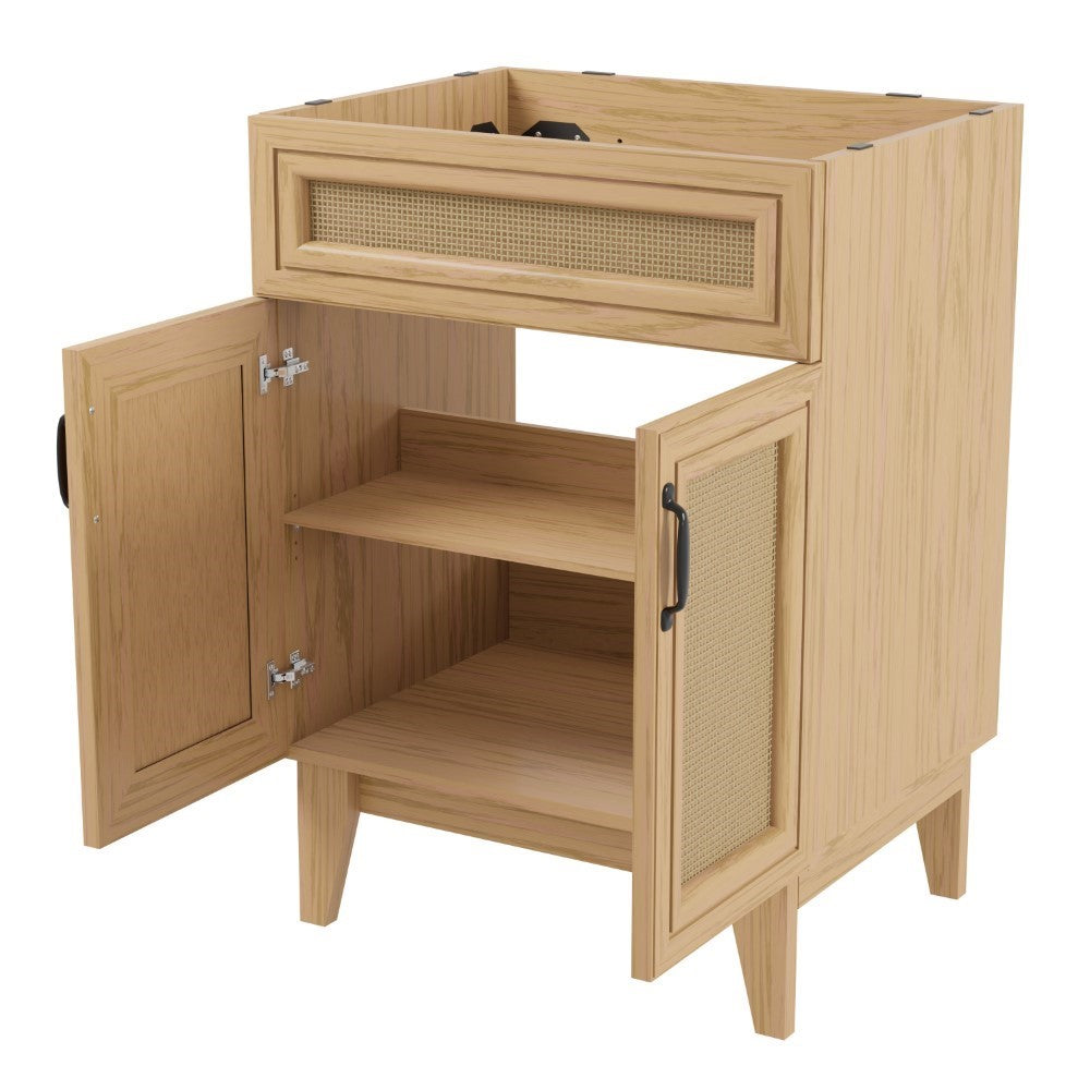 - This vanity cabinet's matte oak frame is complemented by cane paneling, bringing a touch of bohemian decor to any bathroom