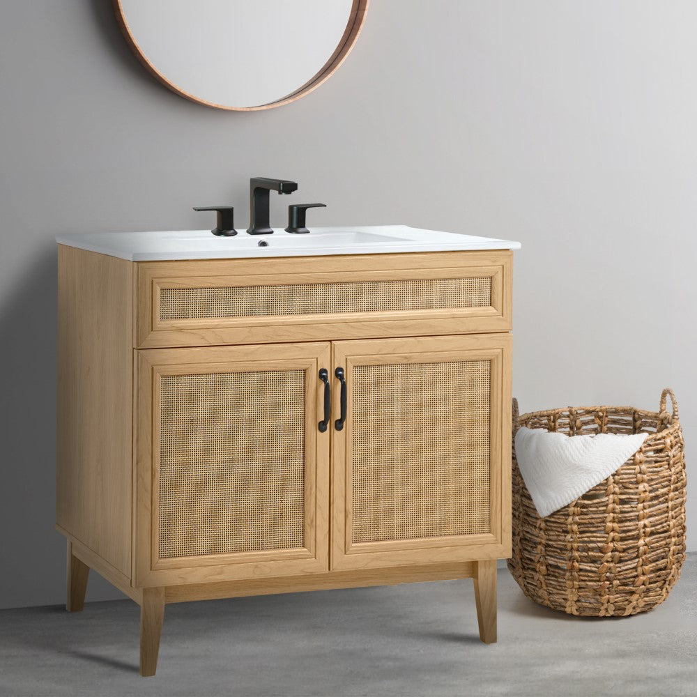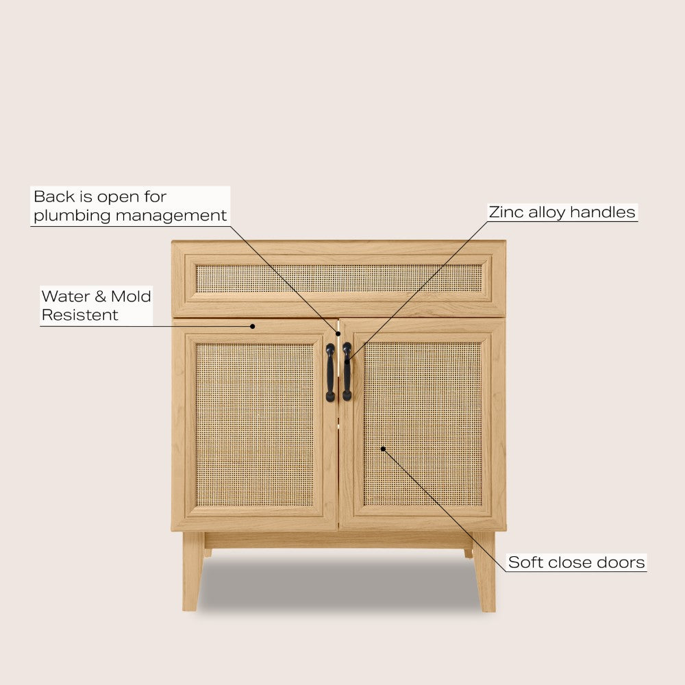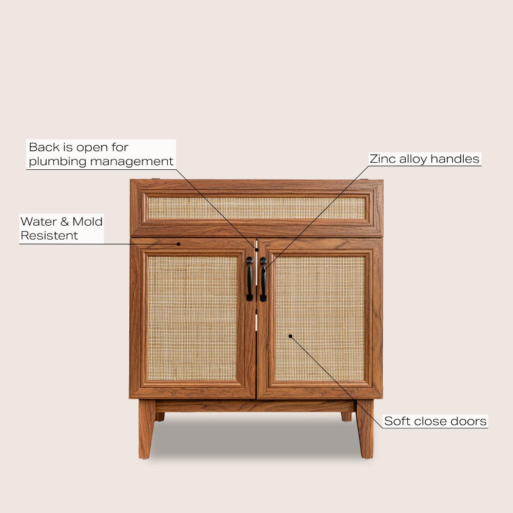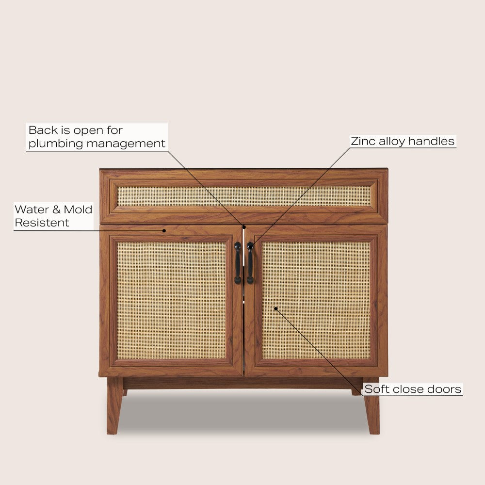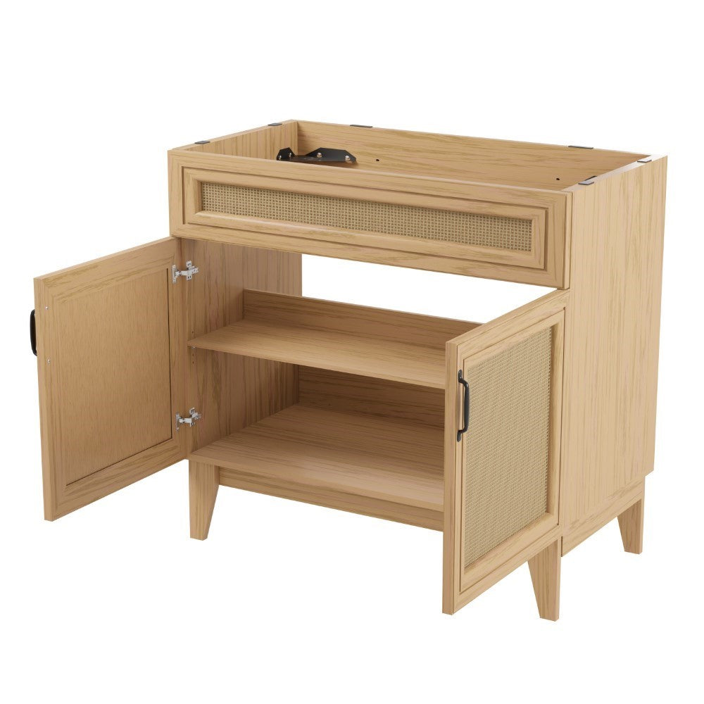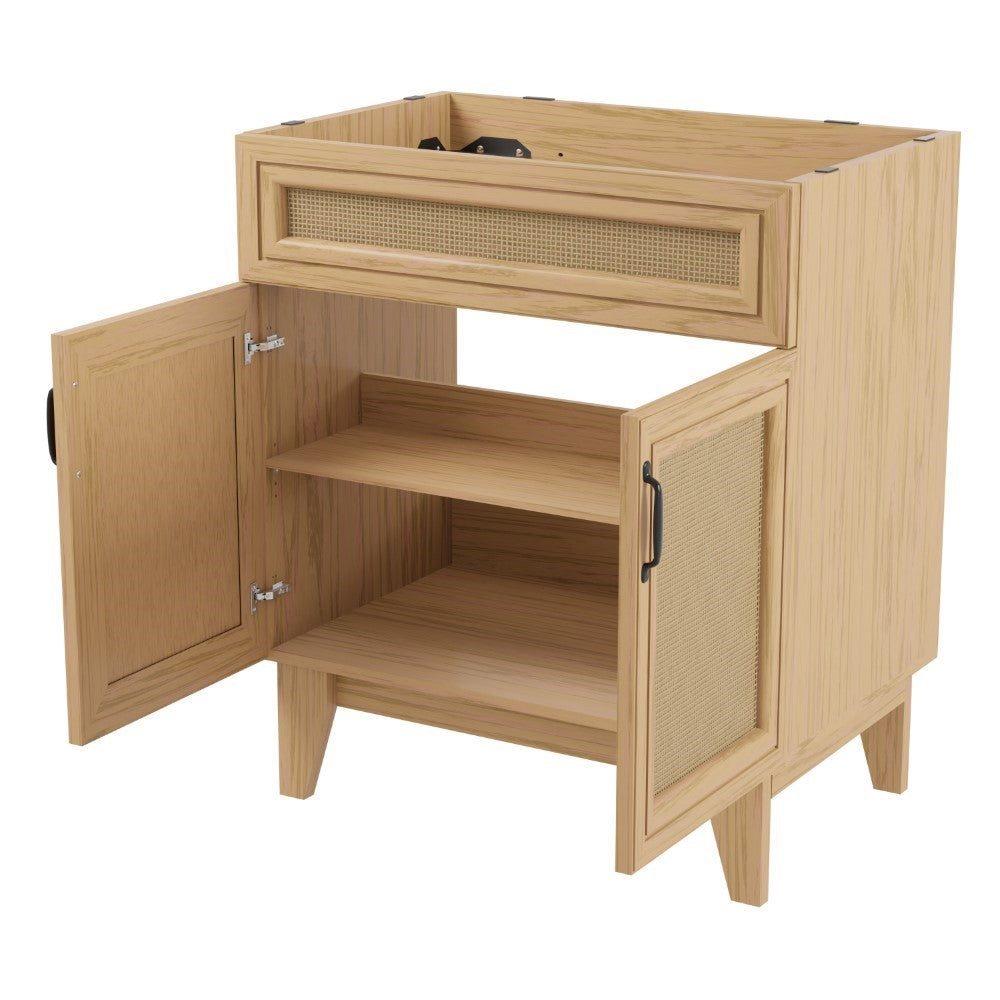 - This vanity cabinet's matte oak frame is complemented by cane paneling, bringing a touch of bohemian decor to any bathroom