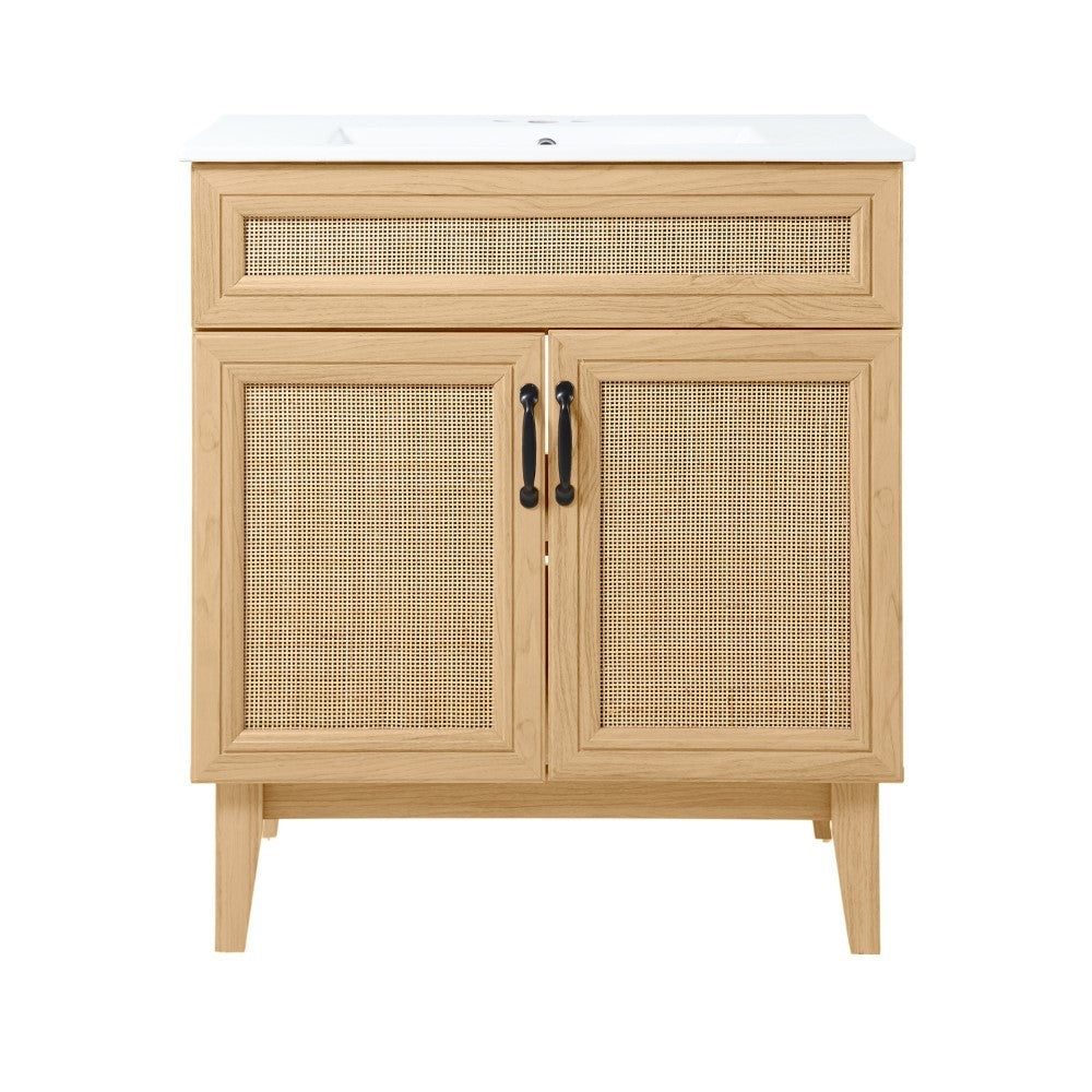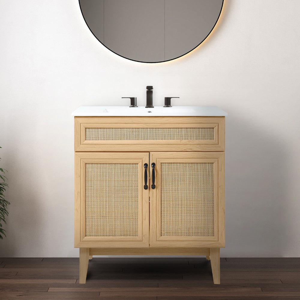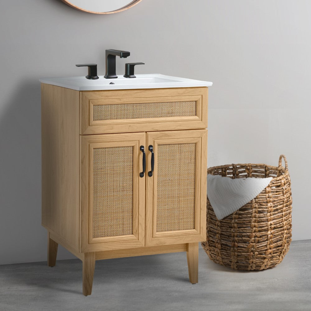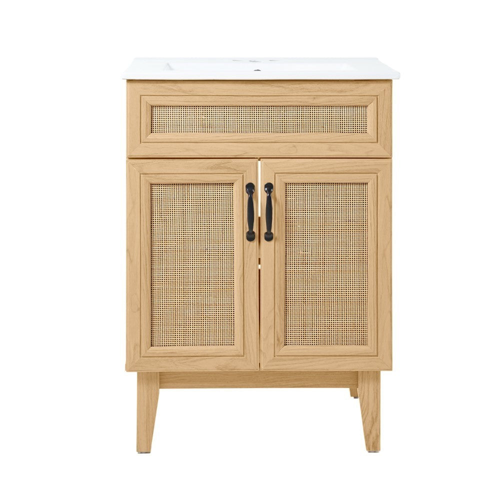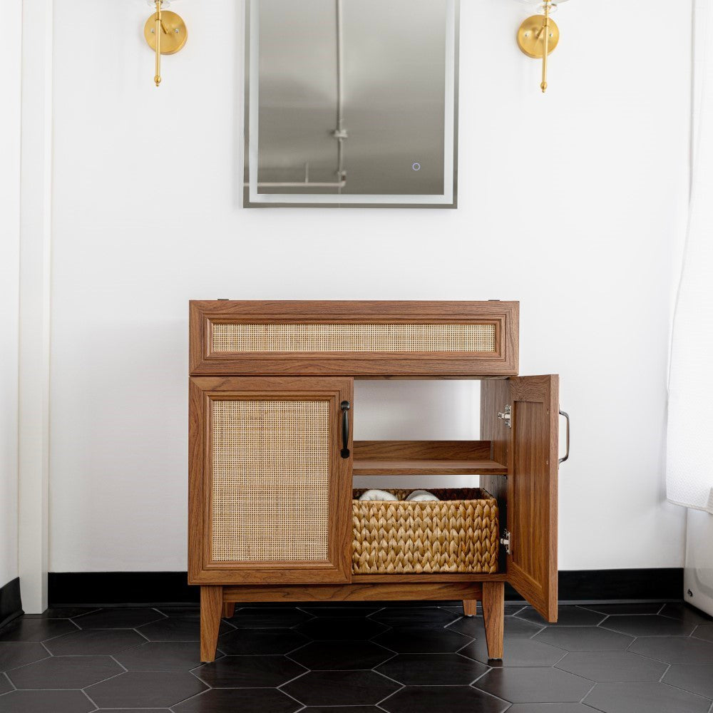 - This vanity cabinet's matte oak frame is complemented by cane paneling, bringing a touch of bohemian decor to any bathroom