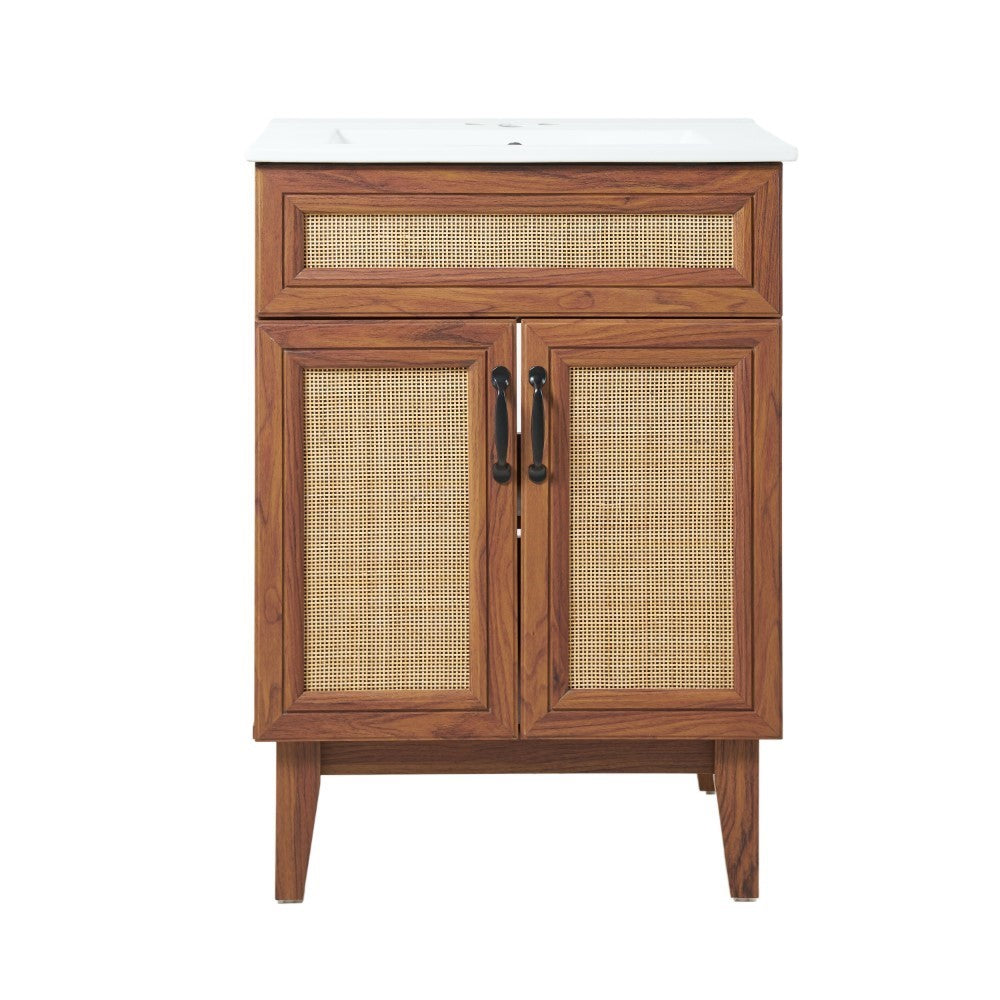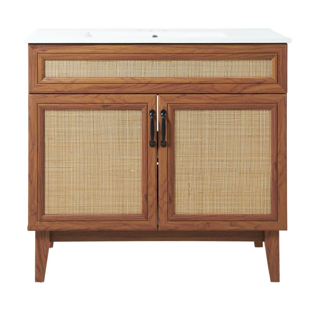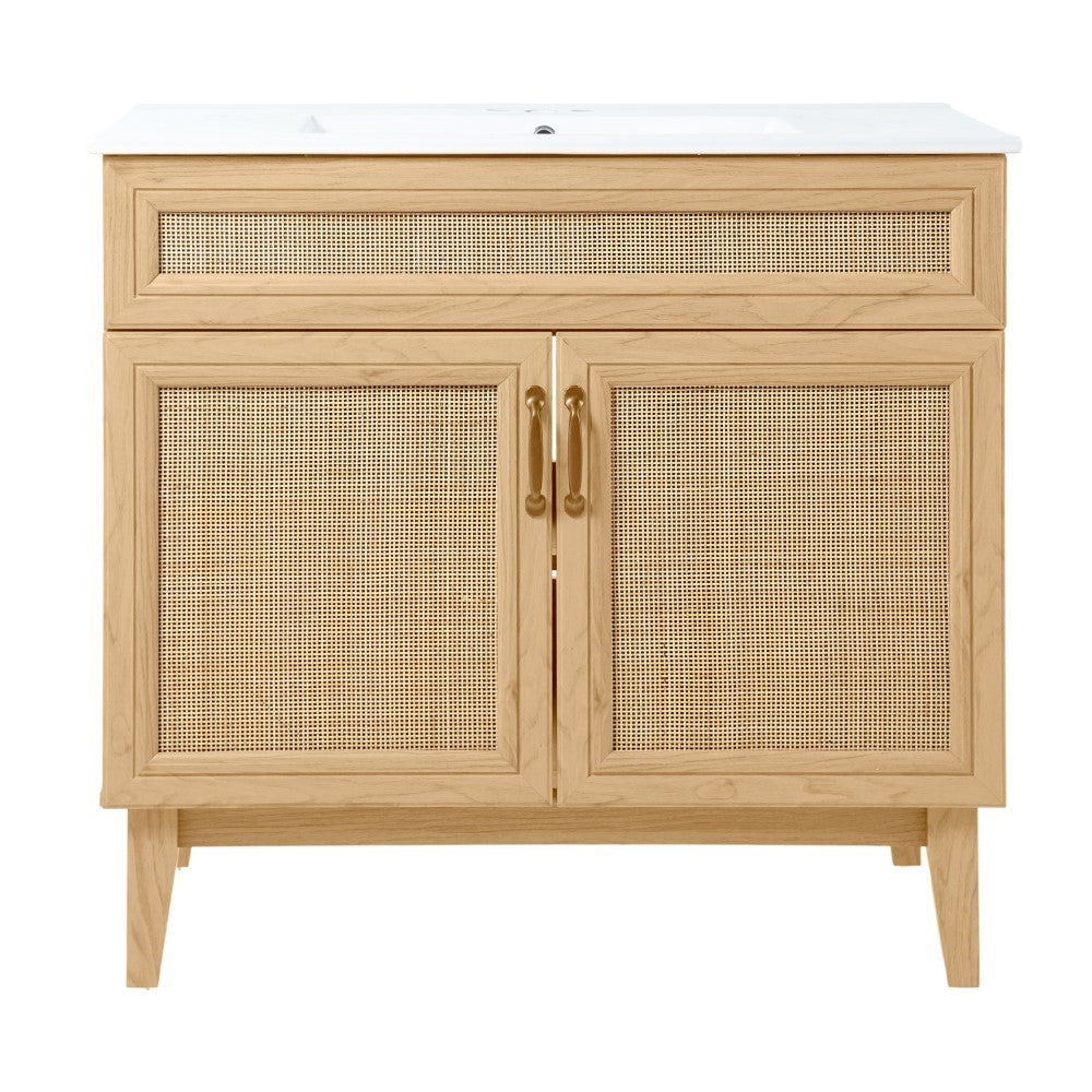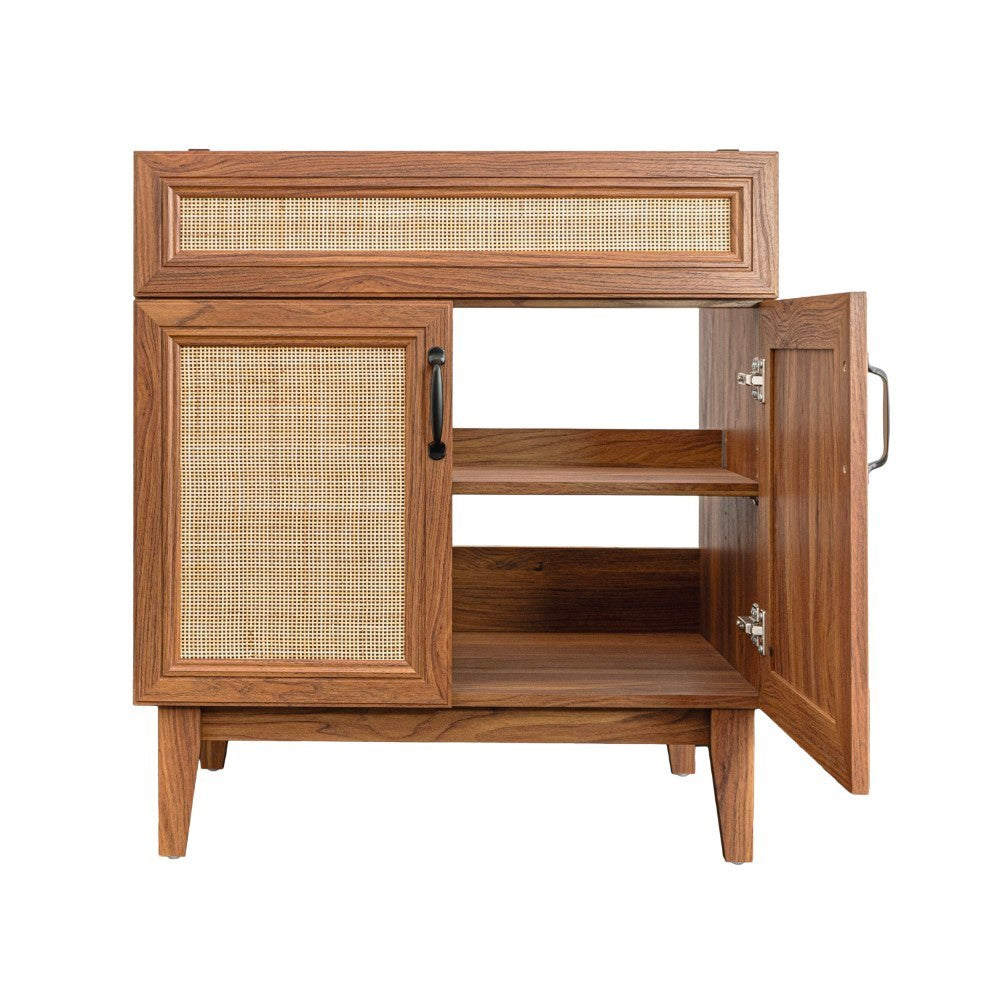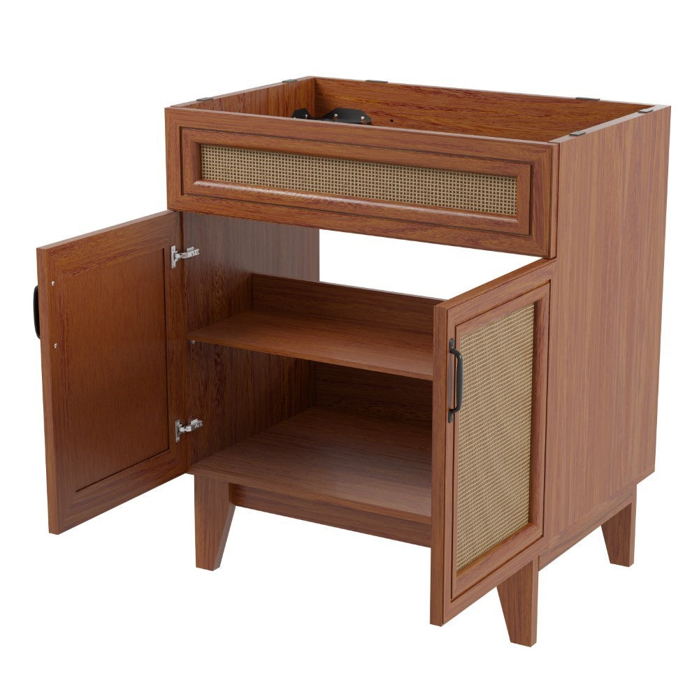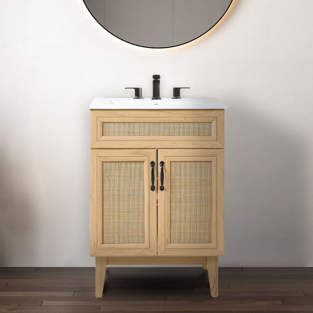 - This vanity cabinet's matte oak frame is complemented by cane paneling, bringing a touch of bohemian decor to any bathroom