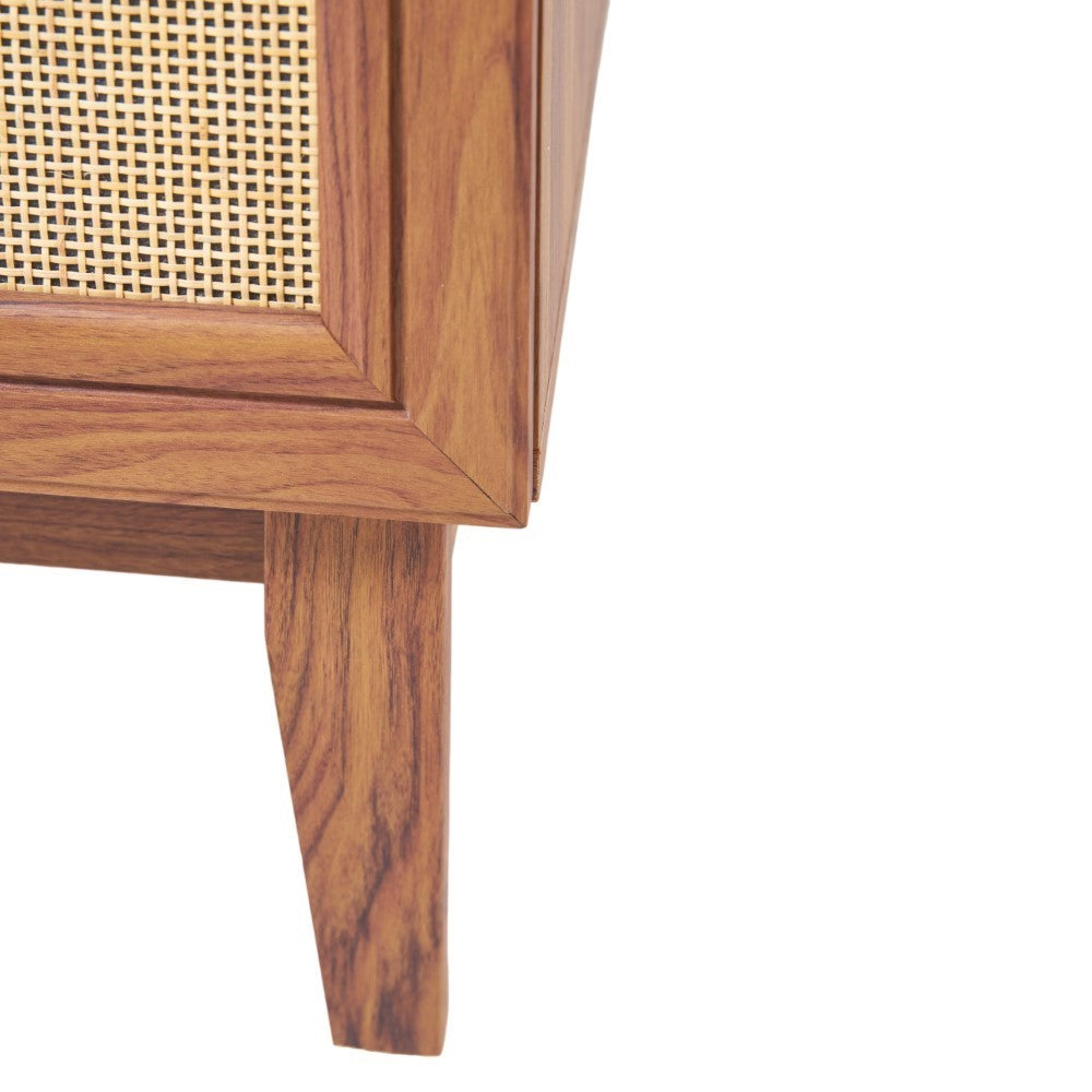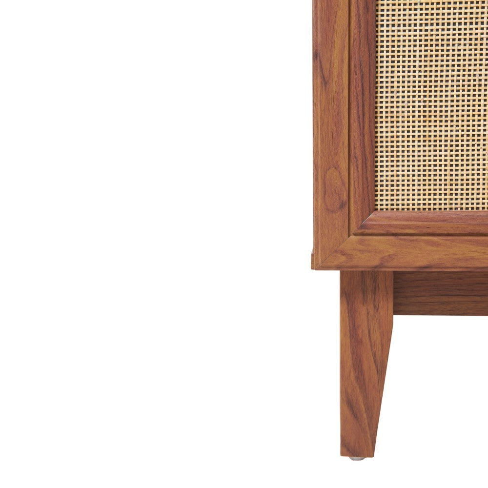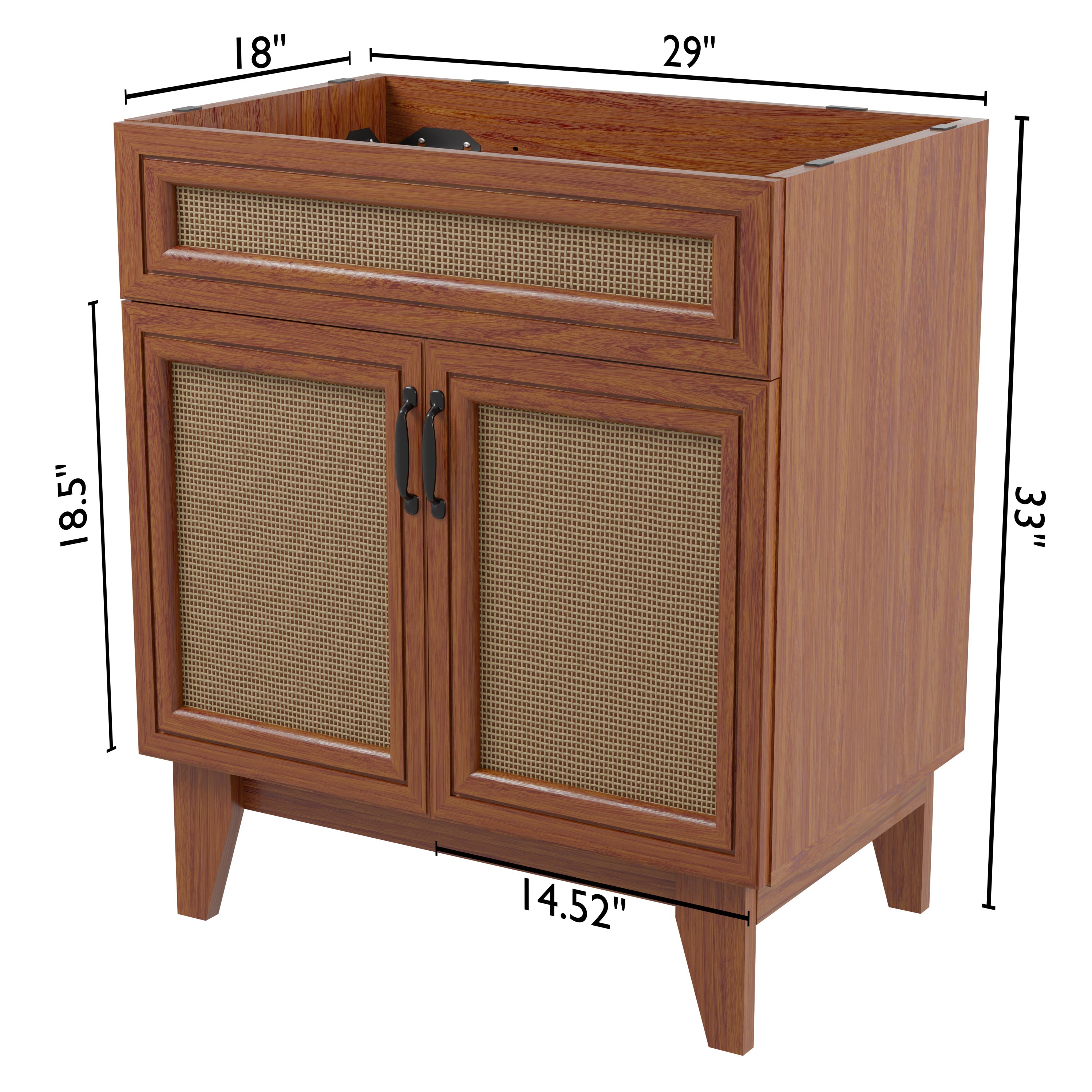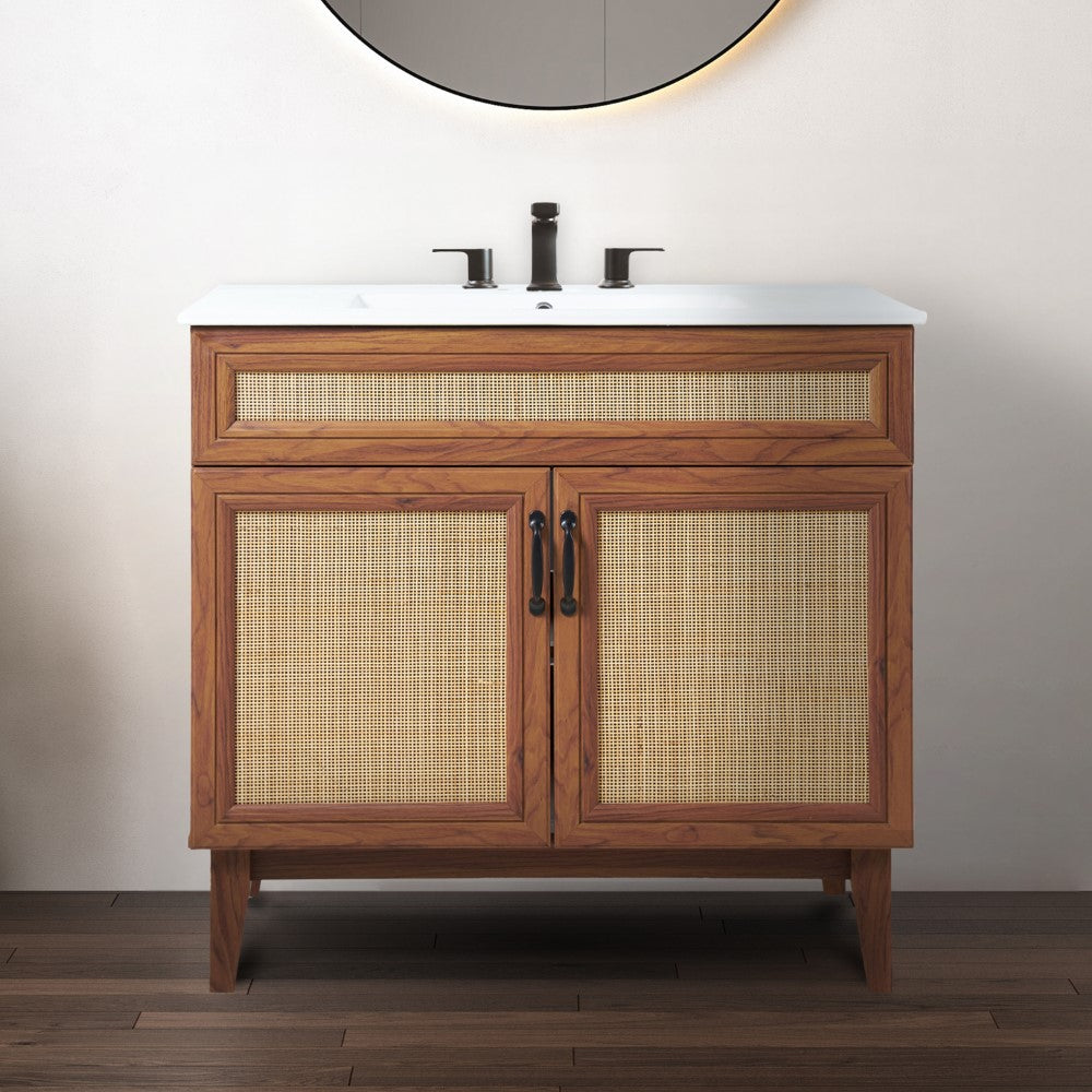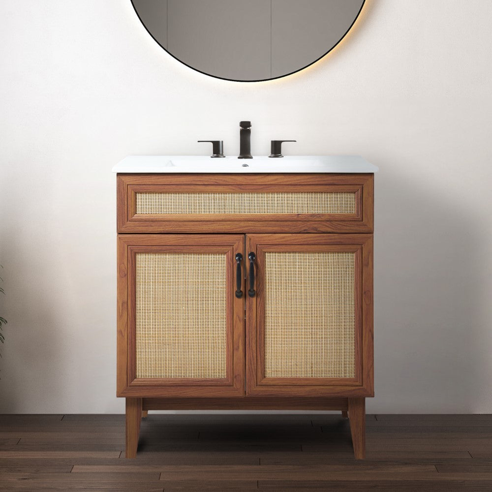 - This vanity cabinet's matte oak frame is complemented by cane paneling, bringing a touch of bohemian decor to any bathroom