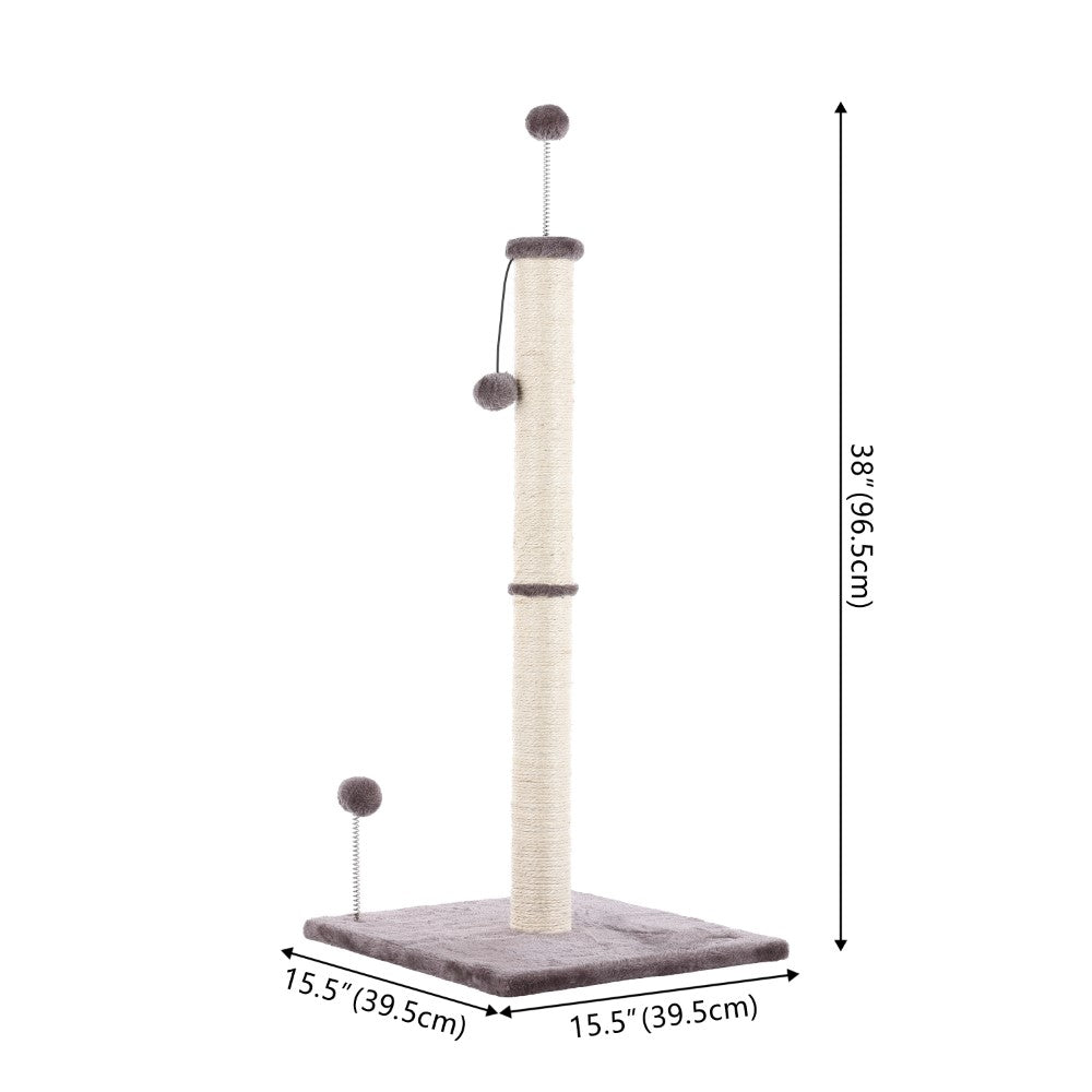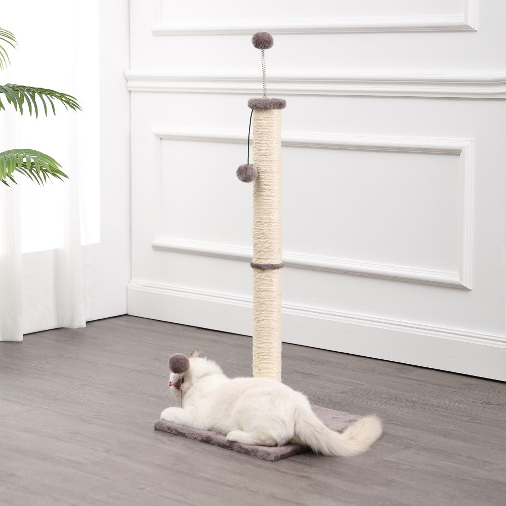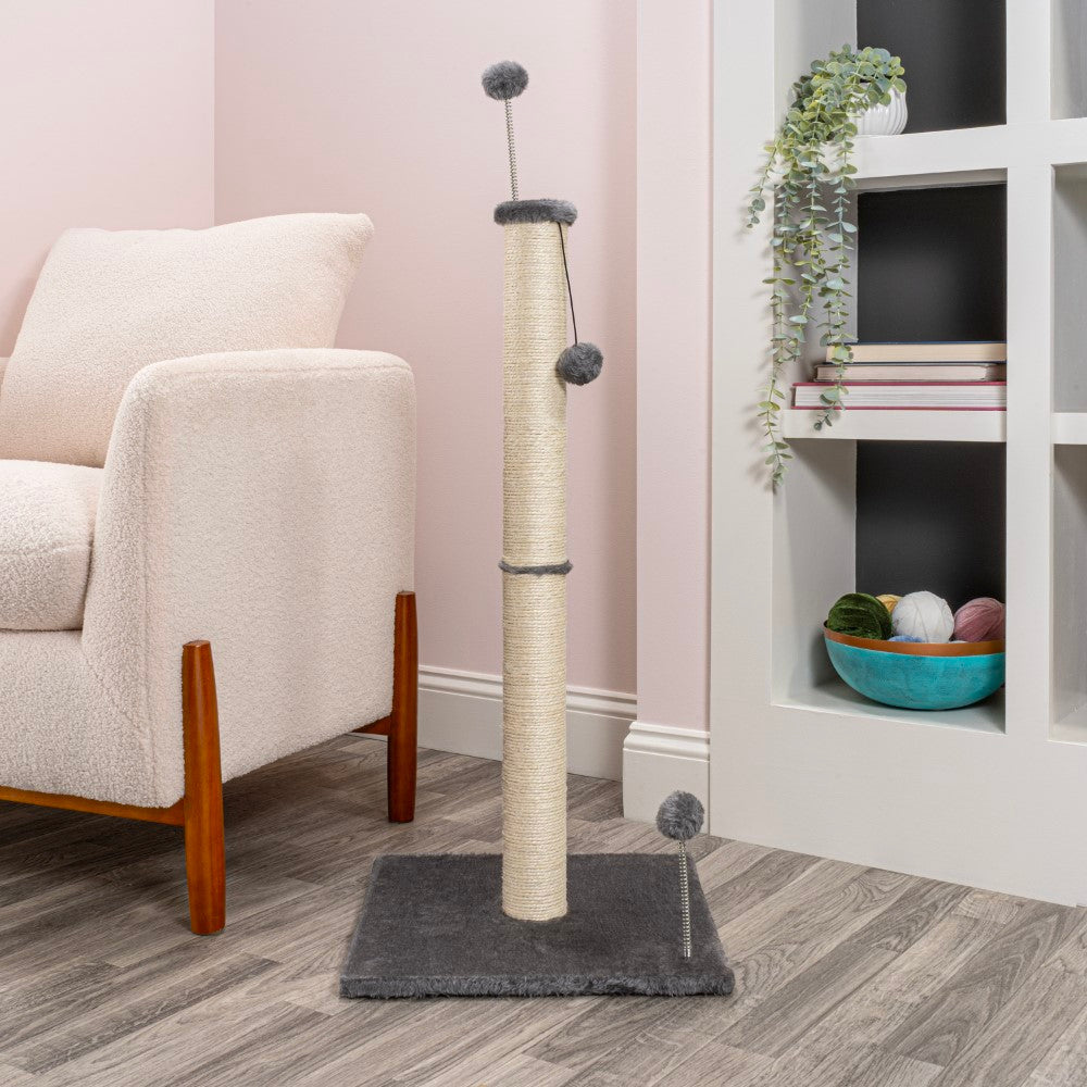 Keep your cats happy and healthy with our modern, sturdy cat scratching post. Covered in durable jute, with a wide base covered in plush fabric and dangling cat toys. Slim design is perfect for a bedroom or living room.