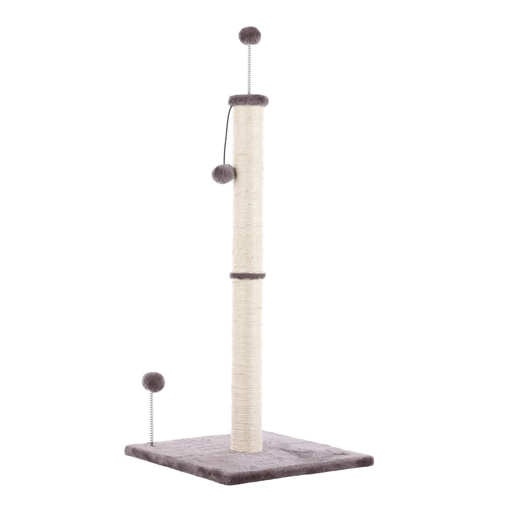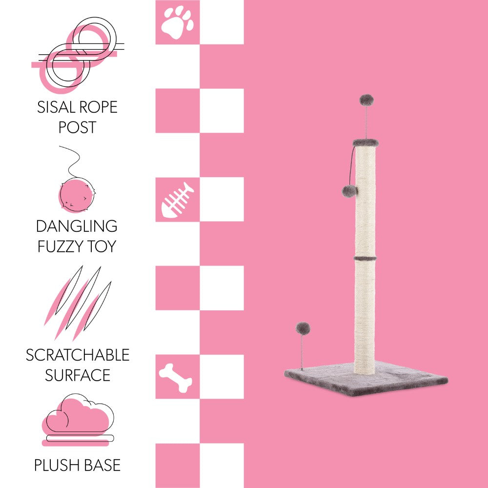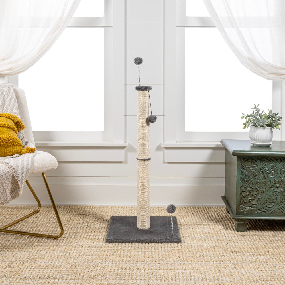 - Natural jute post is accented by plush gray fabric