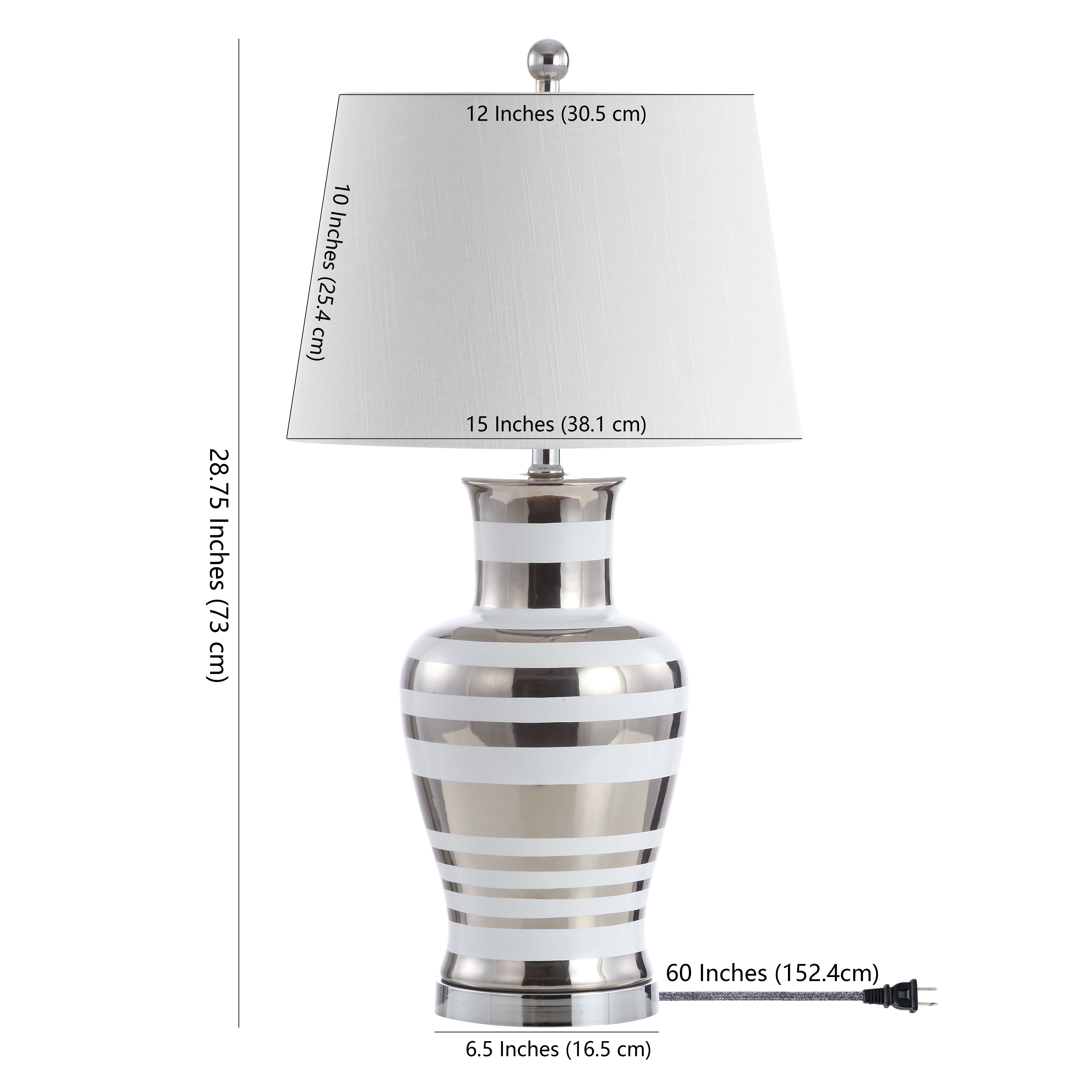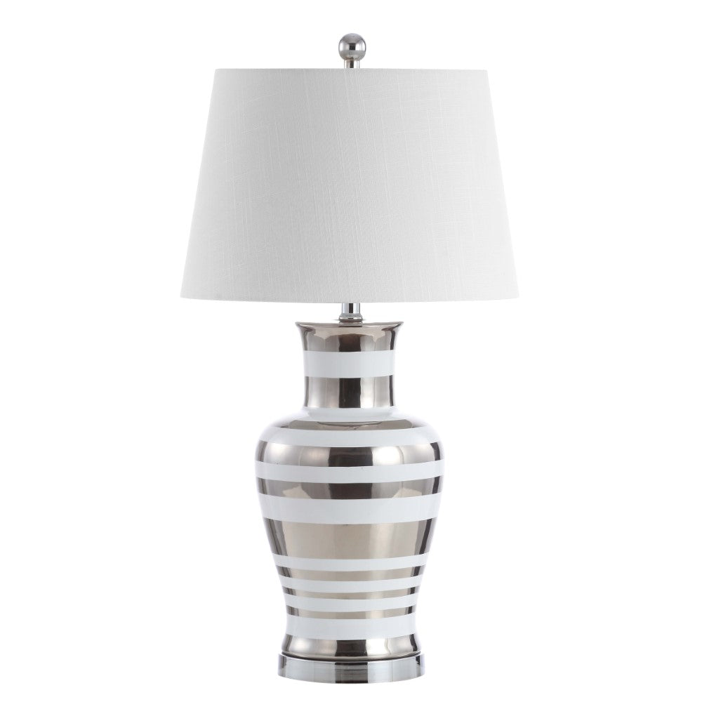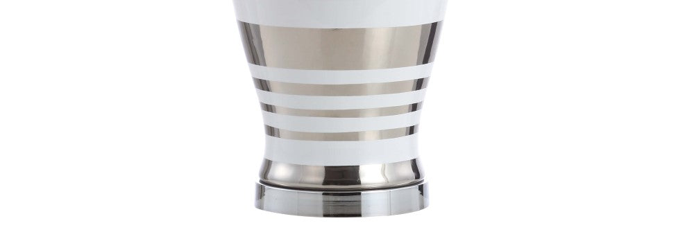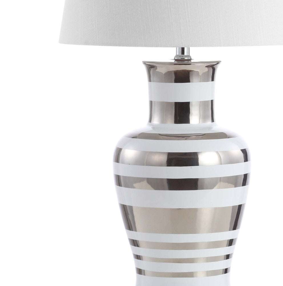 Our modern take on a classic lamp features silver stripes on a white ceramic base. Try a pair of these fresh, modern lamps in a bedroom, living room, or entry console. Add sparkle to a Hollywood Regency room; the drum shade suits modern interiors. Includes an energy-saving LED bulb.