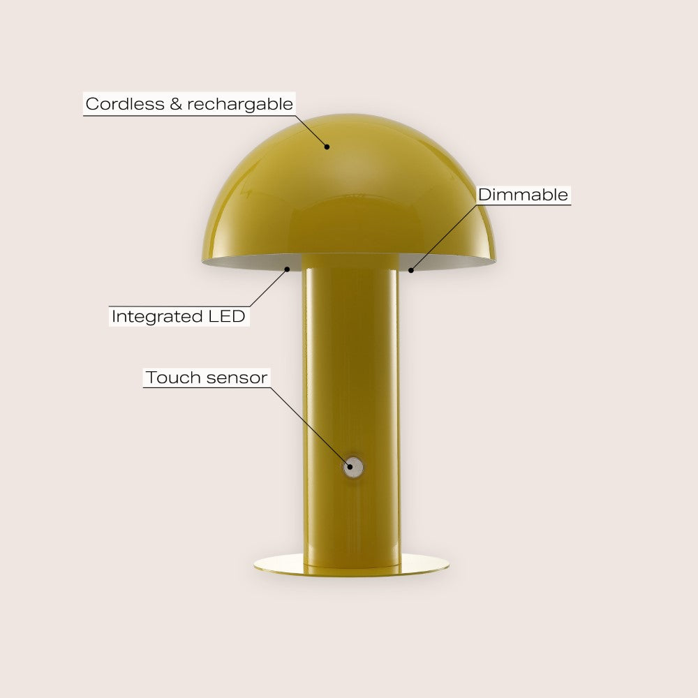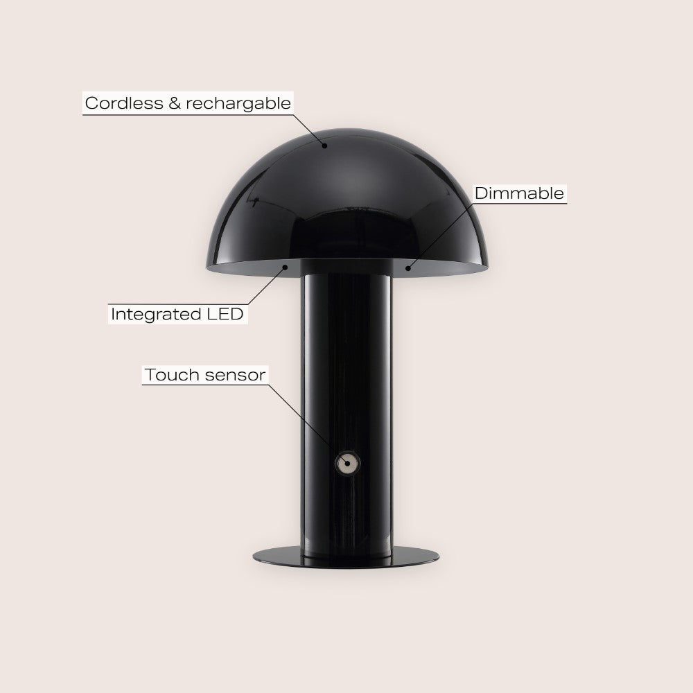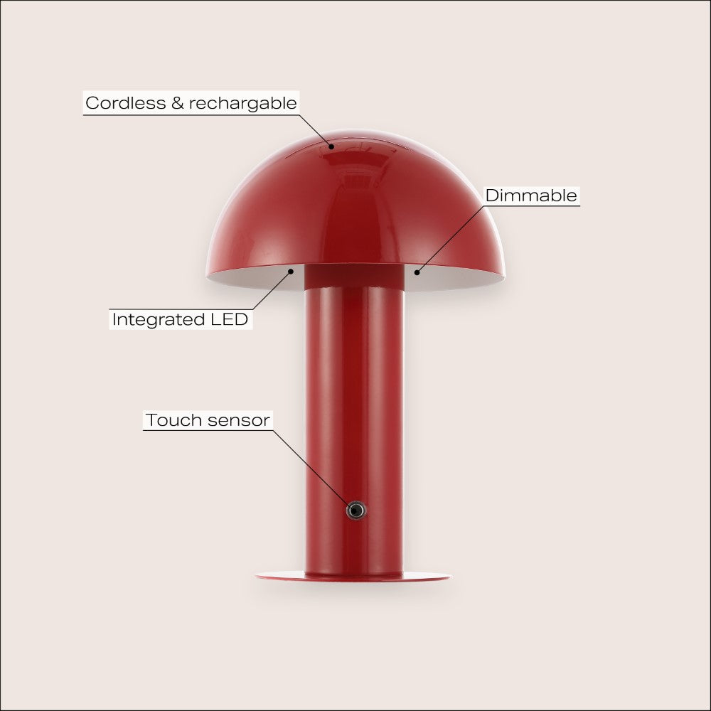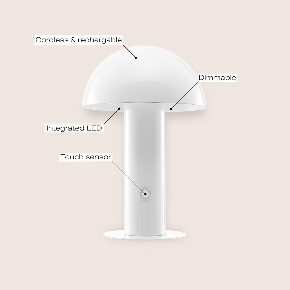 Our portable mushroom lamp's minimalist silhouette is the perfect modern accent for a desk, bar console or vanity. This cordless, rechargeable lamp provides dimmable mood lighting for your dining room, living room, bedroom, or entry. The durable metal design features integrated LED bulbs and a touch sensor to control the three brightness settings.
