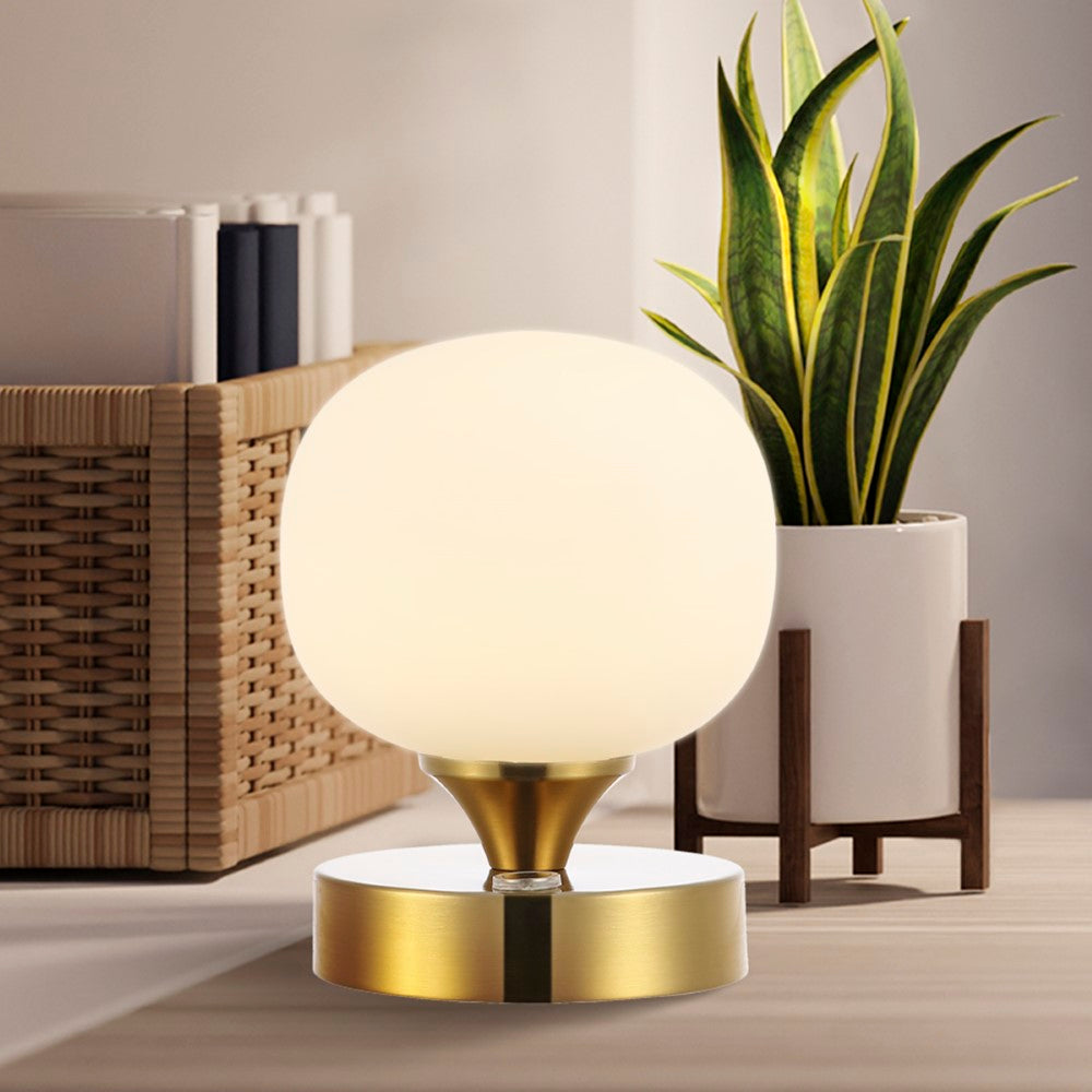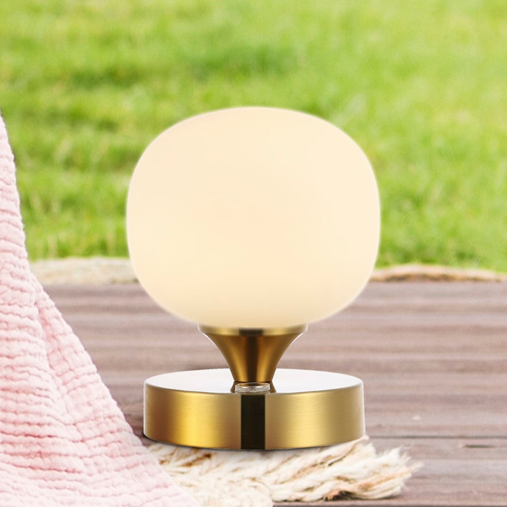 - This cordless lamp has a modern minimalist look with its frosted globe shade and classic nickel finish