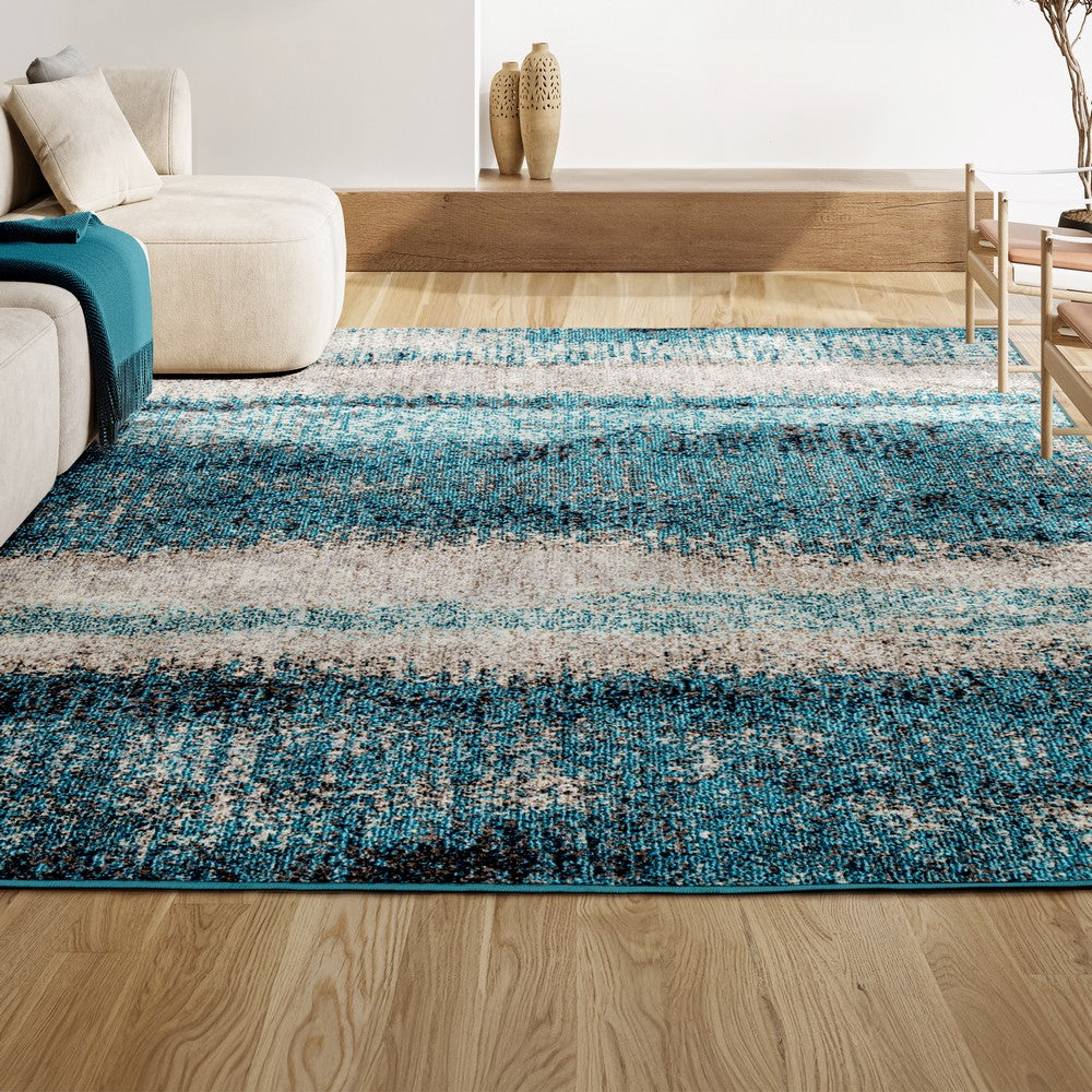 Broad strokes of color inspire this painterly rug. Bold design with a tranquil effect, the super soft polypropylene is power loomed for the tightest possible weave, making the design look even more stunning in person. In shades of blue, aqua, beige, green, and gray it has a mélange of hues that would suit many design styles.
