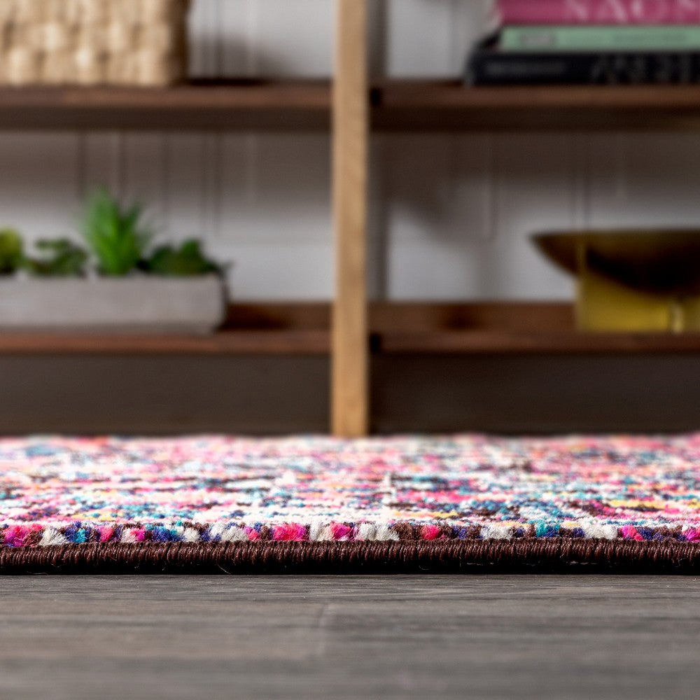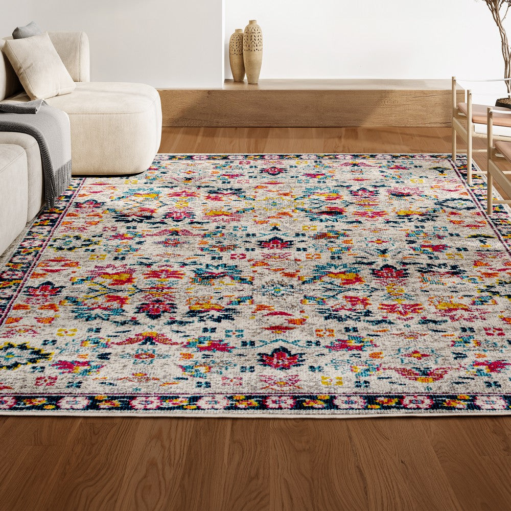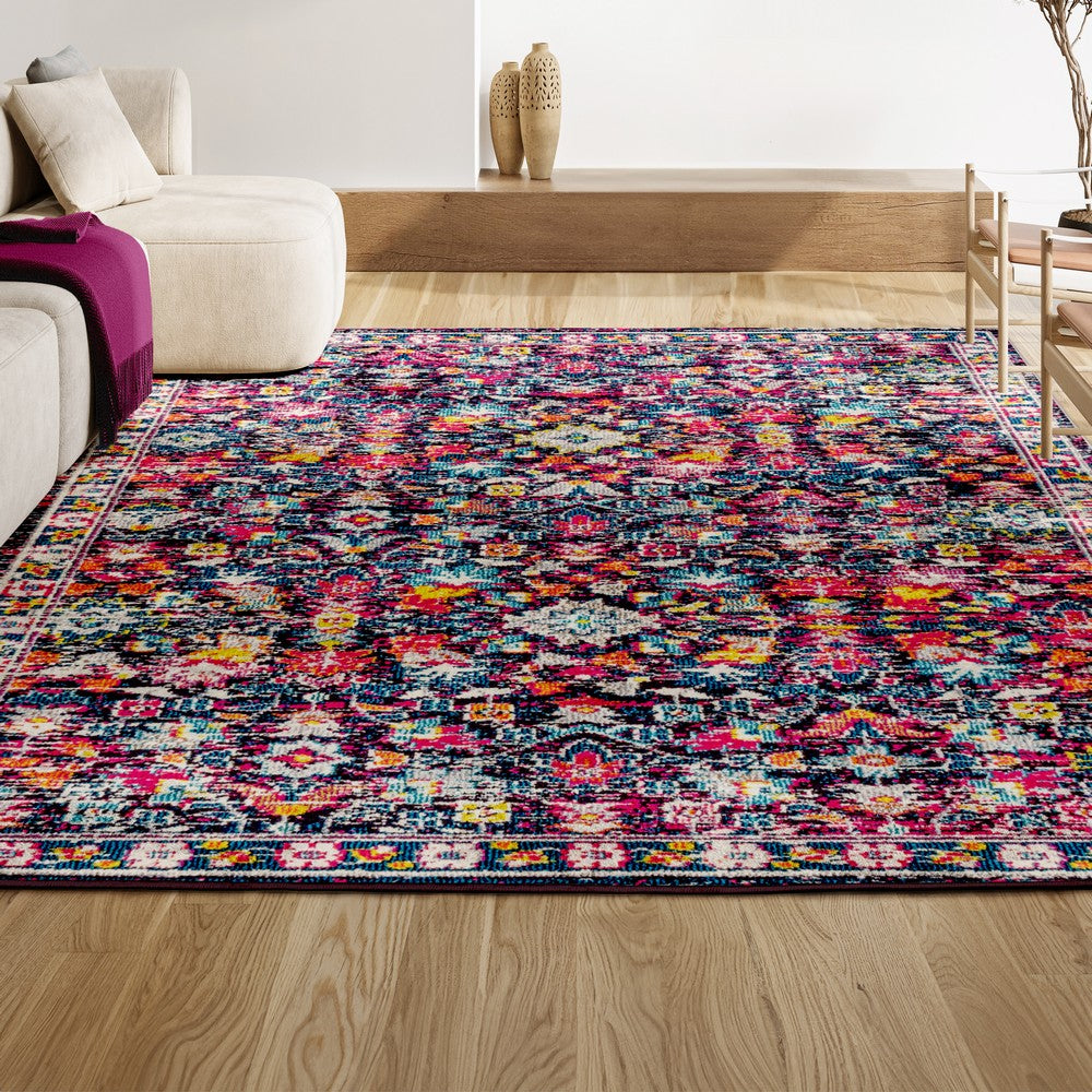 - Combining tones of navy, red, pink, yellow, aqua and ivory, this rug is a versatile addition to any color scheme