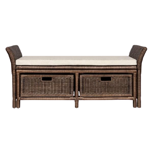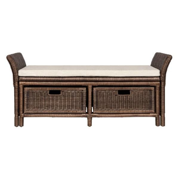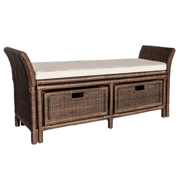 This classic rattan storage bench is perfectly sized for a queen or king-sized bed bench, or for the entry, master bath, or hallway. Two basket drawers add extra storage for linens, shoes or toys. A dark stain color gives the sturdy wicker and rattan construction a timeless, British Colonial look.