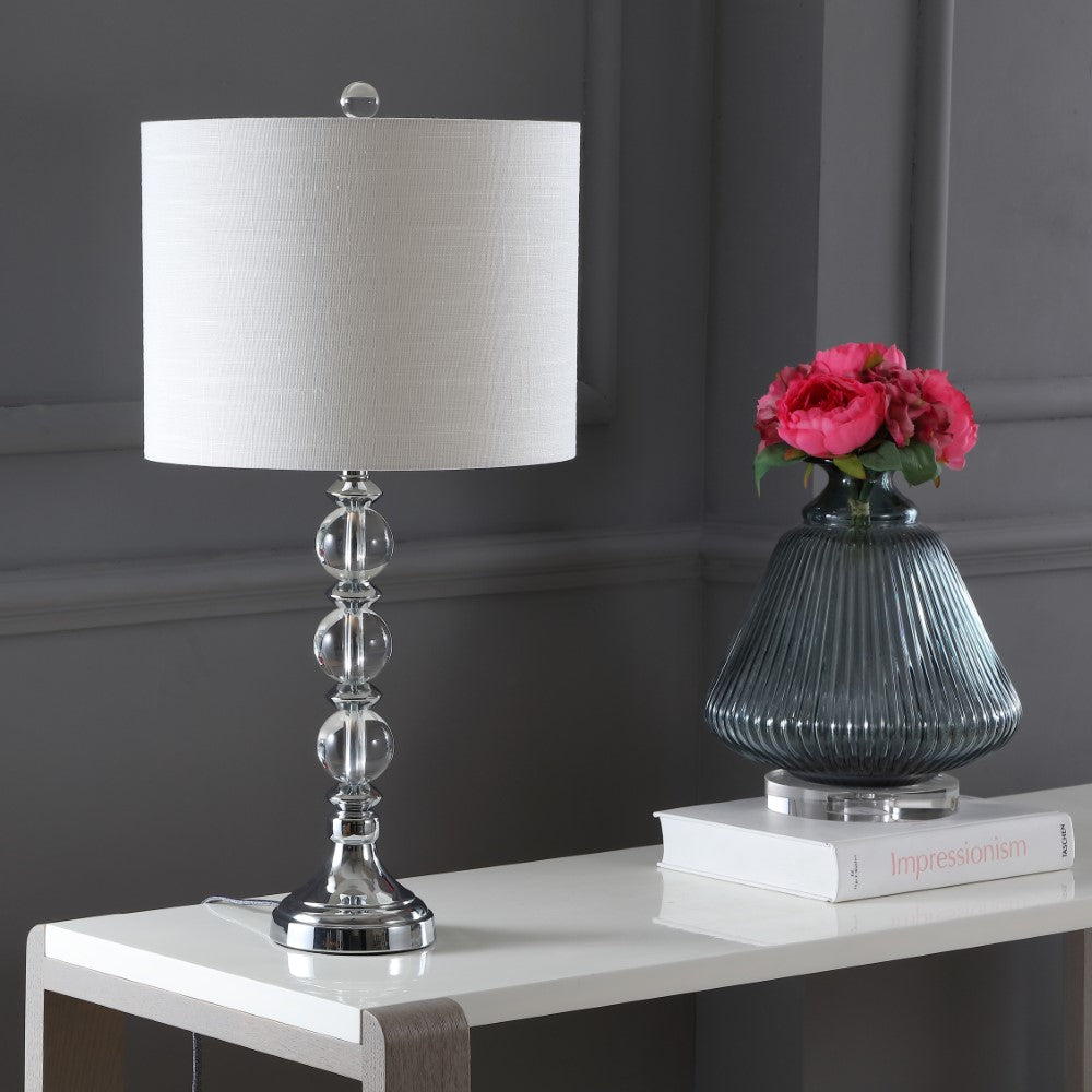 Make room for traditional elegance, as a column of crystal orbs and faceted gems stacks up and sparkles from every angle. The round base of our lamp continues the aesthetic while a slightly tapered linen shade enhances the light's reflection. Topped with a crystal finial and finished with a silk-wrapped 60' cord, this lamp will add traditional glamour to any home.