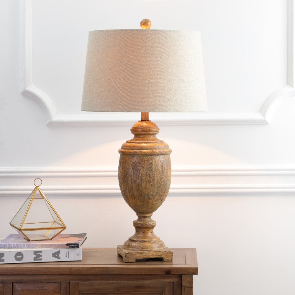 The antique urn shapes revered in Victorian times inspire this gorgeous faux bois lamp base. Taking a mold from these classics and reproducing it in resin gives us this gorgeous base, hand-finished to look like wood and topped with our signature linen drum shade. You’ll love the silk-wrapped cord, which is too beautiful to hide behind furniture!